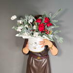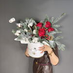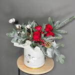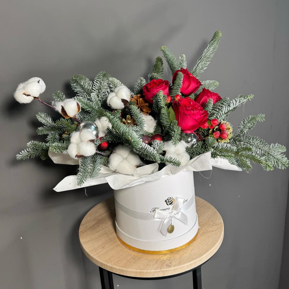 Гиперикум - 1 шт. Роза - 5 шт. Шишки - 4 шт. Оазис - 2 шт. Шляпная коробка - 1 шт. Нобилис - 1 шт. Елочные игрушки - 5 шт.