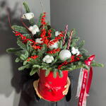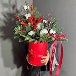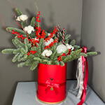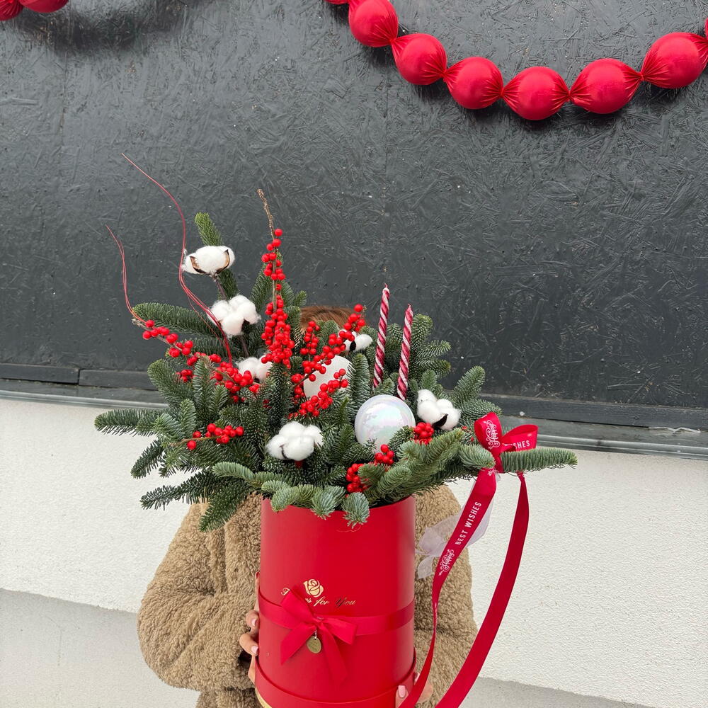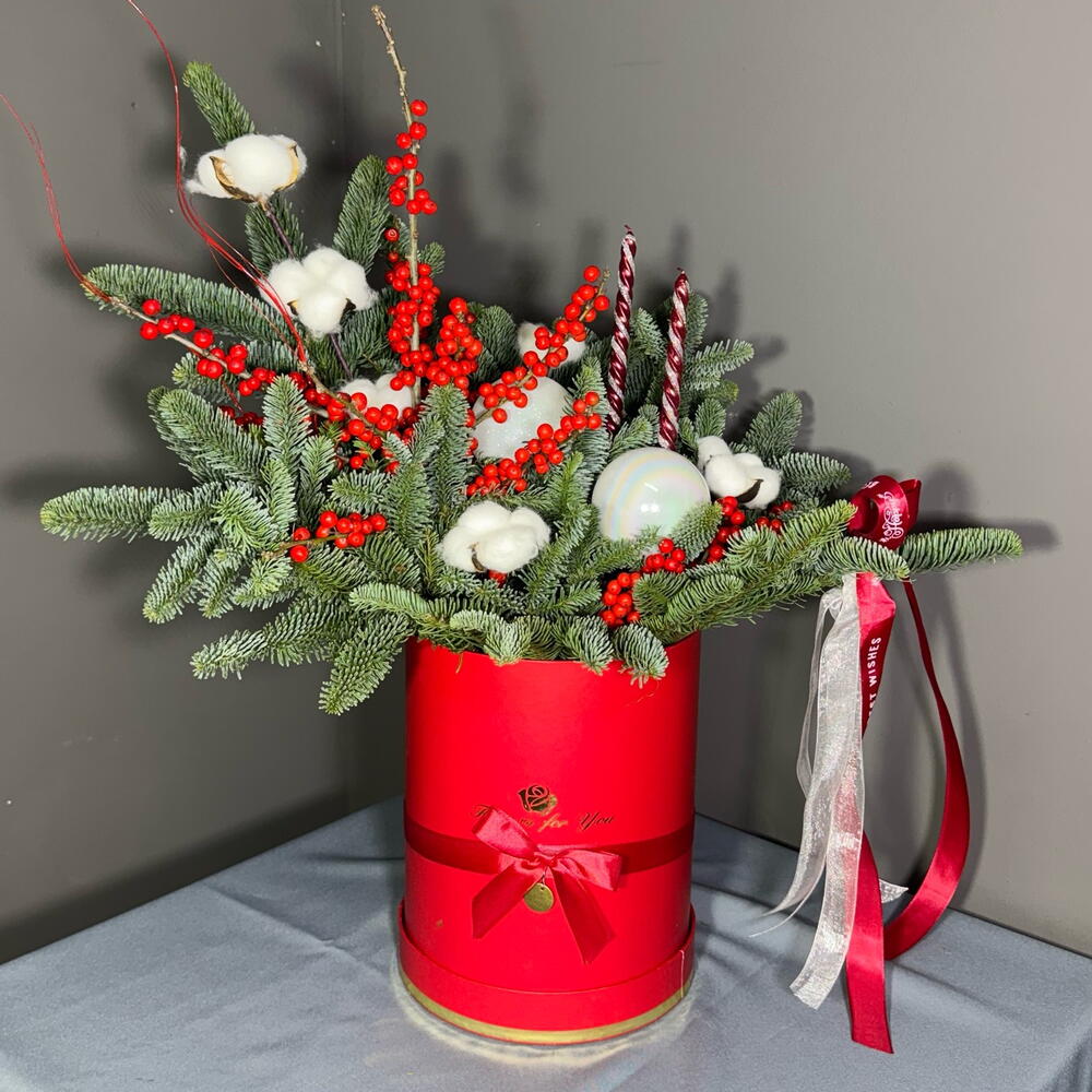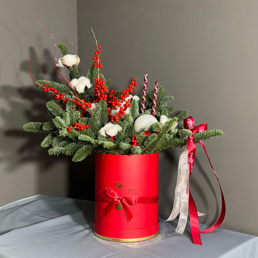 Хлопок - 6 шт. Лента атласная - 2 шт. Свеча - 2 шт. Коробка шляпная - 1 шт. Ветки - 2 шт. Илекс Красный - 1 шт. Нобилис - 2 шт. Игрушки елочные - 2 шт. Оазис флористический - 1 шт.