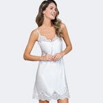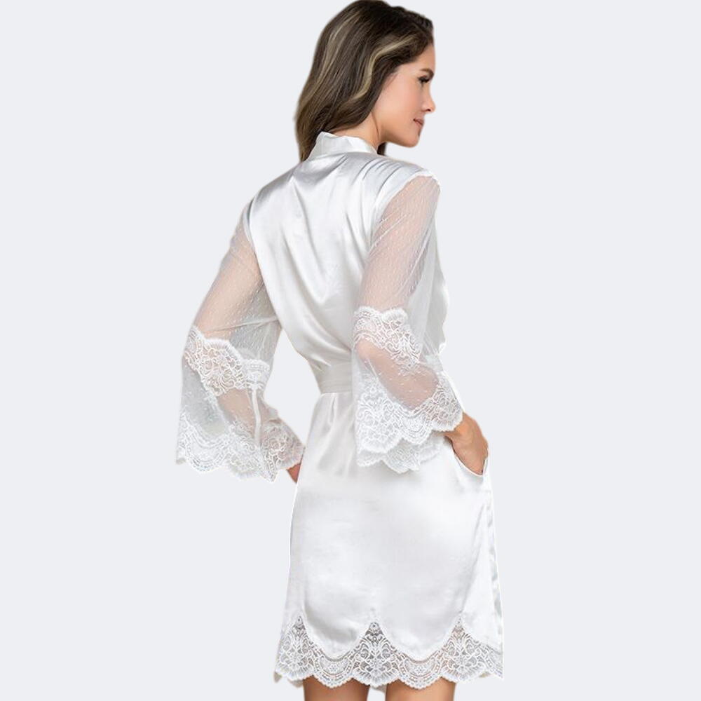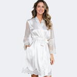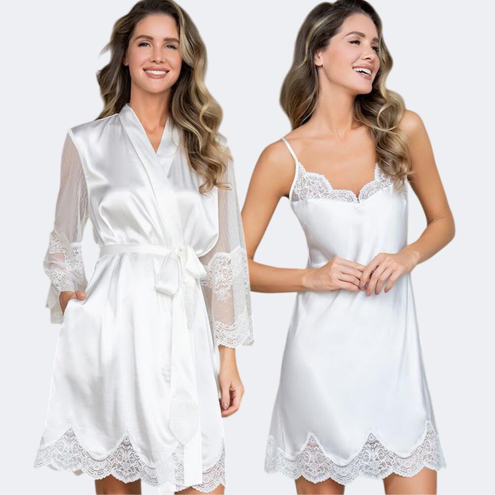 Нежный комплект, состоящий из короткого запашного халата с длинными полупрозрачными рукавами и короткой сорочки на тонких бретелях из однотонного смесового шелка декорированы ажурным кружевом. По бокам халата карманы. Декор сорочки-маленький атласный бантик с подвеской по центру выреза сорочки. Тонкая, гладкая, невероятно приятная к телу ткань. Комплект подойдет для подарка невесте.