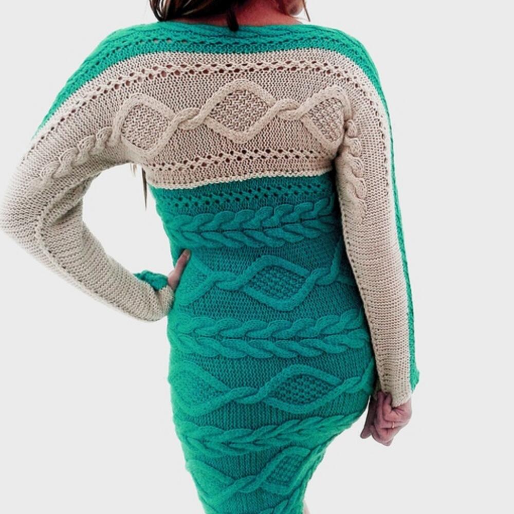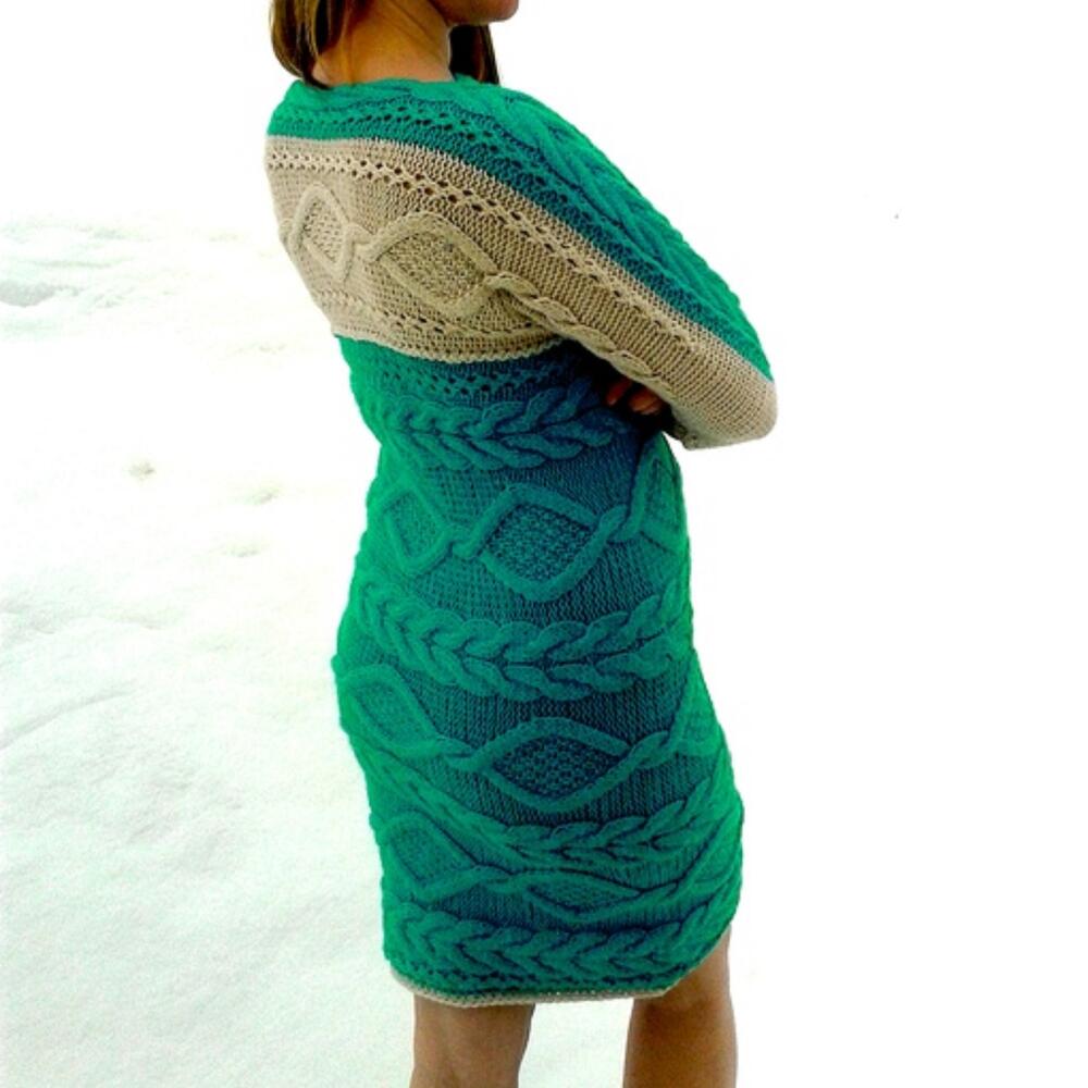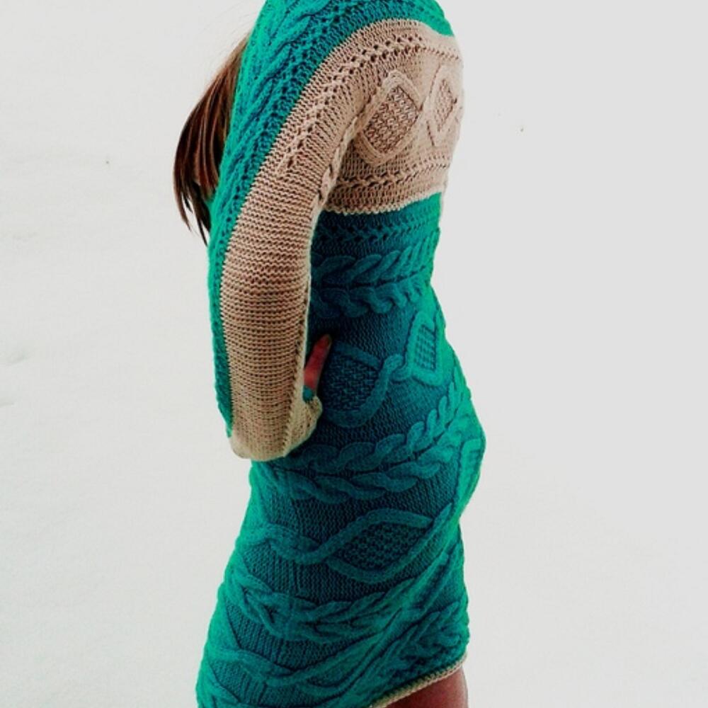 Платье вязаное Soft 46 размера Современные тенденции моды в одежде предлагают модницам самые неожиданные и удивительные новинки, которые они могут найти в новых и свежих дизайнах. Вязаные платья-свитера лучше носить с ботфортами или высокими сапогами и грубыми армейскими ботинками. Также платье до колен можно носить с ботильонами или полуботинками. Длина платья выше колен с рукавами полной длины. Платье выполнено из нежной полушерстяной пряжи 2 цветов: бирюзового цвета и молочного. Пряжа мягкая, не колется. Платье женственное, теплое. Рекомендации по уходу Ручная стирка при температуре не выше 40 С. Отжим без скручивания Сушить на горизонтальной поверхности.