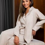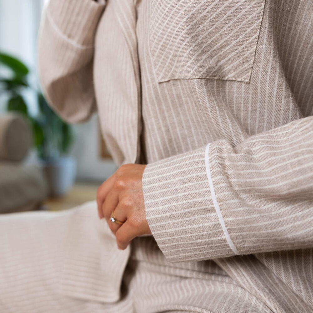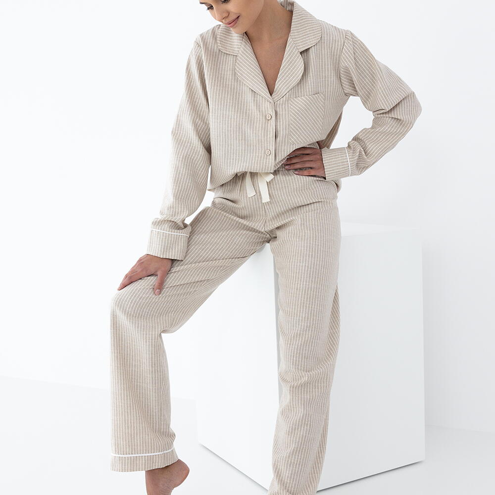 Хлопковая пижама состоит из свободной рубашки и брюк. Рубашка с фигурным воротом. Брюки прямого кроя и на широкой резинке. Идеальный вариант не только для сна, но и для домашнего отдыха.