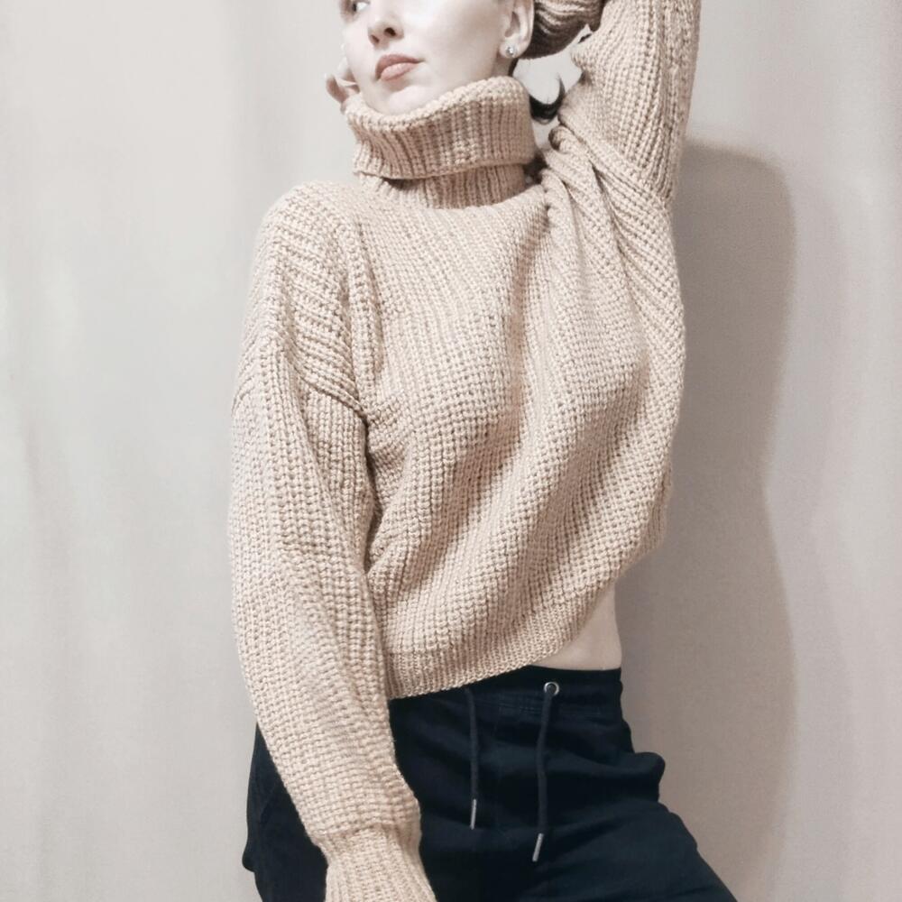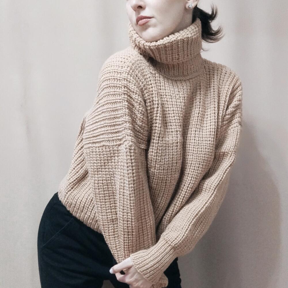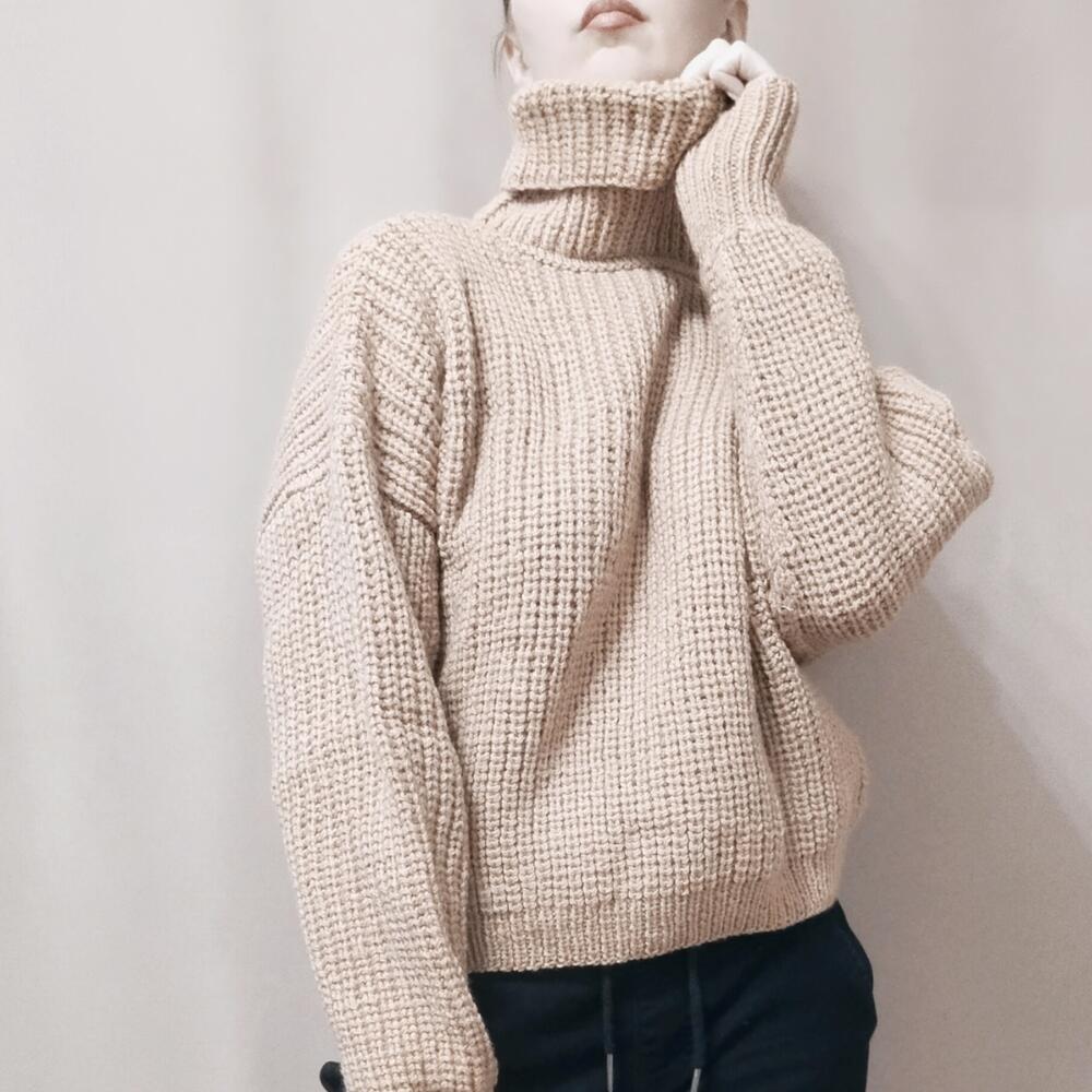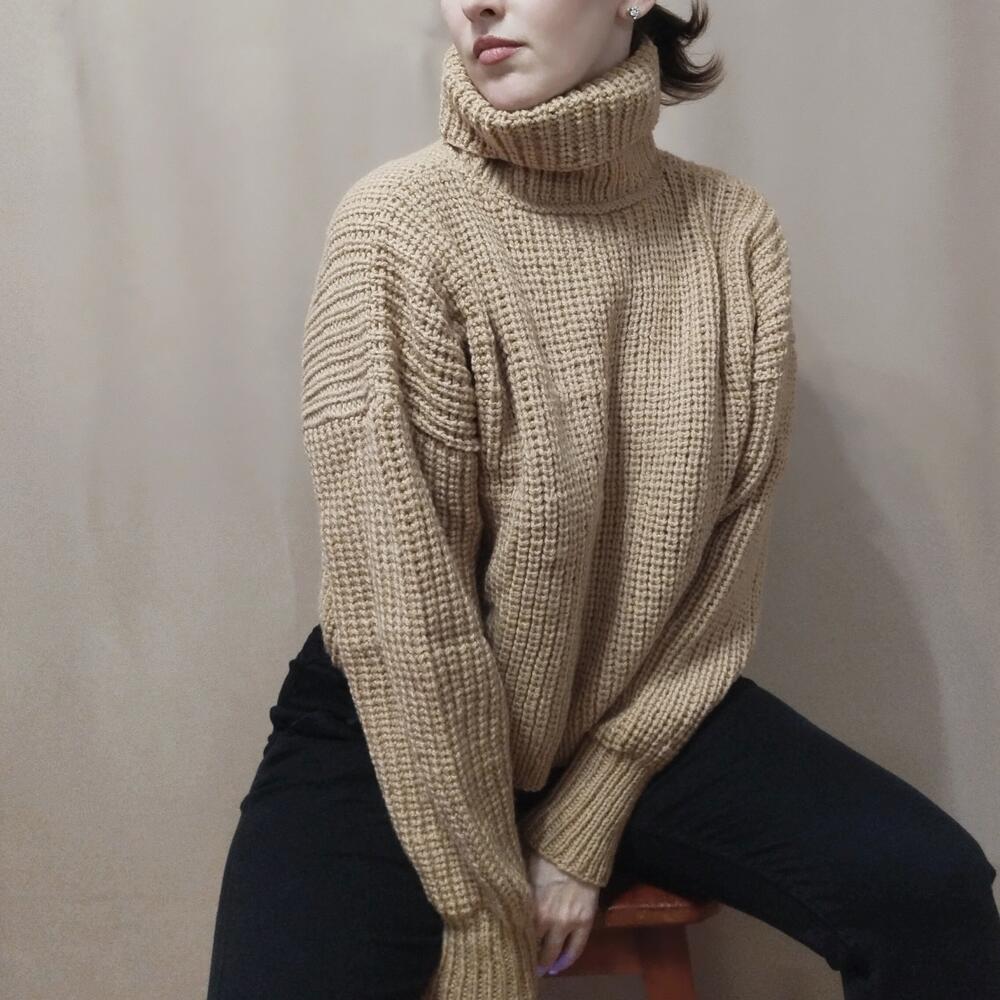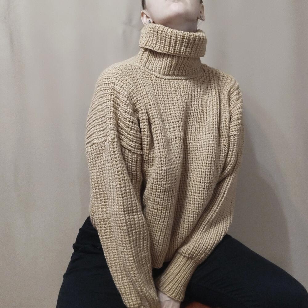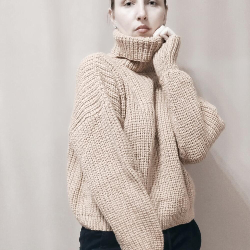 Свитер женский оверсайз Женский свитер,связан из мягкой и теплой пряжи песочного цвета. Состав 50% шерсть, 50% акрил. Согреет от холодных осенних ветров. Нежный и приятный к коже, с чуть заметным деликатным пушком. Женский свитер свободного силуэта, спущенный рукав. Воротник высокий и широкий. Свитер идеален для прогулок и путешествий. Станет любимцем в вашем гардеробе Длина по спинке 51 см, по переду 49см, ширина 65 см Длина рукава от горловины 77см