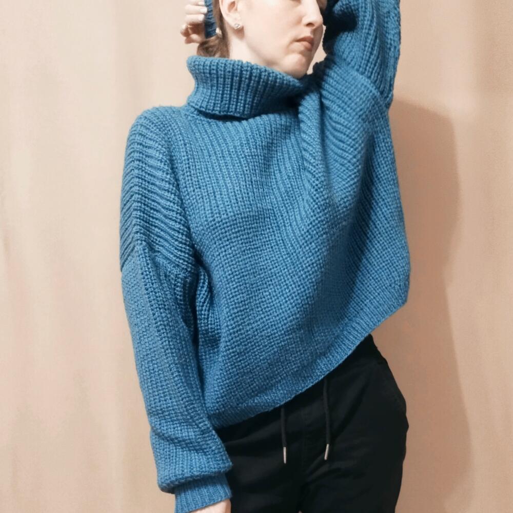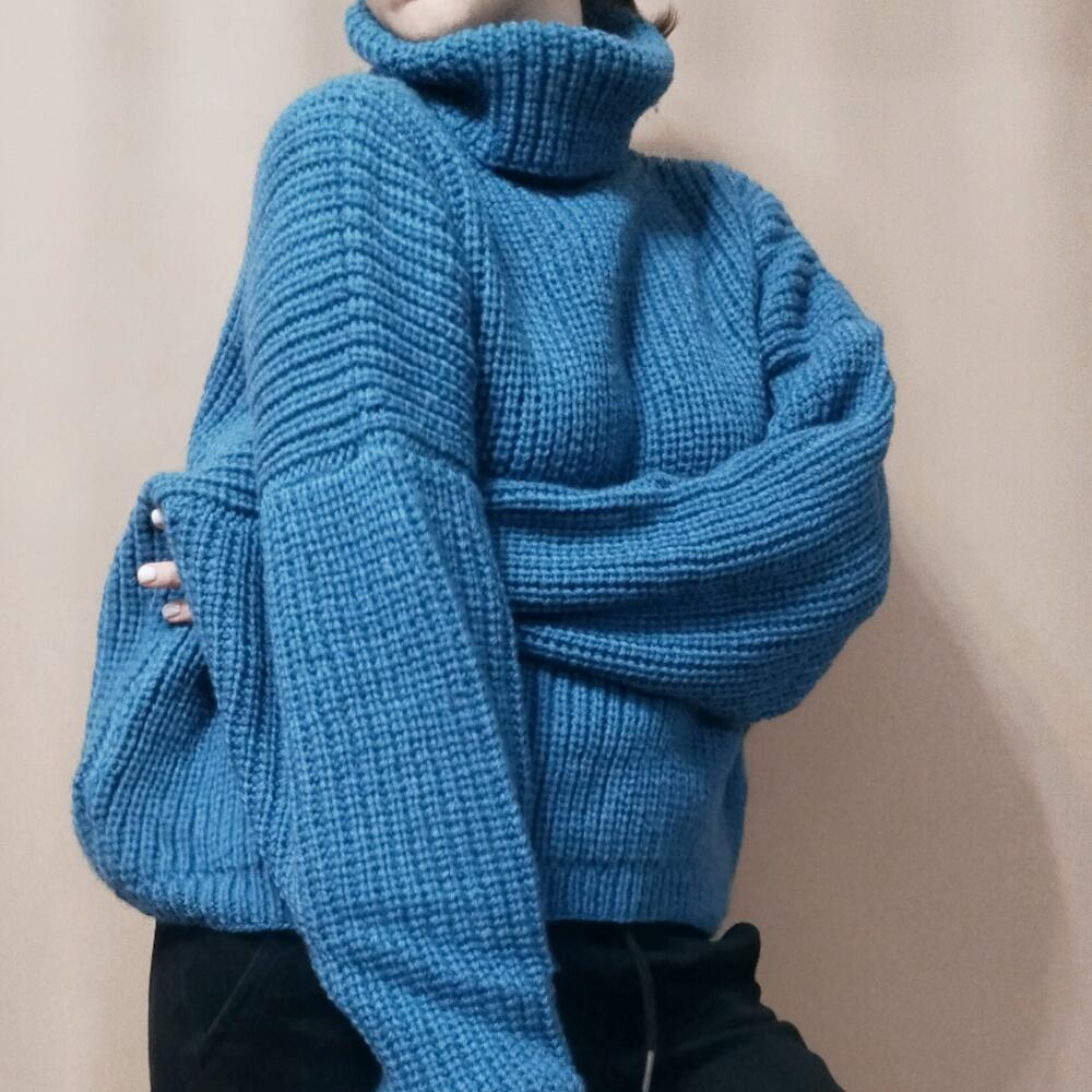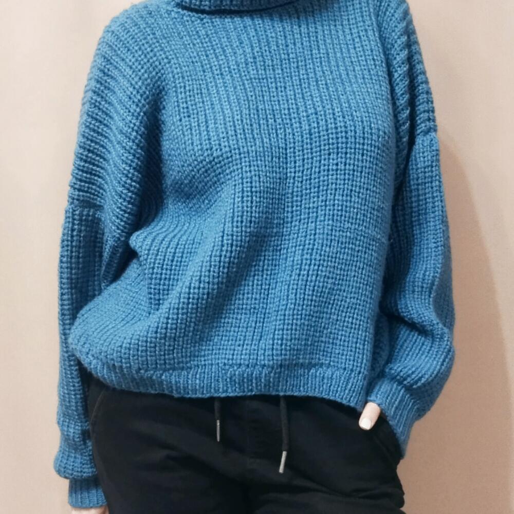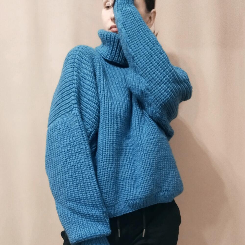 Свитер женский оверсайз Женский свитер,связан из мягкой и теплой пряжи синего цвета. Состав 50% шерсть, 50% акрил. Согреет от холодных осенних ветров. Нежный и приятный к коже, с чуть заметным деликатным пушком. Женский свитер свободного силуэта, спущенный рукав. Воротник высокий и широкий. Свитер идеален для прогулок и путешествий. Станет любимцем в вашем гардеробе Длина по спинке 52 см, по переду 48см, ширина 65 см Длина рукава от горловины 75см