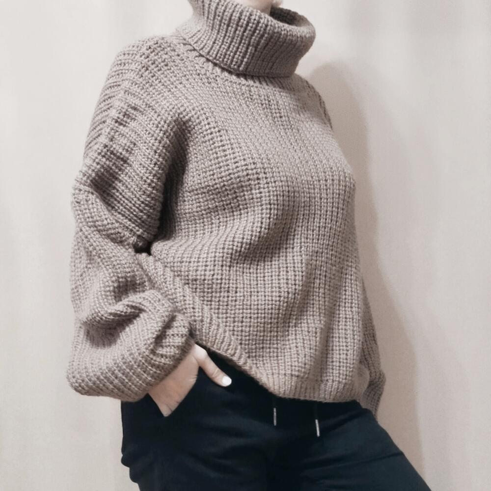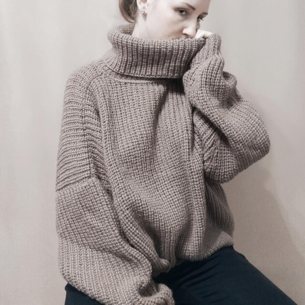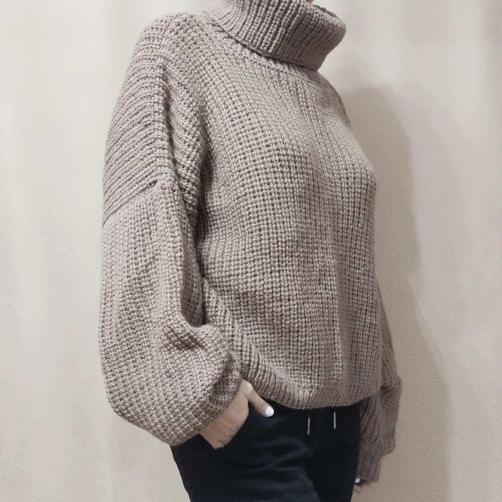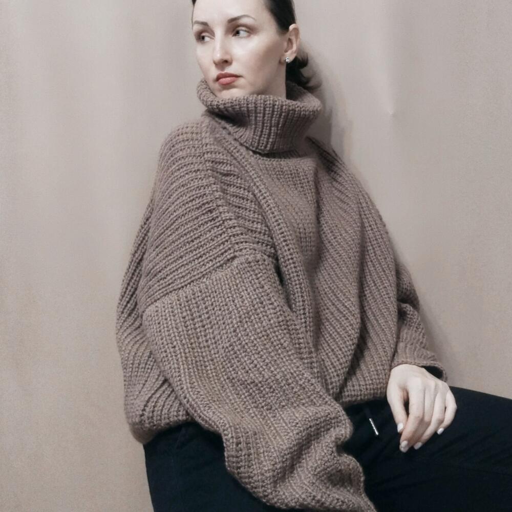Свитер женский оверсайз Женский свитер,связан из мягкой и теплой пряжи цвета какао. Состав 50% шерсть, 50% акрил. Согреет от холодных осенних ветров. Нежный и приятный к коже, с чуть заметным деликатным пушком. Женский свитер свободного силуэта, спущенный рукав. Воротник высокий и широкий. Свитер идеален для прогулок и путешествий. Станет любимцем в вашем гардеробе Длина 55 см, ширина 72 см Длина рукава от горловины 74см