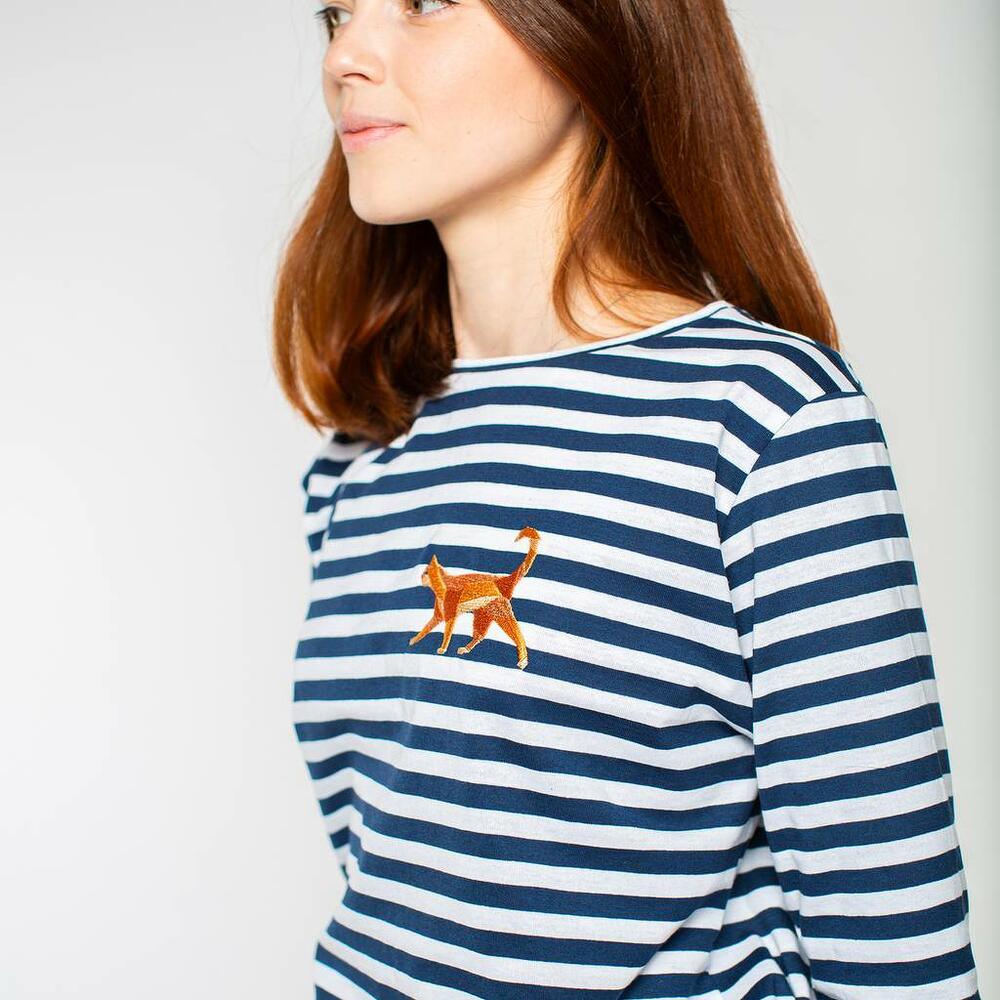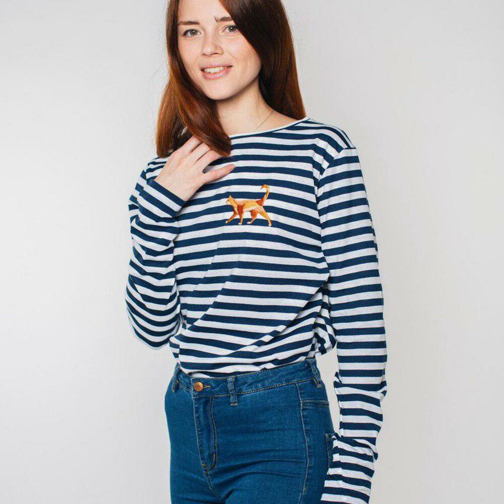 Тельняшка выполнена из бережного хлопка по принципу "полоска к полосочке". Прямой силуэт даёт возможность носить изделие как на высокой посадке, так и навыпуск, создавая классический образ для базового гардероба. Авторская вышивка смотрится ярко и гармонично на фоне сине-белых полосок морячки. Вышивка: Рыжий кот Материал: хлопок Для кого: Женщинам Доступные размеры: S, M, L, XL