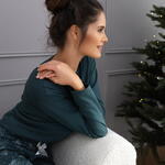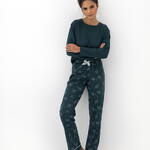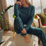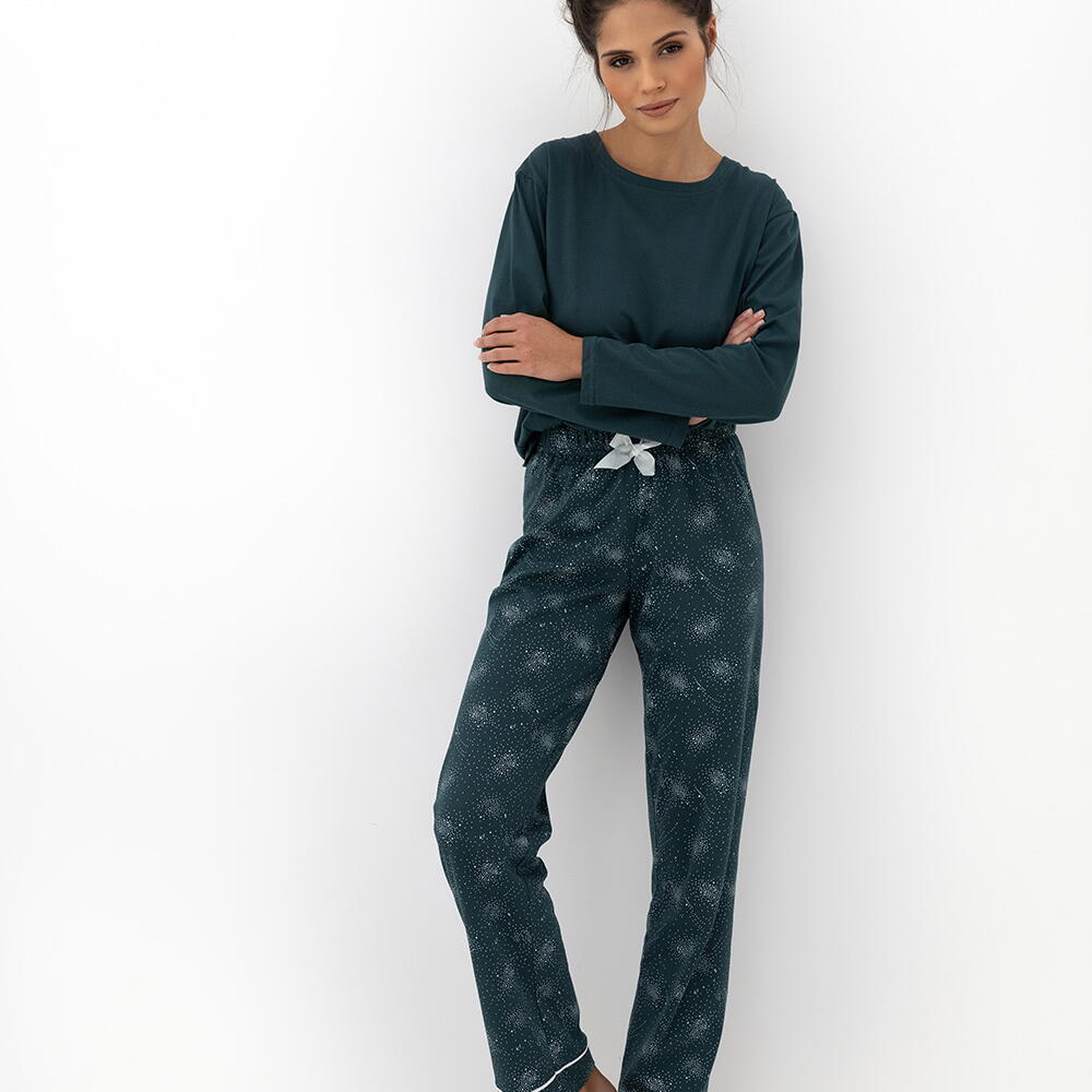 Повседневная пижама бутылочно-зеленого цвета состоит из однотонного лонгслива и принтованных прямых брюк. Вырез горловины круглый. Идеальный вариант не только для сна, но и для домашнего отдыха. Товар произведен в Европе!