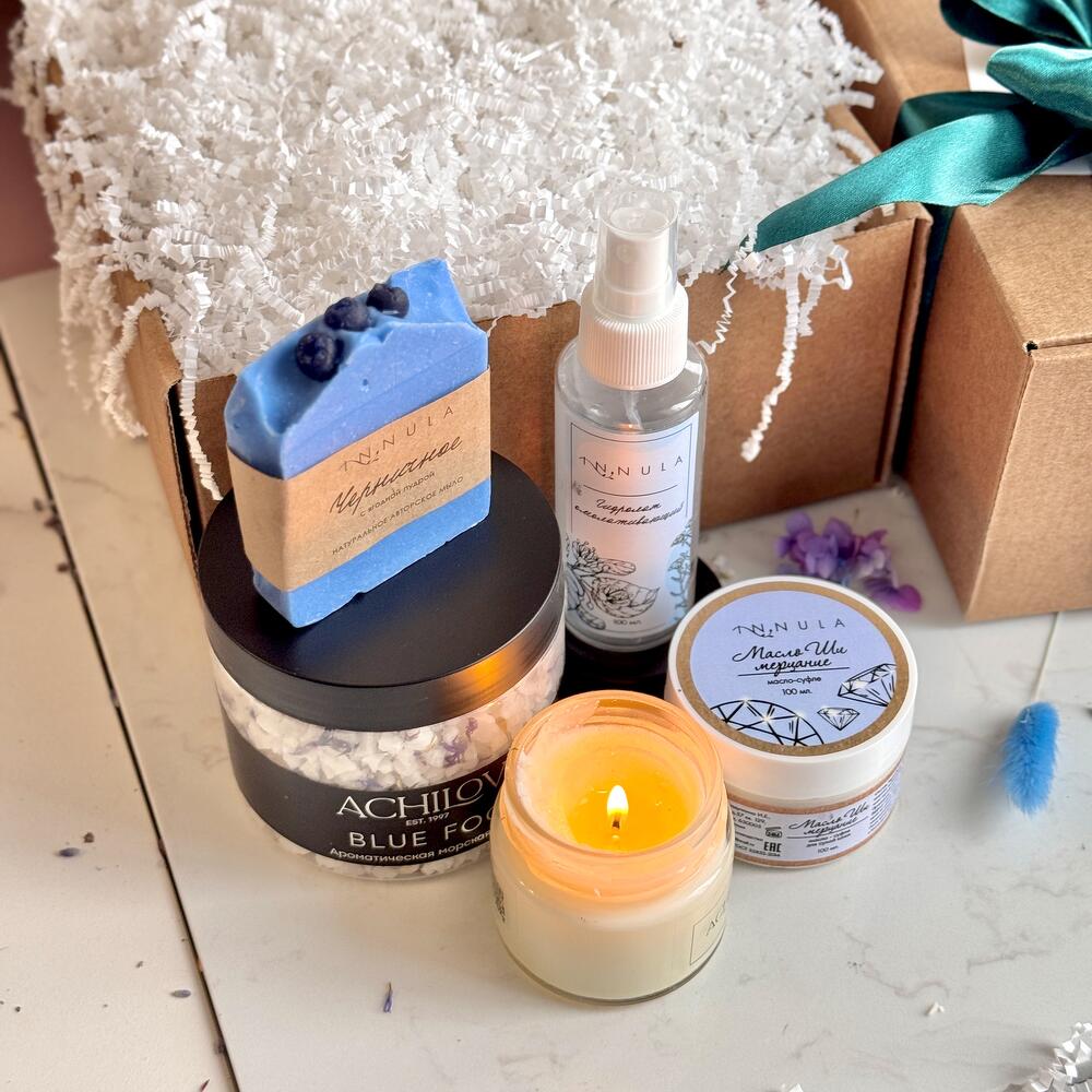 Подарите себе и своим близким изысканный набор косметики «Blue Elixir», который содержит все необходимое для создания расслабляющей и легкой атмосферы у вас дома. ✧ Ароматическая морская соль для ванны «Blue Fog», ACHILOV: наполните ванну успокаивающим ароматом моря и трав и погрузитесь в блаженство с нашей морской солью, обогащенной лепестками василька и яркой парфюмированной композицией. ✧ 100% Натуральное мыло INNULA с ценными маслами ши, кокоса и оливы образует нежную воздушную пену, которая мягко очищает кожу и легко смывается, даря ощущение комфорта и свежести. Бережный состав помогает сохранить естественную мягкость кожи и превращает ежедневное умывание в приятный SPA-уход. ✨🌿 ✧ Масло-суфле для тела, INNULA: легкое и тающее взбитое до состояния суфле масло ши увлажнит и напитает вашу кожу, а также подарит замечательный аромат на коже. ✧ Ароматическая свеча ACHILOV: создайте уютную и расслабляющую атмосферу с нашей ароматической свечой. Смеси терпких и сладких ароматов создадут теплую и приглашающую обстановку. Время горения свечи: 12 часов. ✧ Гидролат для лица и тела «Омолаживающий», INNULA: содержащиеся в составе гидролаты липы и бессмертника мгновенно освежат, увлажнят и тонизируют вашу кожу. Идеален для ежедневного применения. Рекомендуем отдельно приобрести открытку, на которой вы сможете написать теплые слова любви и заботы, чтобы сделать подарок еще более особенным. Вы могли искать: подарок на день матери, в подарок, ко дню матери, бьюти-бокс, что подарить, подарок женщине, подарок маме, подарок матери, подарочный набор, подарок девушке, женский подарок, подарок любимой, подарок жене, красивый подарок, подарки на праздники, повышение по службе, подарок врачу, подарок директору, корпоративные подарки, подарок няне, подарок для девочки, подарок воспитателю, подарочный бокс.