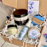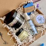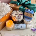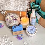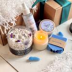 СОСТАВ: ароматическая морская соль для ванны «Blue Fog» (400 г), натуральное мыло Черничное с ягодной пудрой (85 г +/-) ИЛИ натуральное мыло Лаванда с эфирным маслом лаванды (85 г +/-), масло-суфле для тела «Масло Ши мерцание» (100 мл) ИЛИ универсальное масло для тела Масло Ши с лавандой (100 мл), ароматическая свеча Кедр и Инжир (100 мл) или Ароматическая свеча Ягодный пунш (100 мл), шт, гидролат для лица и тела «Омолаживающий» (100 мл).