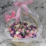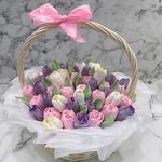 Оригинальная эффектная стильная объемная корзина с белыми, сиреневыми и розовыми зефирными ТЮЛЬПАНАМИ - сладкое, воздушное удовольствие на все случаи жизни! Диаметр корзины 25 см. Сама композиция больше диаметром! Корзина подарочно упакована в прозрачную слюду, сверху с бантом и открыткой! Композиция в корзине из зефира – это очаровательная идея подарка, объединяющая в себе нежность цветов и сладость десерта! При формировании композиции расположение зефирных цветов в может быть другим! Сами цветы и цветовая гамма будут такие как в букете на фото! Цвет корзины может быть другой! Зефир полностью ручной работы, количество цветов может меняться +/-2 шт! Букет прекрасно подойдет для подарка на Свадьбу, Юбилей, День рождения, Директору, Учителю, Любимой, Маме, Врачу, Бабушке, Руководителю, на Выпускной, Последний звонок… Состав зефира: фруктовое (ягодное) пюре, сахар, яичный белок, вода, агар-агар (вещество растительного происхождения получаемое из водорослей), пищевой краситель. Шикарная объемная корзина с зефирными Тюльпанами, диаметром 25 см! На Свадьбу, Юбилей, День рождения, Бабушке, Любимой, Маме