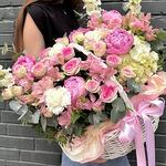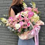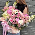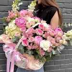 Корзина с пион розами, гортензией, маттиолой, альстромерией