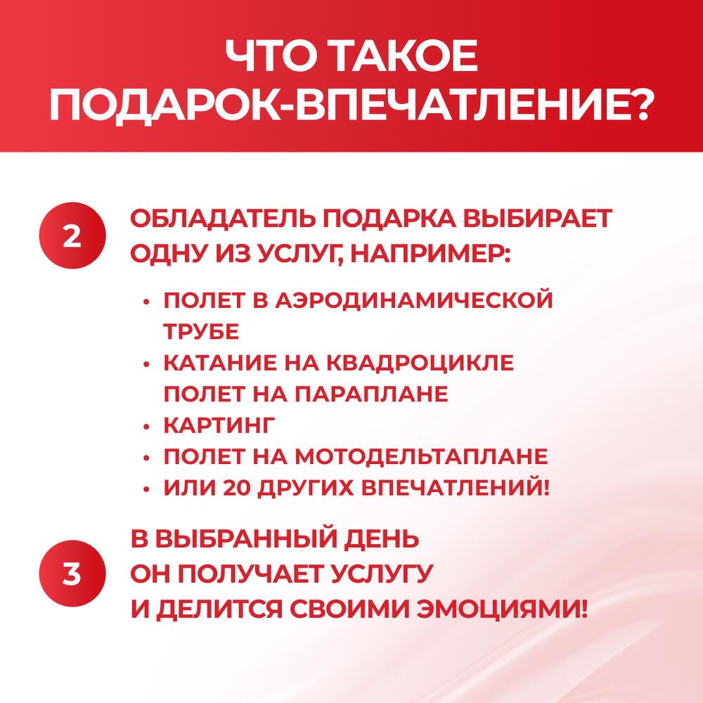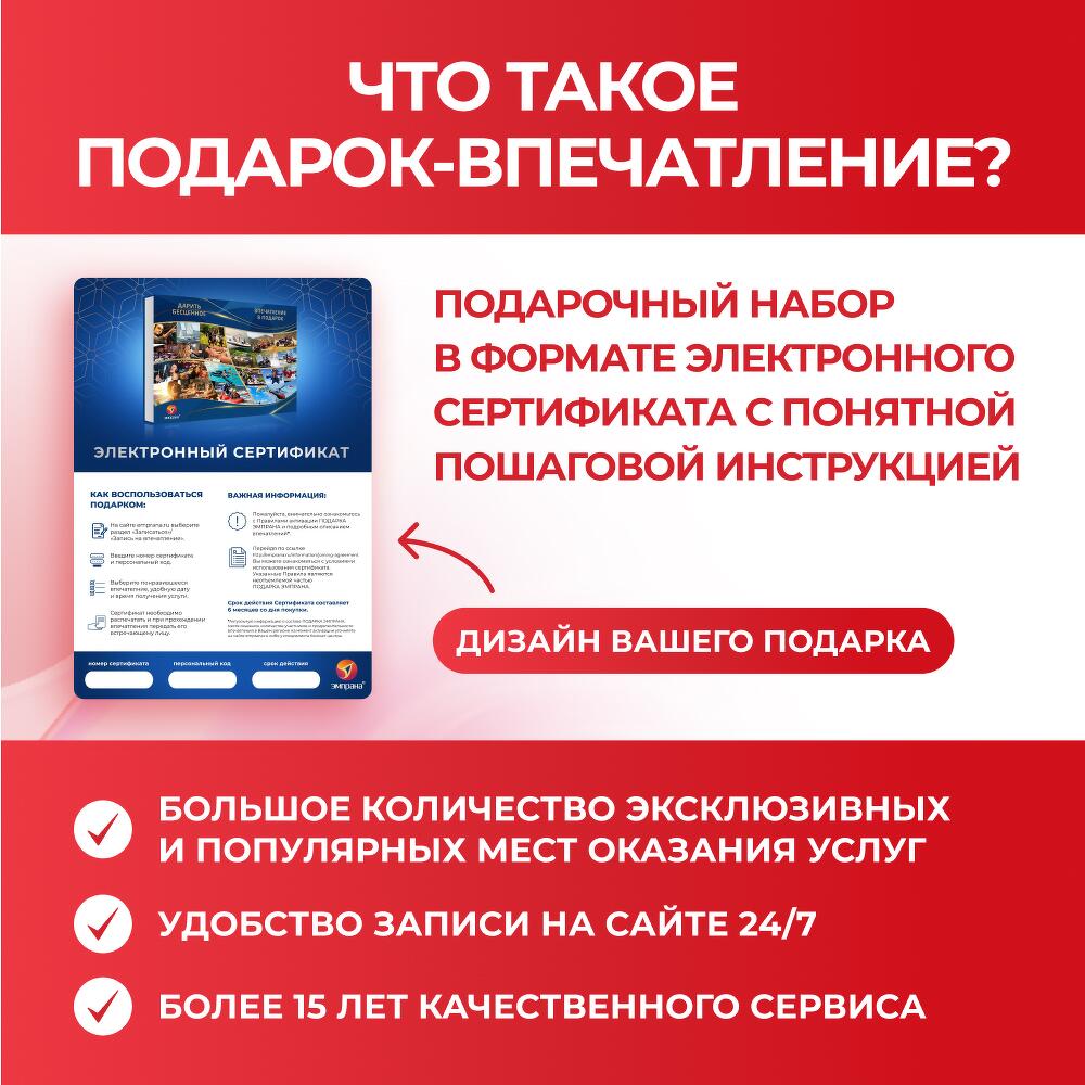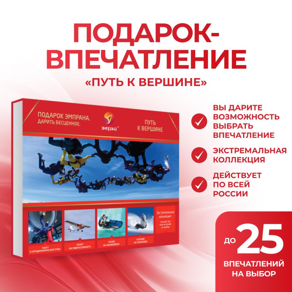 Вы приобретаете электронный сертификат с отправкой на указанную Вами электронную почту. Пожалуйста, укажите e-mail в комментарии при оформлении заказа. Экстремальная коллекция. Подарок-впечатление «Путь к вершине». Подарок-впечатление содержит следующие услуги на выбор: Полет на микросамолете Полет в аэродинамической трубе Катание на квадроцикле Полет на параплане Картинг Полет на мотодельтаплане Скалолазание Гонки на аквабайках Стрельба Искусственная волна Полет на паратрайке Дайвинг Катание на катере Вейкбординг Мастер-класс по экстремальному вождению мотоцикла Катание на водных лыжах Искусственная горка и виртуальный слалом Багги-кросс Пейнтбол Стрельба из боевого оружия Катание на кроссовом мотоцикле Рафтинг Катание на собачьих упряжках Катание на сноуборде Катание на снегоходе Катание на горных лыжах Мастер-класс по сноукайтингу