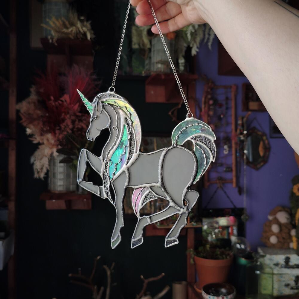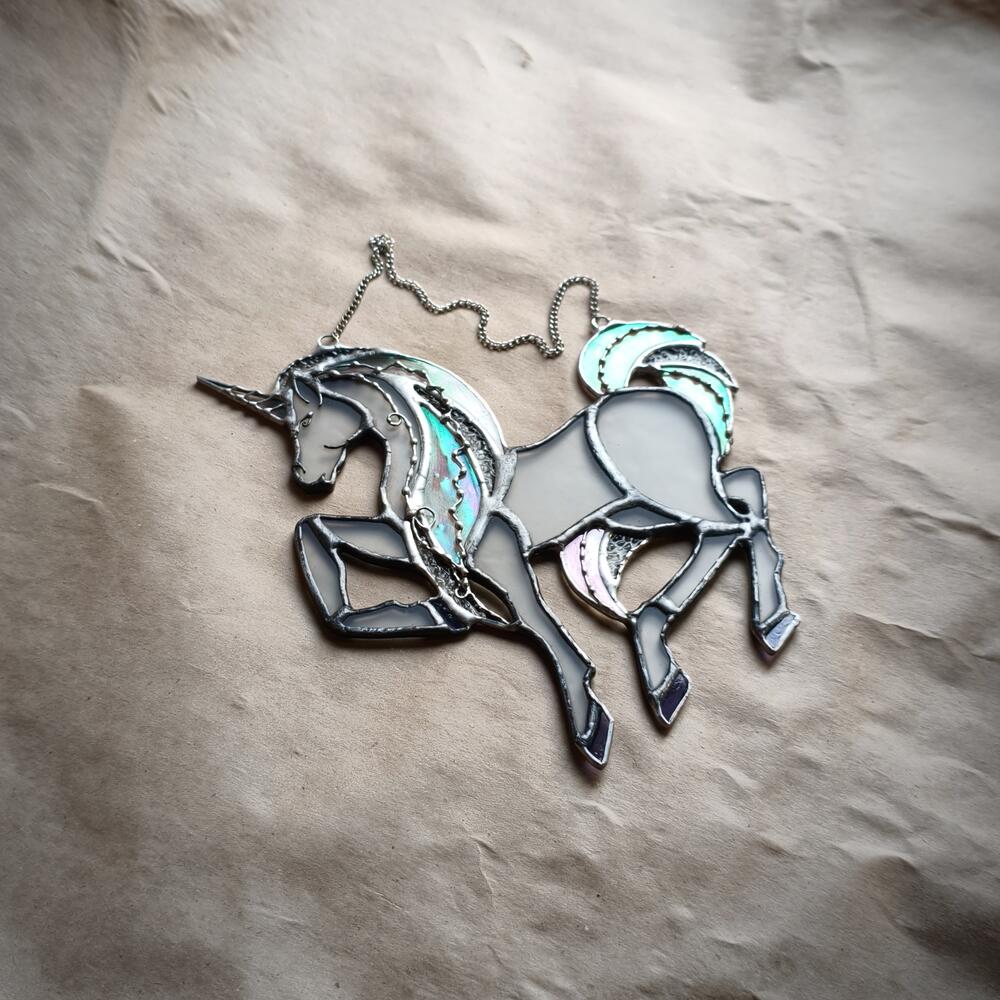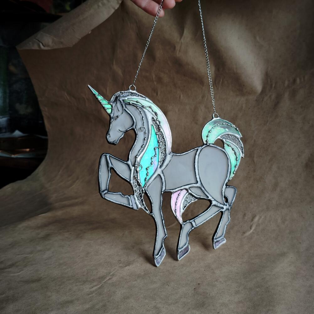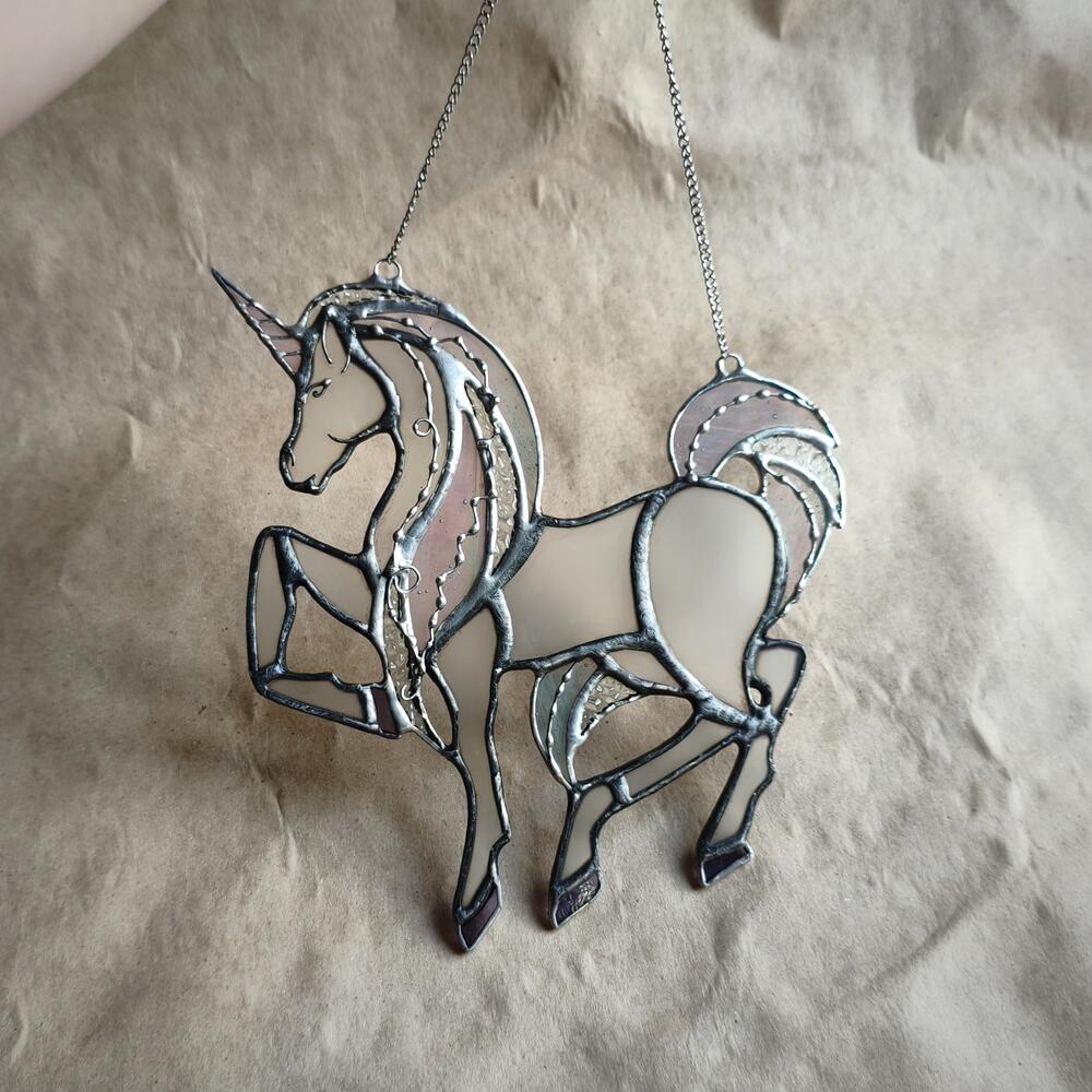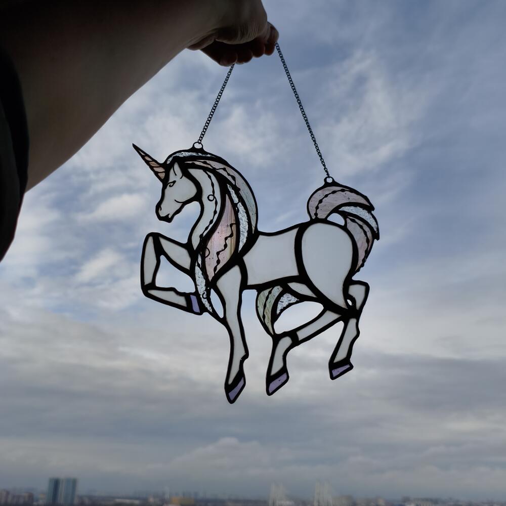 Витраж ручной работы в технике Тиффани в виде единорога🦄 Тело из матового стекла, грива, рог, хвост - из витражного перламутрового, которое очень красиво переливается 💎 Размер примерно 21×19 см Единорог украсит стену, либо окно, станет необычным элементом декора. Также это изделие может быть оригинальным и волшебным подарком человеку💜