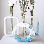 Трио ваз созданы из белого бетона и подчеркнуты вкраплениями голубых кристаллов. Внутри каждой вазы есть отверстие под пластиковую колбу. Вазы очень устойчивы за счет материала из которого они изготовлены. Набор ваз идеально подойдет для создания композиций из сухоцветов или живых цветов. Сухоцветы в набор не входят.