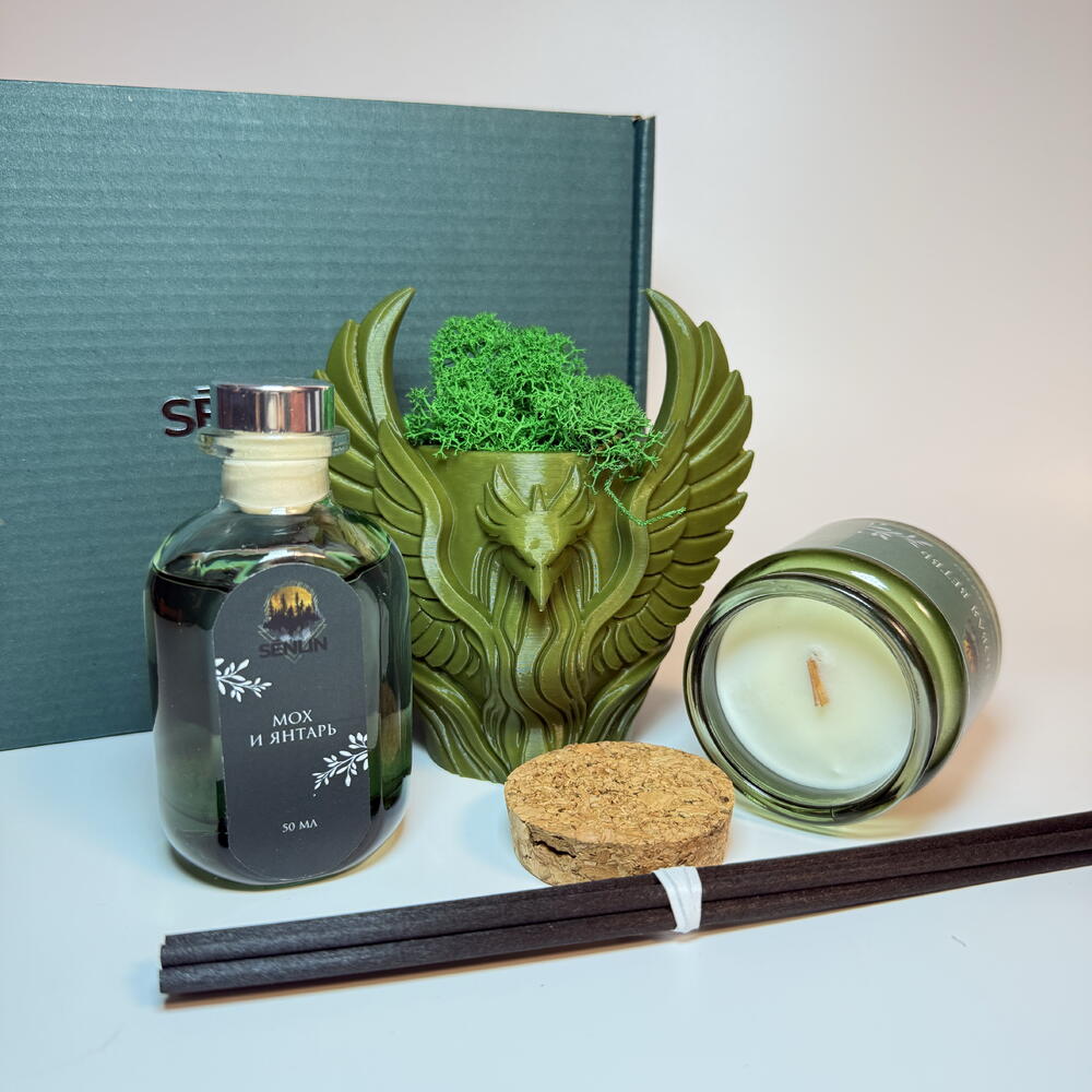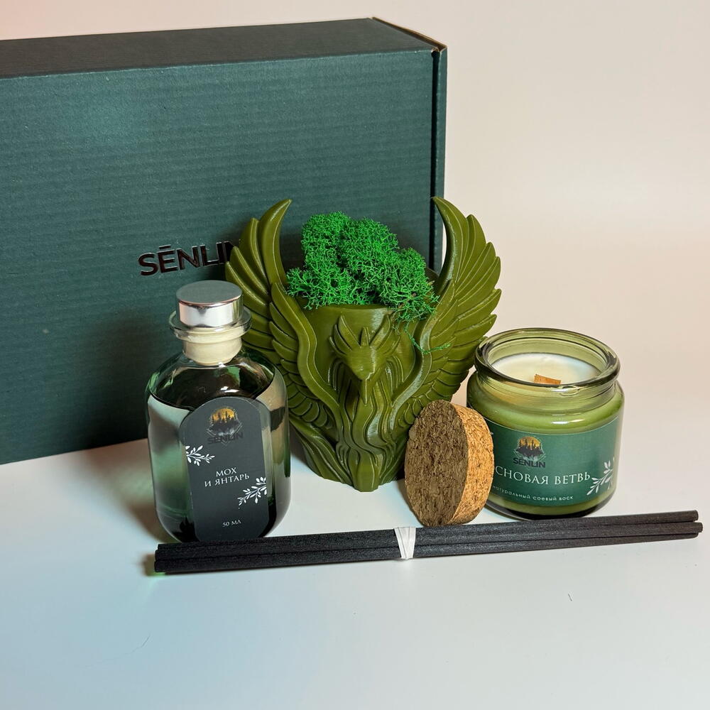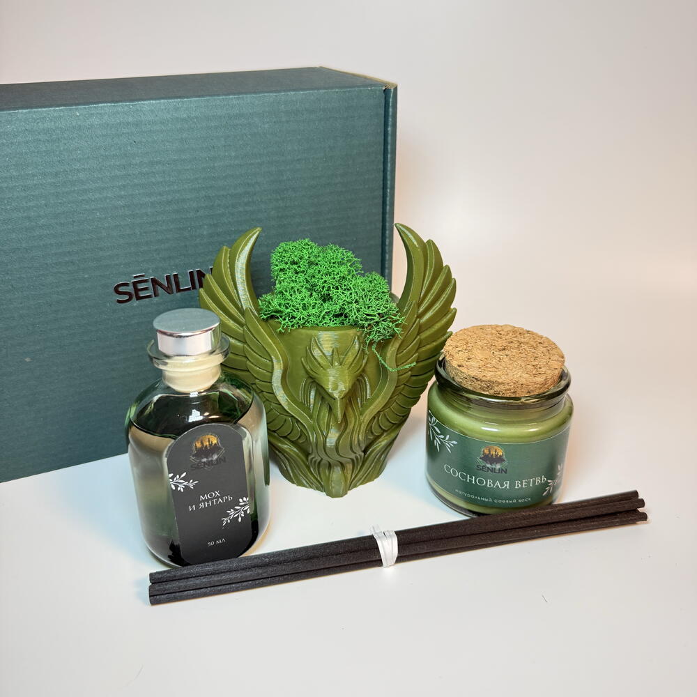 Бокс «Тайна хвойного леса» — это изысканный набор, наполненный ароматами и образами загадочного леса. В состав входит: Свеча 100 мл с ароматом «Сосновая ветвь» (Пихта Фрейзера) — насыщенный хвойный аромат, вызывающий ощущение прогулки по лесу в тени пихтовых деревьев. Время горения — около 20–25 часов, что позволяет наслаждаться нежным ароматом долгое время и погрузиться в атмосферу спокойствия и уединения. Диффузор 50 мл с ароматом «Мох и янтарь» — мелодичный и расслабляющий аромат, создающий ощущение легкости и гармонии, словно лесные ветра перекликаются в тишине. Фигурка-кашпо, выполненная на 3D-принтере — в ней закреплен стабилизированный мох, что добавляет природного уединения и таинственности. Фигурка в виде птицы-феникса — символа возрождения, силы и магии, — идеально подходит в качестве подарка и станет уникальным украшением интерьера, создавая особое ощущение лесной магии.