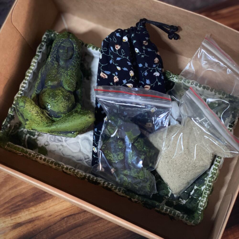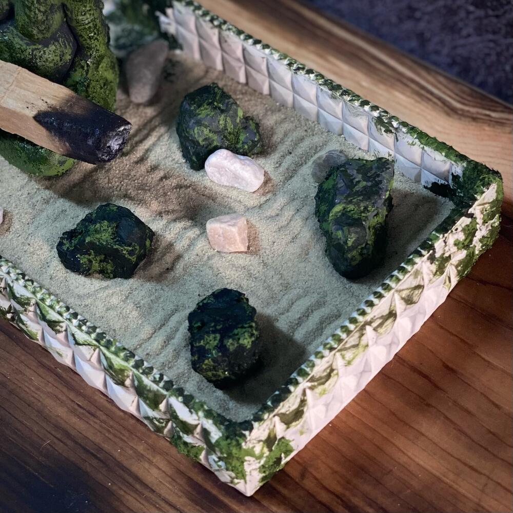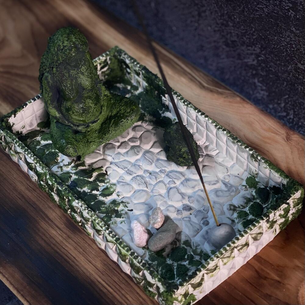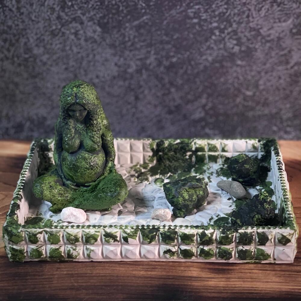 🌿 Сад камней Богиня Земли Гайя | дзен-набор для медитации и осознанного декора ✨ Уникальный сад камней с эффектом мха - это полноценный антистресс-набор для дома и рабочего пространства. В центре композиции Богиня Земли Гайя (Гея), которая олицетворяет плодородие, материнство и силу природы. Она Мать Земля, хранительница древней мудрости и баланса, символ женского начала и внутренней опоры. 🌏 Сад камней создан по мотивам традиционного японского дзен-сада. В его основе стоит простота, асимметрия и естественность. Миниатюрный японский сад камней помогает замедлиться, восстановить баланс Инь и Ян, снизить стресс и привести мысли в порядок. Это осознанный декор для дома, который работает глубже, чем просто украшение. 🪨 Набор можно использовать как сад камней антистресс (рисование узоров на песке); как подставку для санто пало или свечей; как поднос для украшений (без засыпания песка); как алтарный декор или элемент пространства для медитации; как стильный интерьерный акцент. 🎁 Идеальный подарок для подруги, девушки, коллеги, преподавателя или учителя. Подойдёт тем, кто увлекается медитацией, йогой, эзотерикой и практиками осознанности. Отличный вариант подарочного набора для женщины, которая ценит символизм, природу и гармонию в доме. Комплектация: 1. Статуэтка (6×5,5×8,5 см); 2. Поднос (18×10×2 см); 3. Камни из гипса с эффектом мха; 4. Песок мелкий ~60 г; 5. Камни натуральные ~30 г; 6. Санто пало; 7. Инструкция; 8. Подарочная упаковка (крафт-коробка + защитная упаковка + крафт-пакет); 9. Бонус ✨ ⚠️ Мох укладывается вручную, поэтому его расположение может незначительно отличаться - каждое изделие уникально. ⚠️ В изделиях из гипса возможны небольшие пузырьки - это естественная фактура материала.