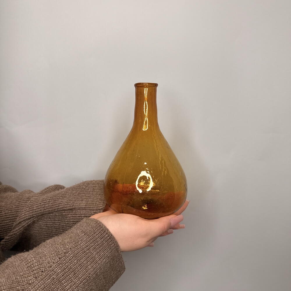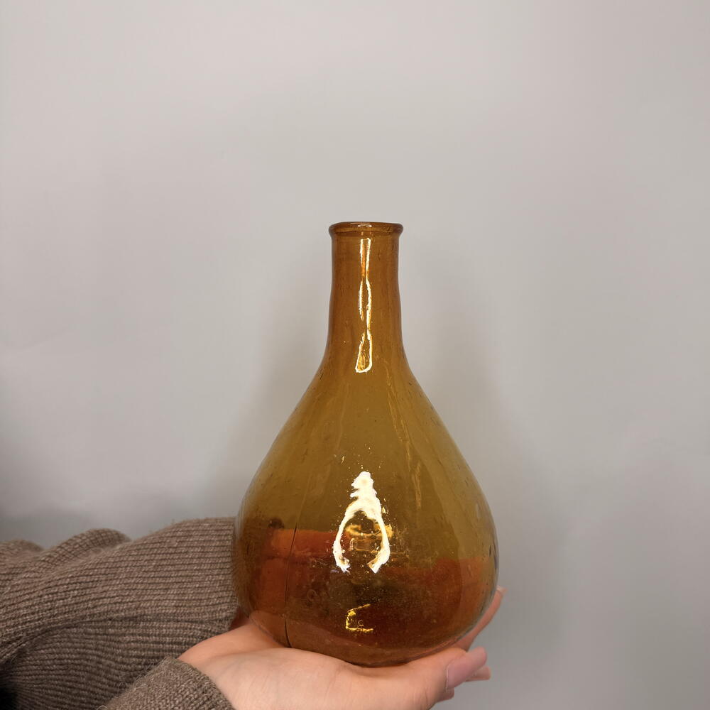 Выдувная Ваза-Бутыль (Коричневый оттенок) Общая характеристика: Этот предмет представляет собой сосуд, изготовленный методом ручного выдувания стекла, что придает ему уникальную, неповторимую форму и текстуру. Его насыщенный коричневый цвет напоминает цвет темного янтаря, старого дуба или крепкого чая, что придает изделию ощущение тепла и винтажности. Форма и Силуэт: Ваза имеет выраженный силуэт бутыли. Она характеризуется крупным, массивным основанием, которое плавно сужается к горлышку. • Тело: Объемное, округлое или слегка приплюснутое, что характерно для традиционных бутылей. Благодаря ручному выдуванию, поверхность может иметь легкие неровности, волнистости или небольшие пузырьки (энклавы), которые служат подписью мастера и подчеркивают его работу. • Горлышко: Узкое или средней ширины, часто имеет слегка неровный, скошенный или закругленный край, образованный при обрезке и обработке горячего стекла. Цвет и Светопроницаемость: Цвет — глубокий, дымчато-коричневый. В зависимости от толщины стекла и освещения, оттенок может варьироваться от полупрозрачного медового до почти непроницаемого, черновато-коричневого. При попадании света, стекло демонстрирует красивые переливы и глубину, подчеркивая внутреннюю структуру пузырьков и следы инструмента. Техника Исполнения: Изделие выполнено в технике выдувания стекла (свободное выдувание или использование примитивных форм). Отсутствие идеальной симметрии и наличие характерных следов стеклодувной трубки (иногда видимых у основания или горлышка) свидетельствуют о ручной работе, а не о серийном заводском производстве. Функциональное и Декоративное Назначение: Благодаря своей прочной конструкции и выразительному цвету, ваза-бутыль может использоваться как самостоятельный декоративный элемент, привлекающий внимание своей фактурой. Она также идеально подходит для размещения в ней высоких, одиночных стеблей или для хранения жидкостей, требующих защиты от прямого света (например, масел или настоек).