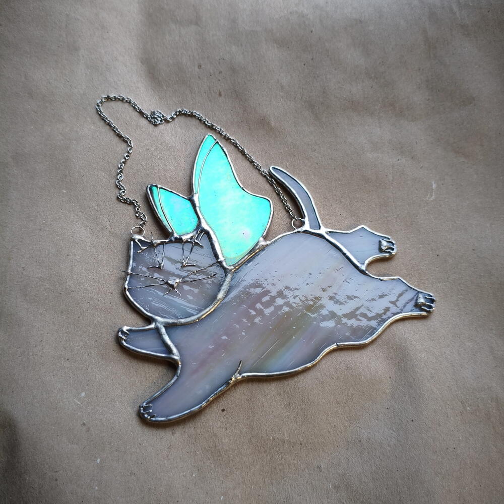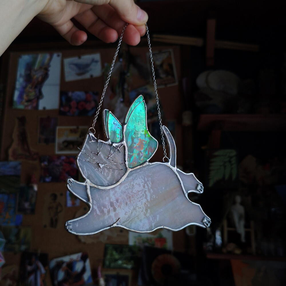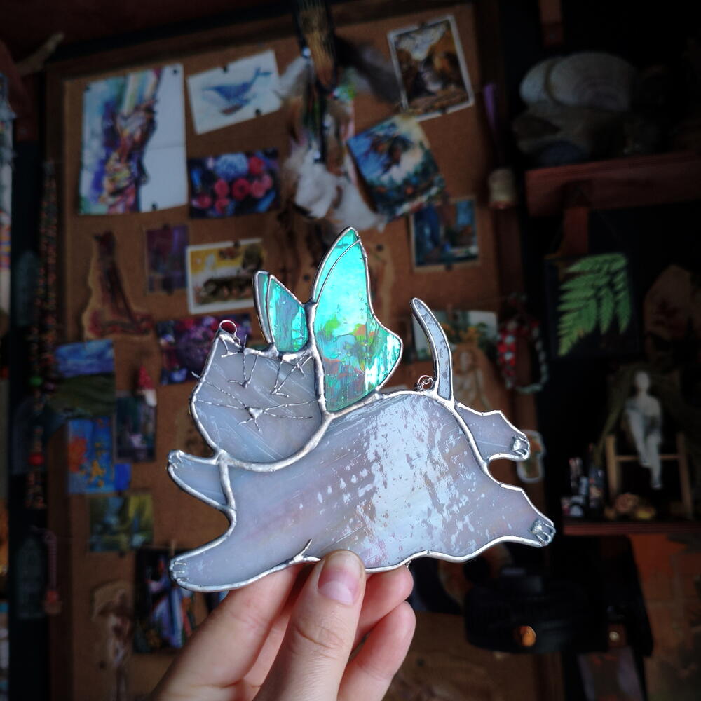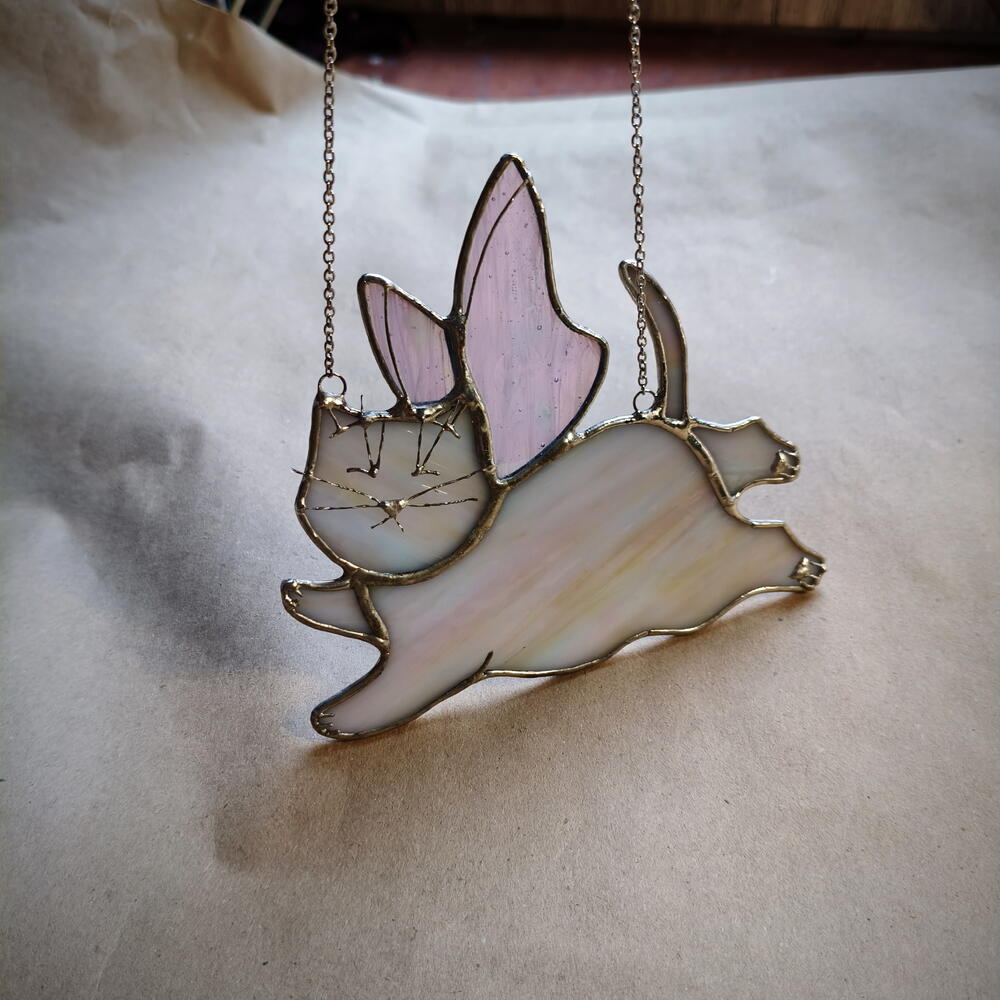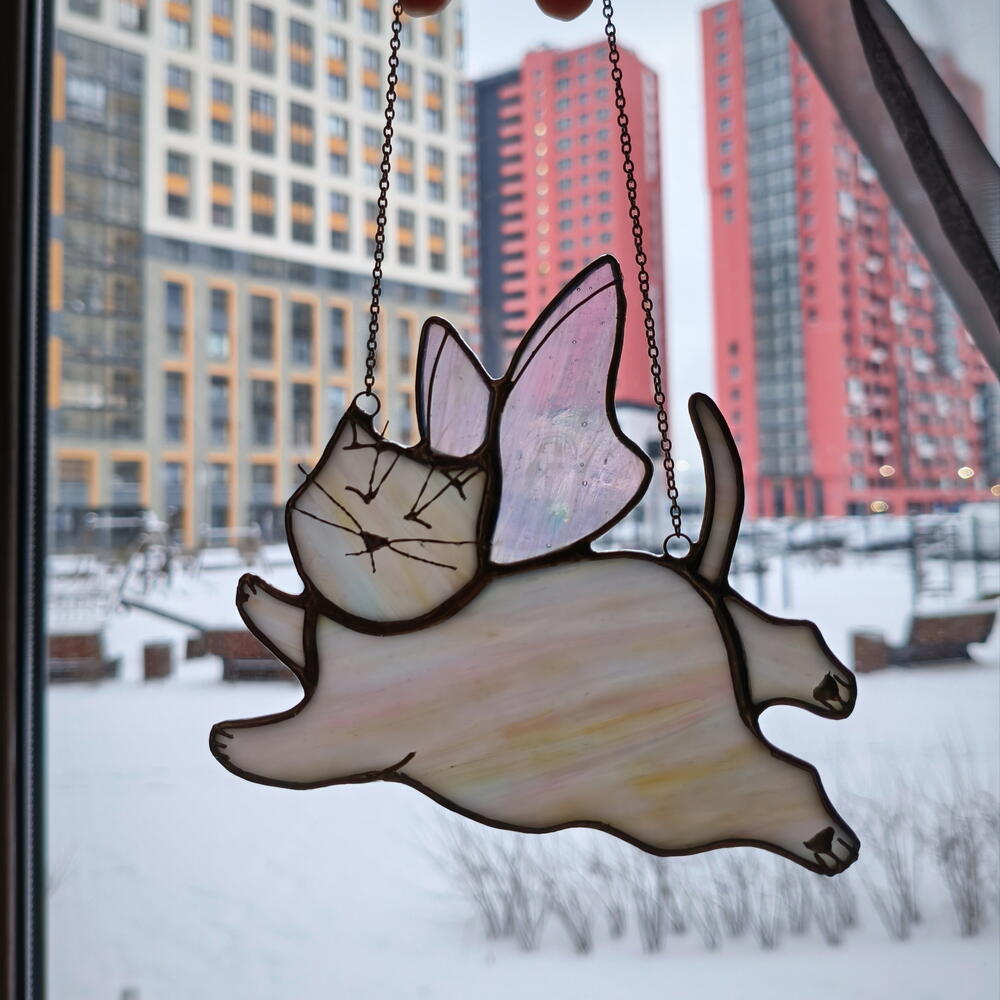 Милая котофея ручной работы в технике Тиффани. Кусочки стекла вырезаются, шлифуются, и после оборачивания медной лентой спаиваются между собой. Крылышки красиво отливают перламутром. Станет отличным милым подарком 🩷