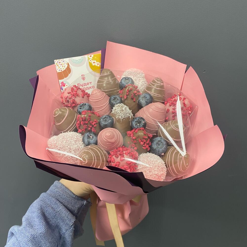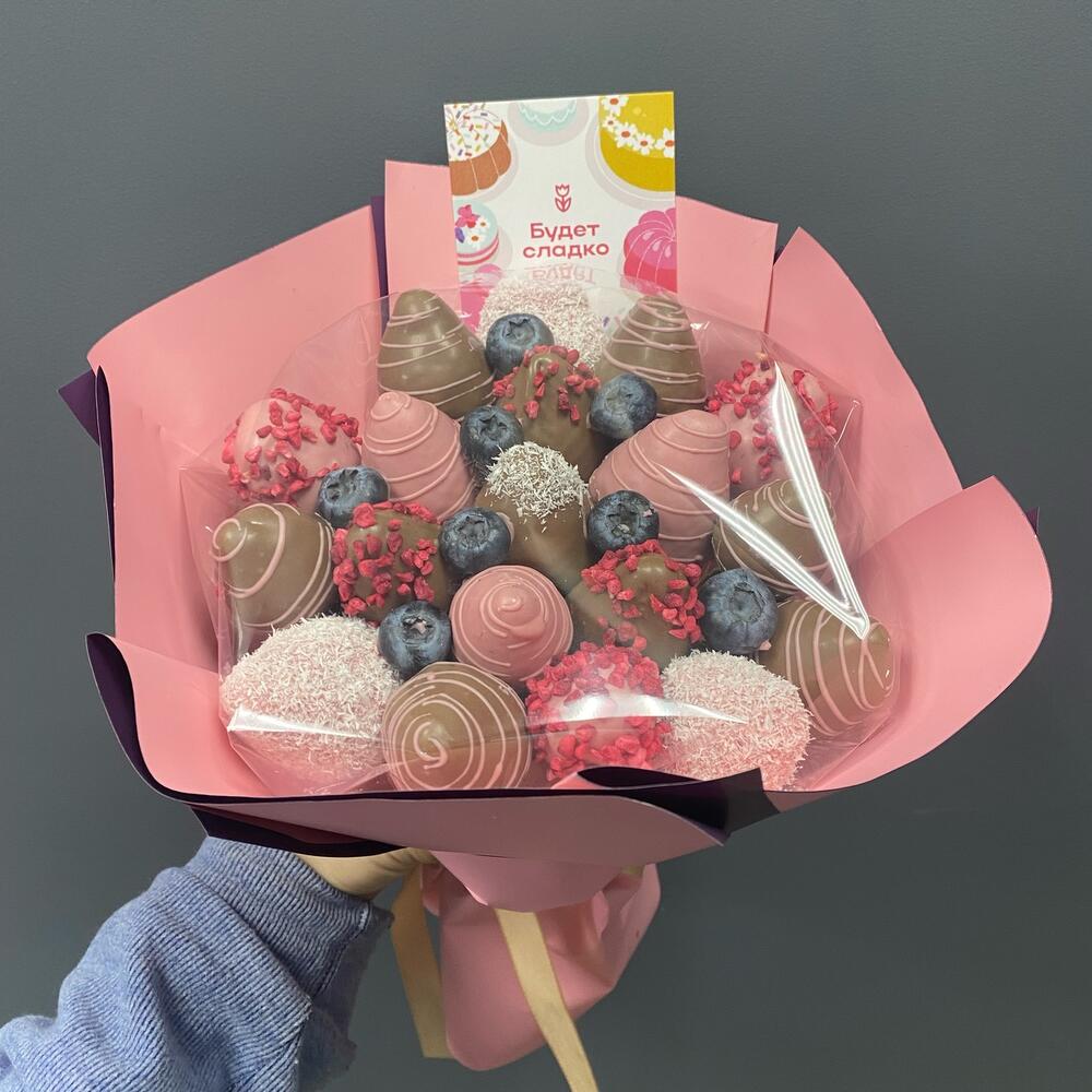Голубика - 5 шт. Клубника в шоколаде - 19 шт. открытка с вашими пожеланиями - 1 шт.