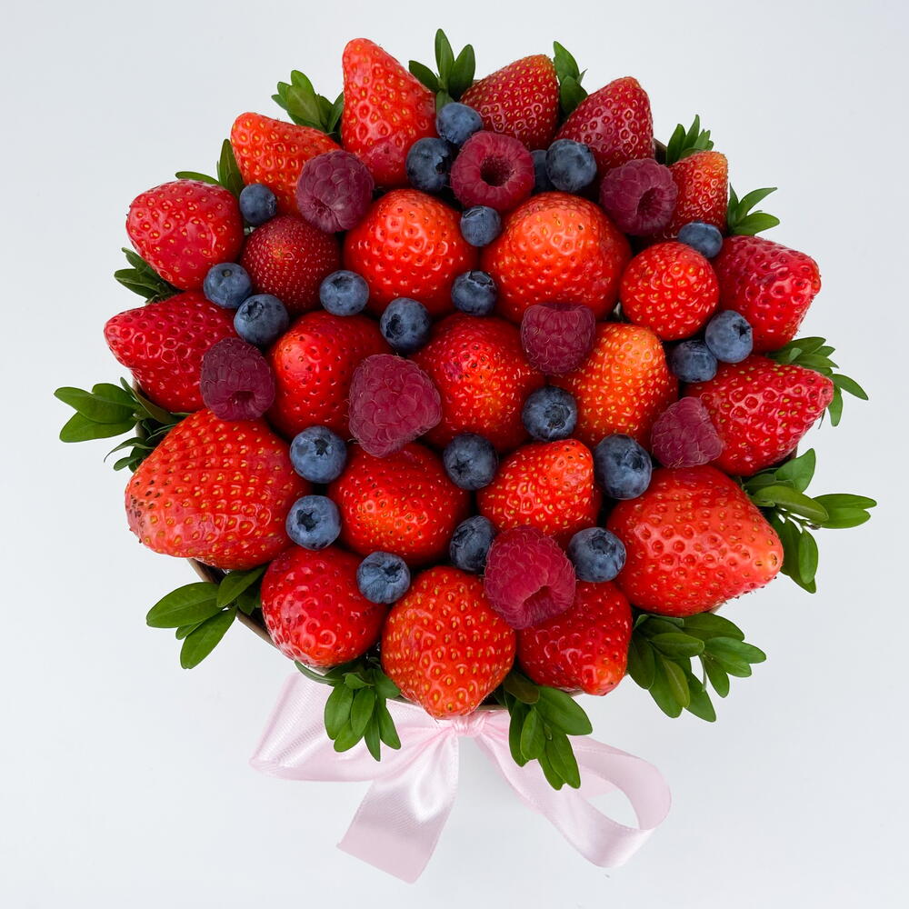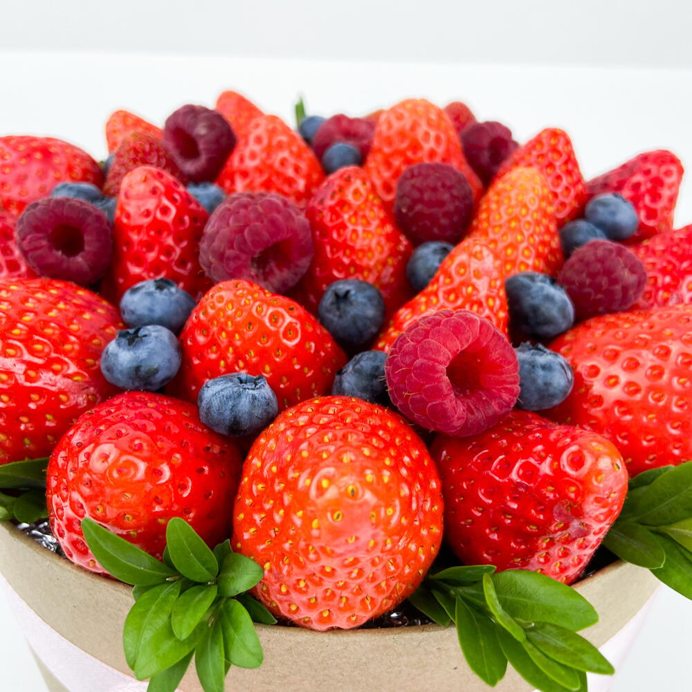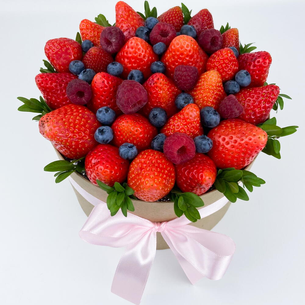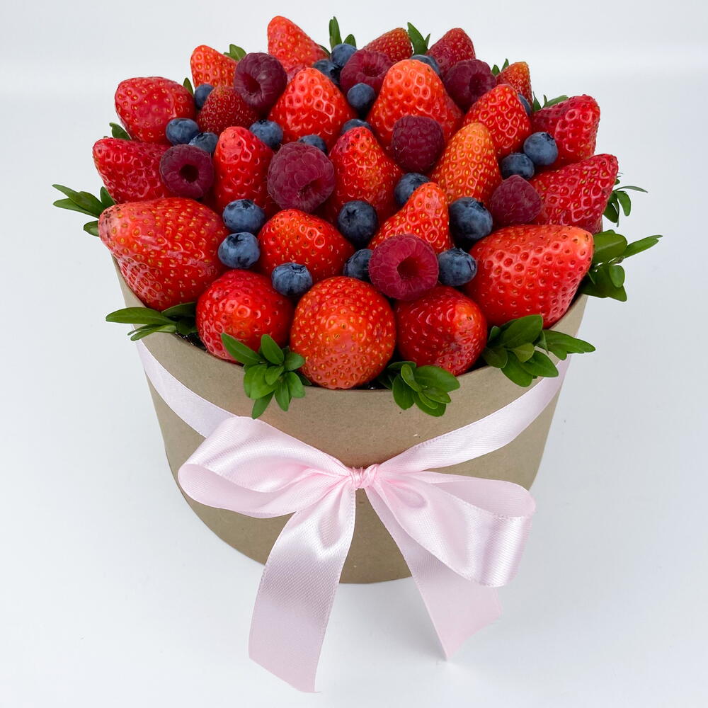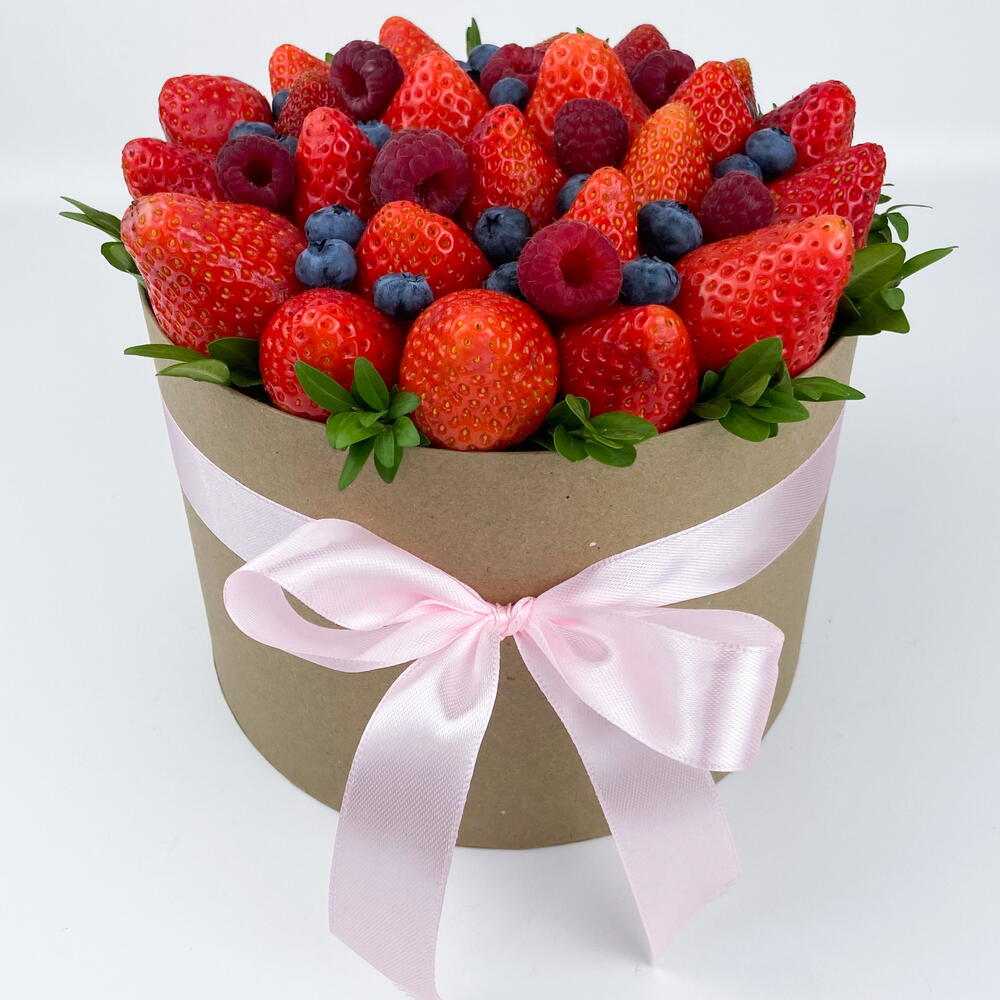 Шляпная коробка с клубникой, малиной и голубикой Изысканный подарок, который говорит без слов. Сочная свежая клубника и отборная голубика, аккуратно уложенные в стильную шляпную коробку и дополненные живой зеленью, создают эффектный и по-настоящему вкусный букет. Этот подарок удивляет с первого взгляда и покоряет с первого укуса: • только свежие ягоды • гармоничное сочетание вкуса и эстетики • универсален для любого повода — от романтического сюрприза до благодарности или поздравления Идеальный выбор, когда хочется подарить эмоции, красоту и удовольствие одновременно. ❗️ Букет собран на зубочистках, срок годности для таких букетов сокращается до 12 часов. Коробка упакована в пленку и доставляется в бумажном пакете.