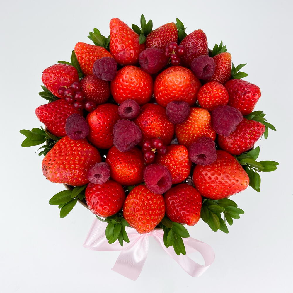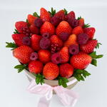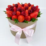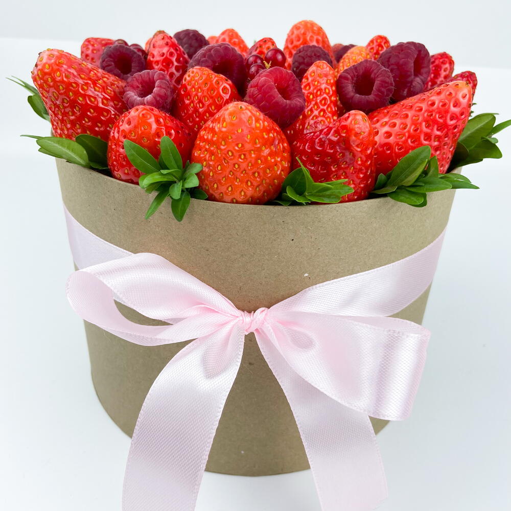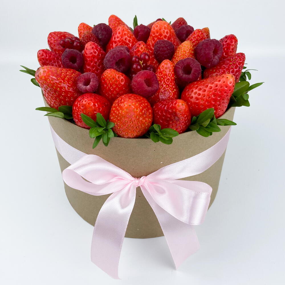 Шляпная коробка с клубникой, малиной и смородиной Изысканный подарок, который говорит без слов. Сочная свежая клубника и отборная малина, аккуратно уложенные в стильную шляпную коробку и дополненные живой зеленью, создают эффектный и по-настоящему вкусный букет. Этот подарок удивляет с первого взгляда и покоряет с первого укуса: • только свежие ягоды • гармоничное сочетание вкуса и эстетики • универсален для любого повода — от романтического сюрприза до благодарности или поздравления Идеальный выбор, когда хочется подарить эмоции, красоту и удовольствие одновременно. ❗️ Букет собран на зубочистках, срок годности для таких букетов сокращается до 12 часов. Коробка упакована в пленку и доставляется в бумажном пакете.