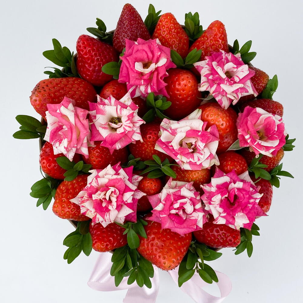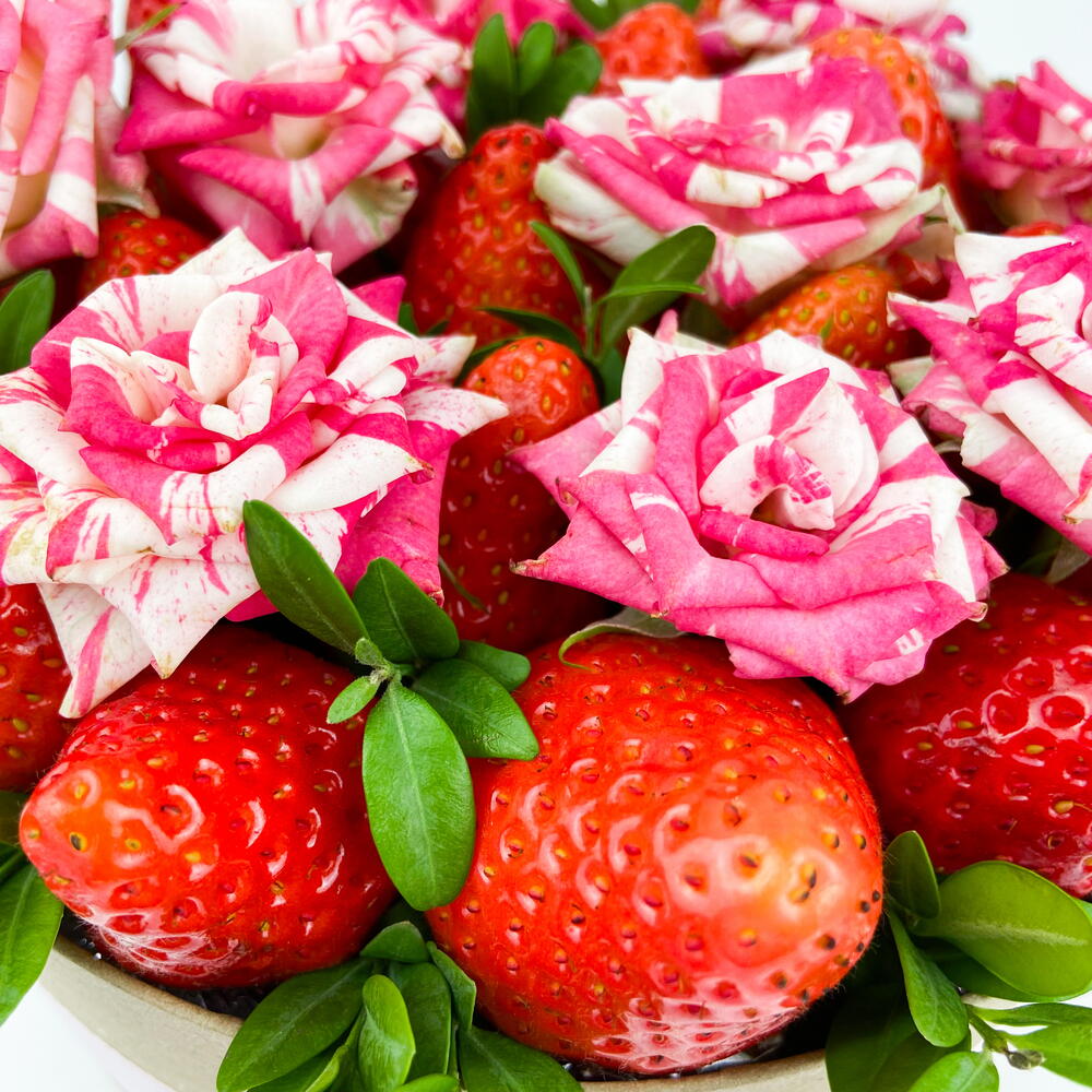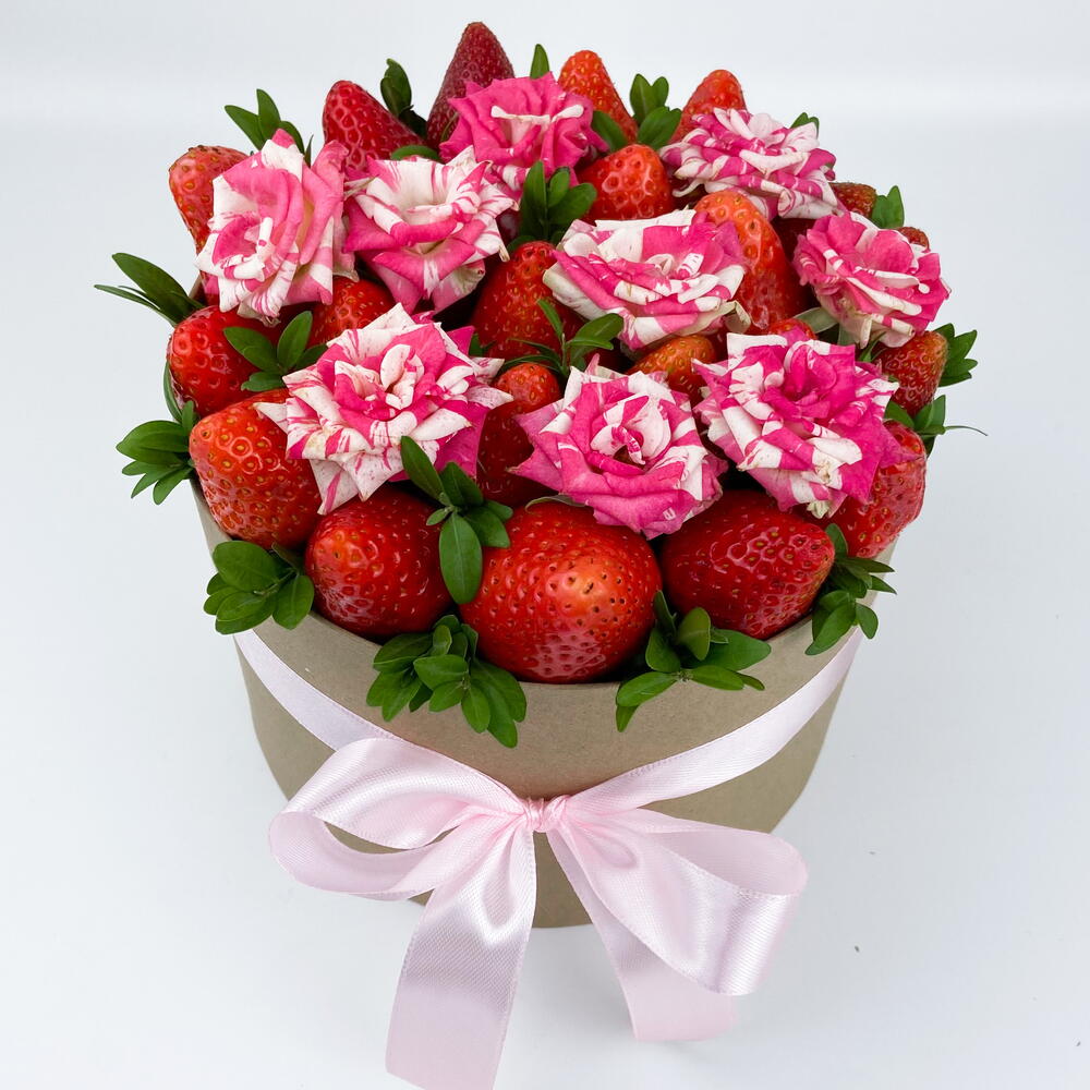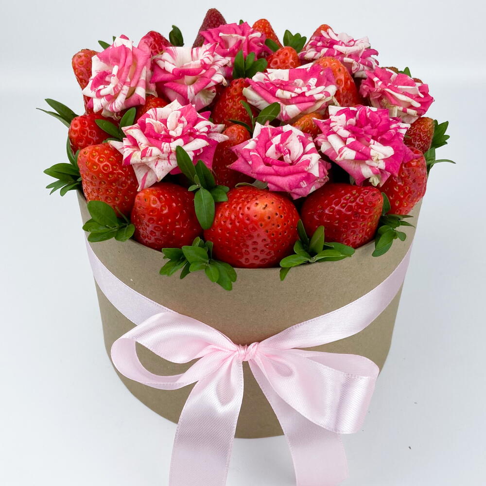 Клубника - 500 гр. Роза кустовая - 1 шт. Самшит - 1 шт. Шляпная коробка - 1 шт.