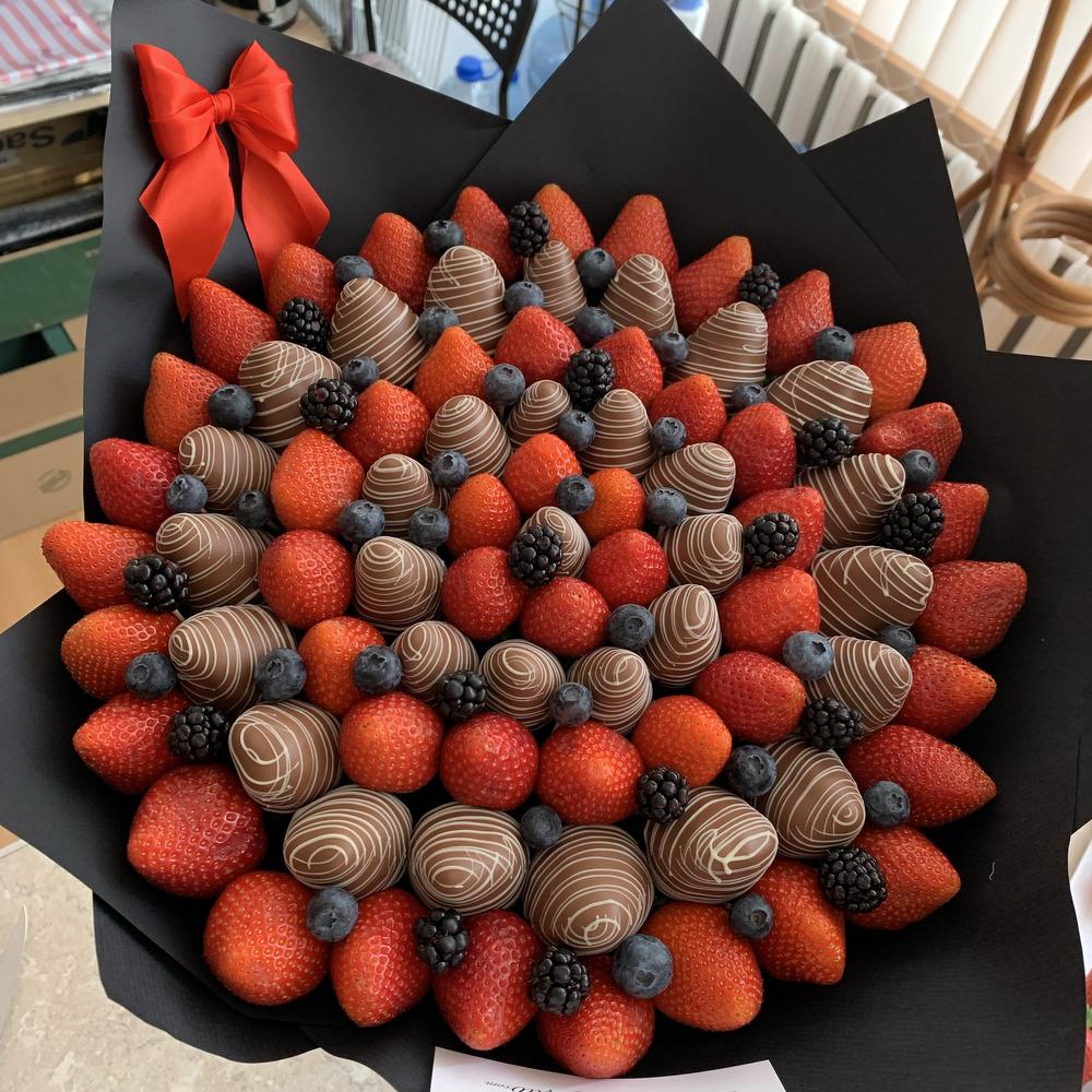Клубника без шоколада - 47 шт. Клубника в шоколаде callebaut (бельгия) - 33 шт. ежевика 125 гр. - 1 шт. голубика 125 гр. - 1 шт. упаковочная бумага и атласная лента - 1 шт.