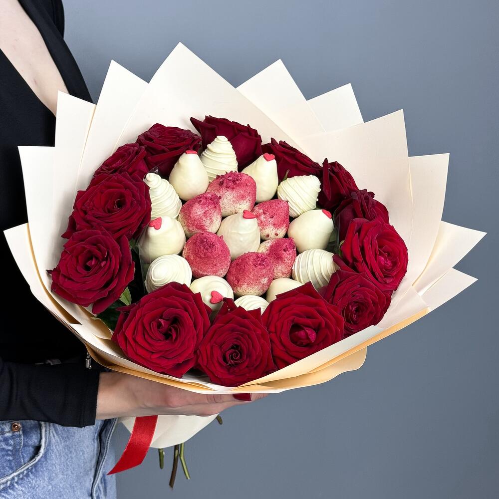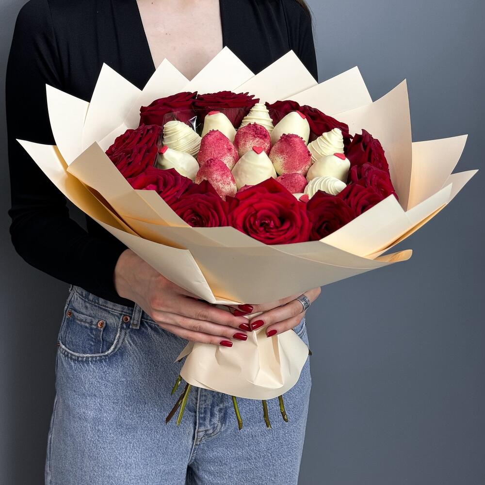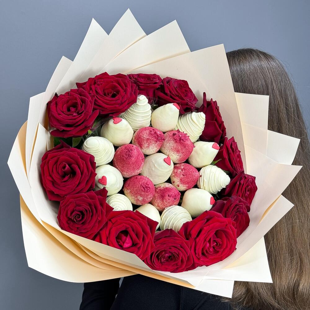 Букет из клубники в белом шоколаде с красными розами🍓 Отличный подарок маме на день рождения 🎁 🍓Рекомендуем употребить продукцию, содержащую свежие ягоды, в течение первых 12 часов после получения ❄️Хранить в холодильнике при температуре от 4 до 10 градусов Перед употреблением подержать при комнатной температуре 15 минут Если букет планируется дарить не сразу, рекомендуем поставить в вазу и в холодильник, чтобы клубники не упали со шпажек