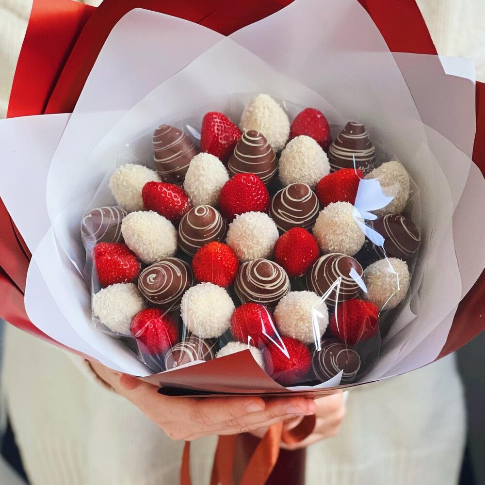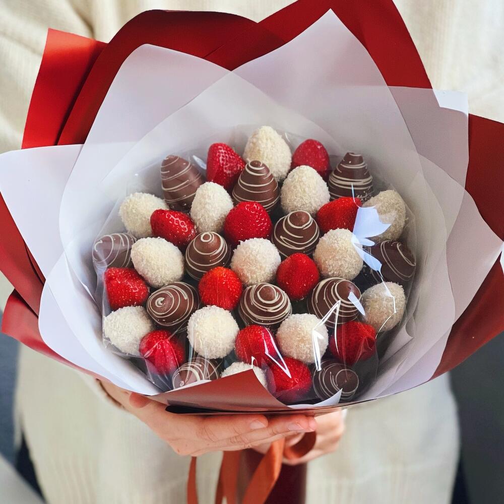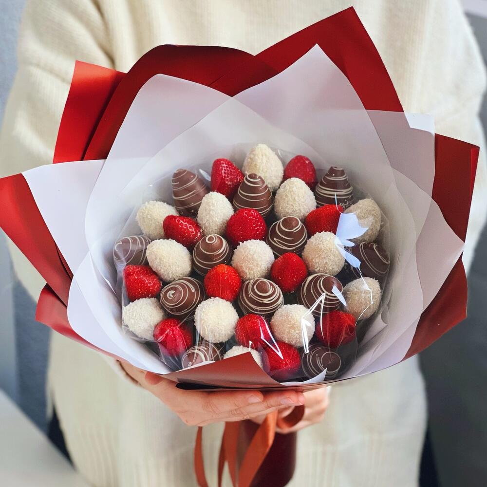 Изысканный букет клубники в шоколаде «Глория» состоит из 37 свежих ягод клубники. Белый и молочный бельгийский шоколад. В качестве украшения - кокосовая стружка. Идеальный вариант для того, чтобы признаться в своих чувствах или поздравить с днём рождения.❤️ Срок хранения - 24 часа, хранить в холодильнике.