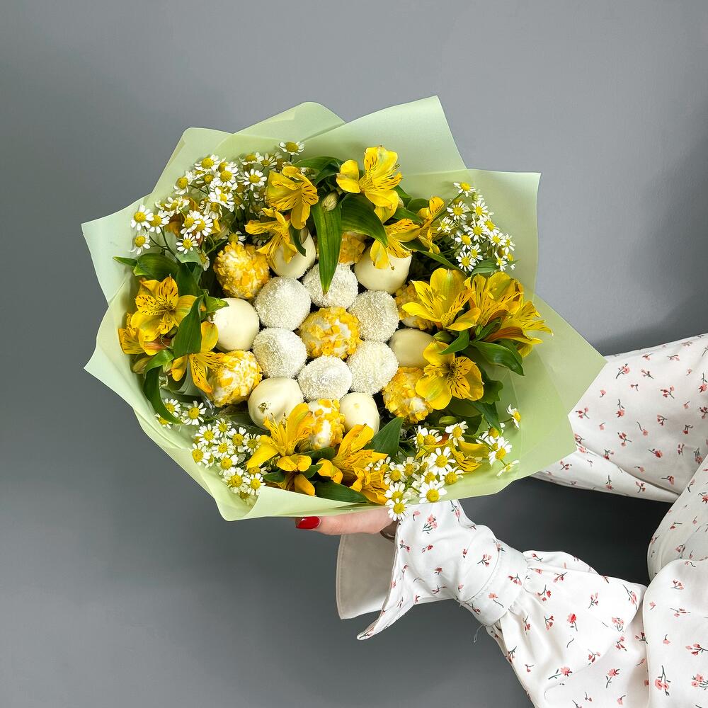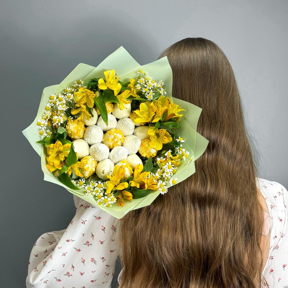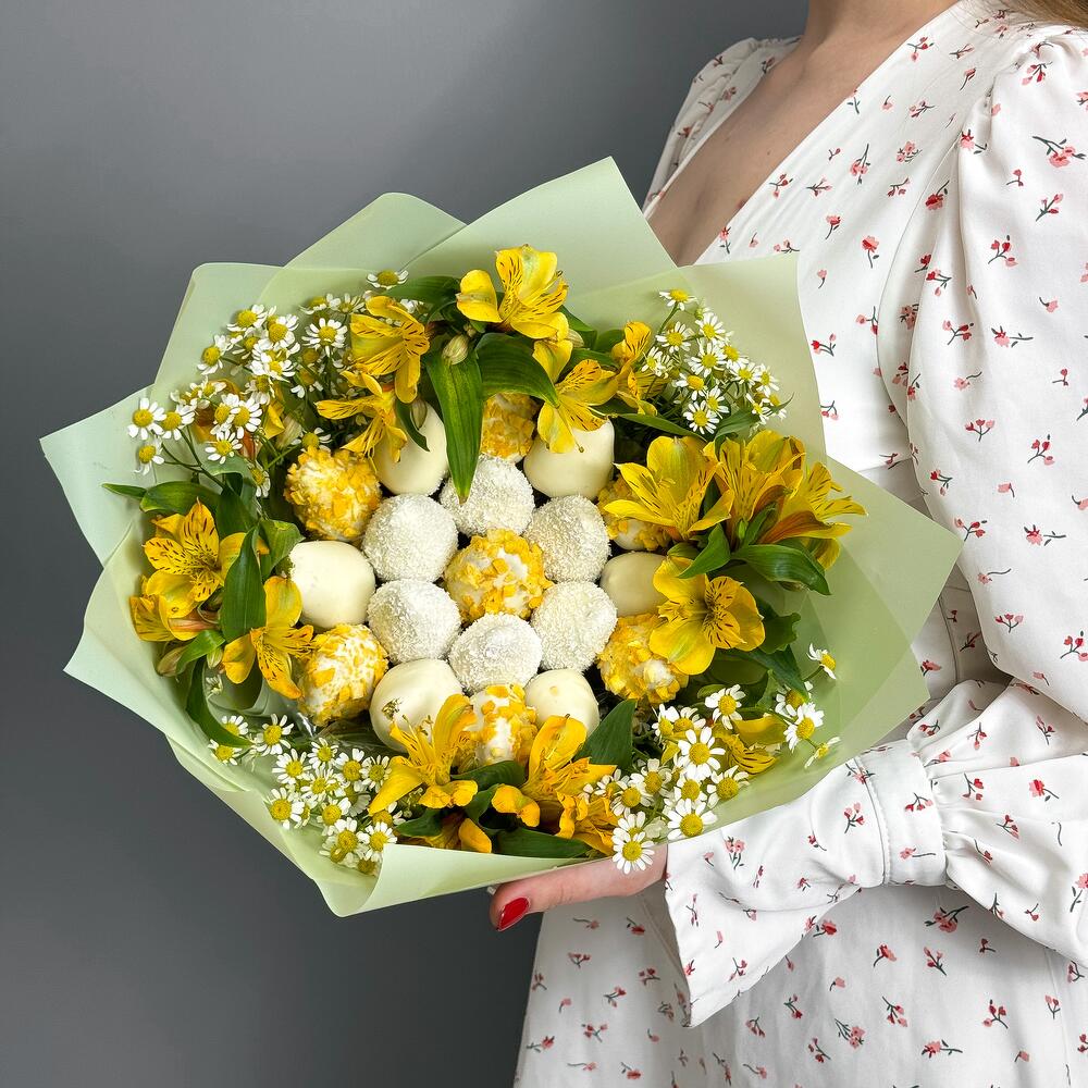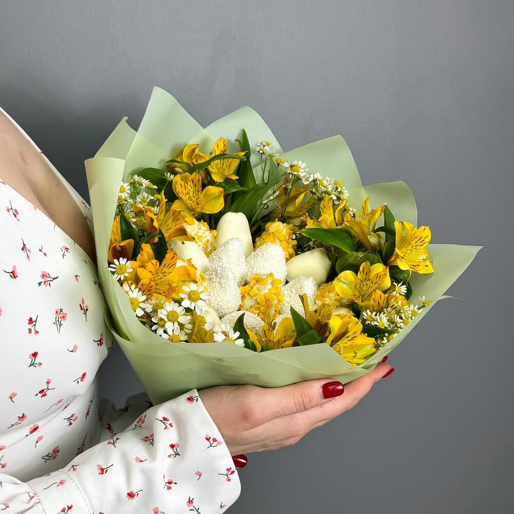 Букет из клубники в шоколаде с альстромерией и танацетумом Spring