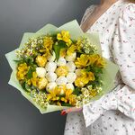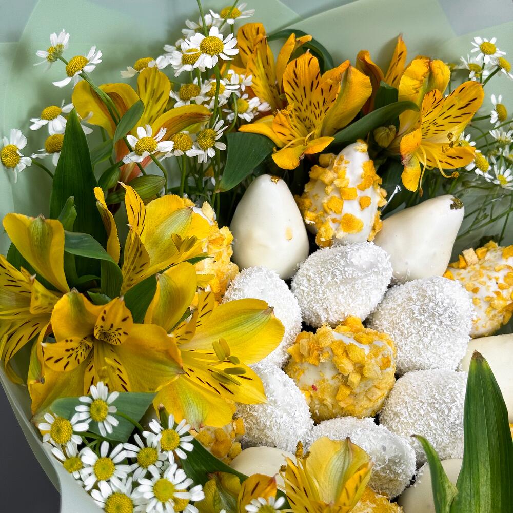 Альстромерия - 5 шт. Танацетум - 4 шт. Кокосовая стружка - 10 гр. Клубника в шоколаде - 19 шт. сублимированное манго - 10 гр.