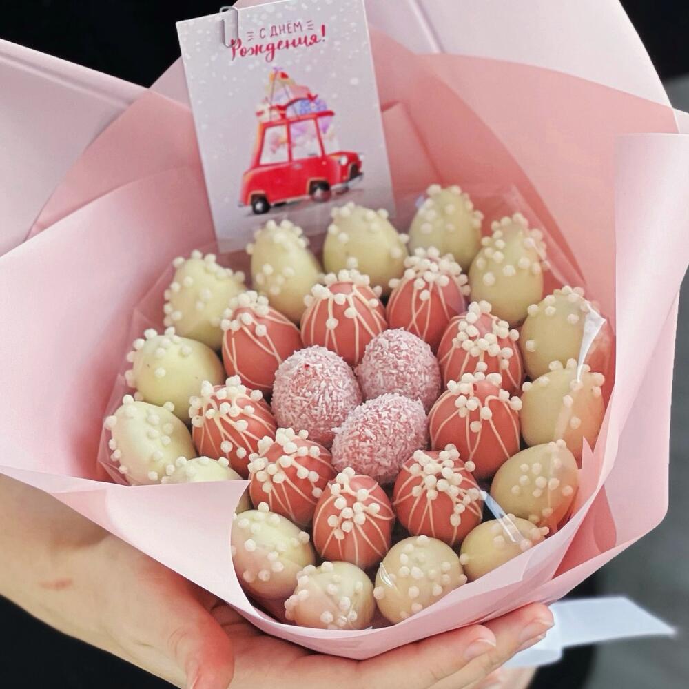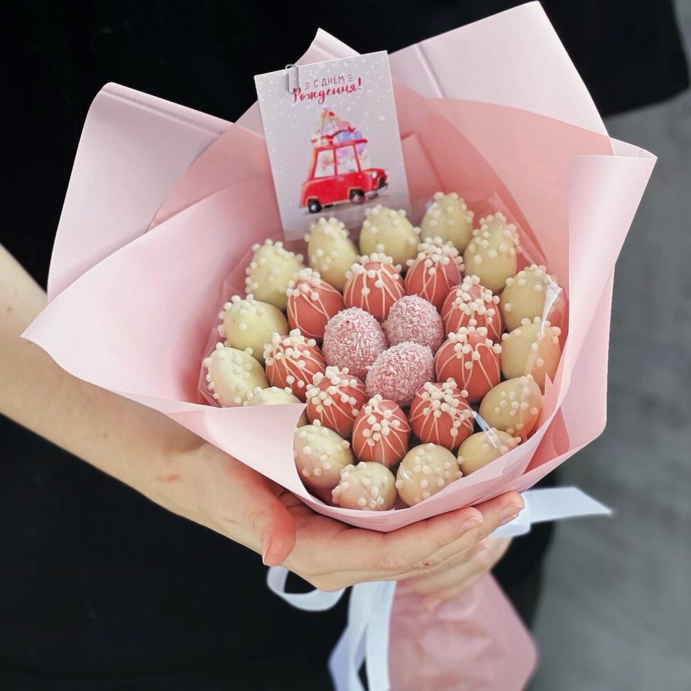 Изысканный букет клубники в шоколаде «Нежность» состоит из 27 свежих ягод клубники. Белый бельгийский шоколад. В качестве украшения - кокосовая стружка и хрустящие шарики. Идеальный вариант для того, чтобы признаться в своих чувствах или поздравить с днём рождения.❤️ Срок хранения - 24 часа, хранить в холодильнике.