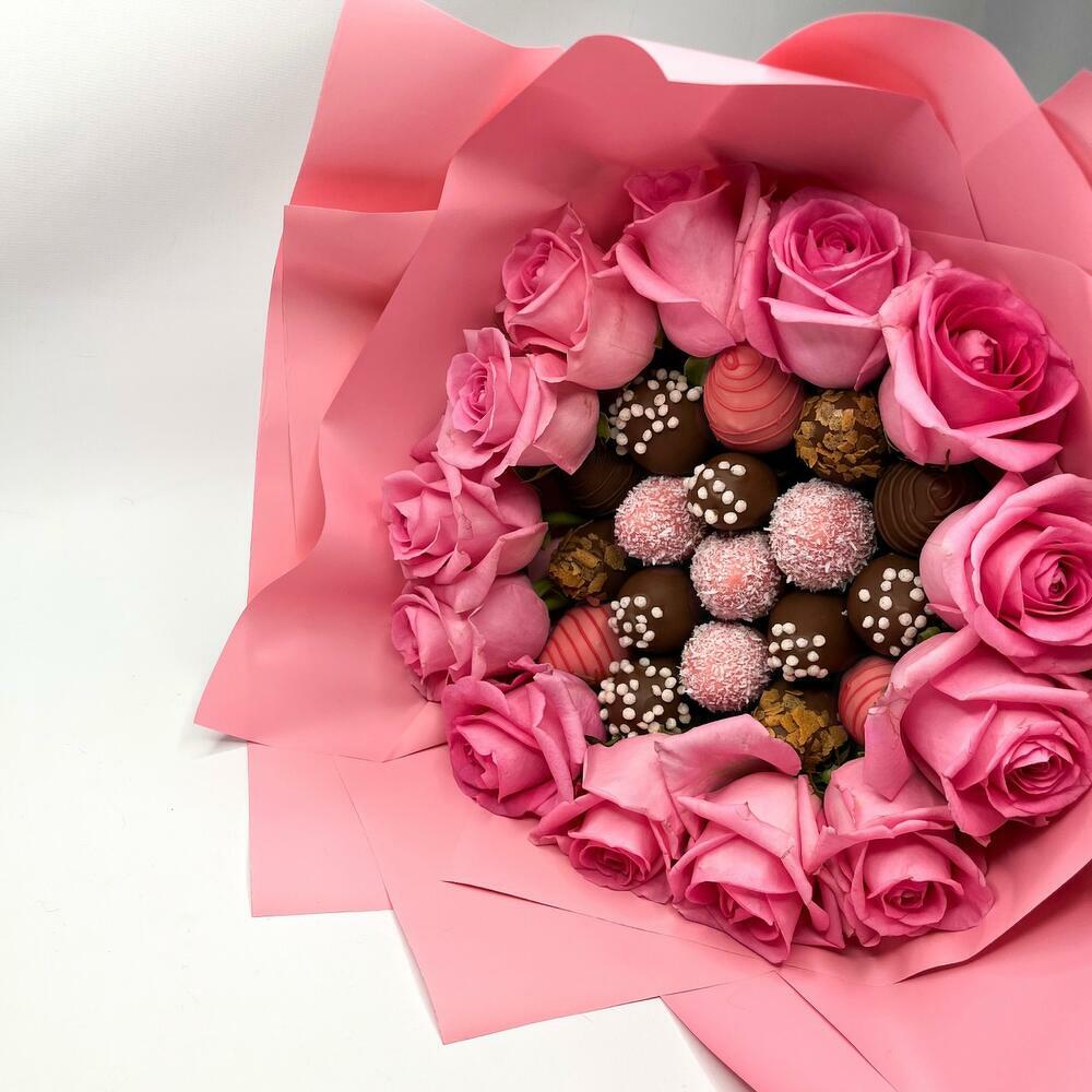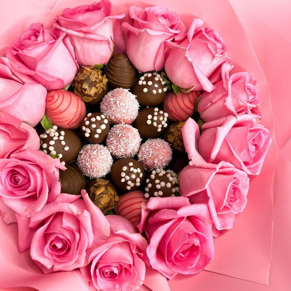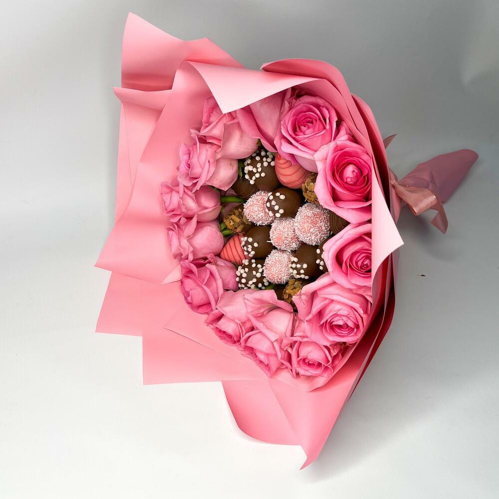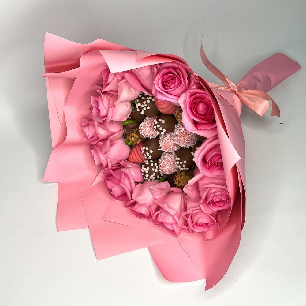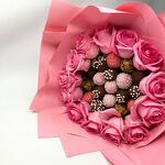 Букет из клубники в шоколаде 19 ягод и 13 розовых роз