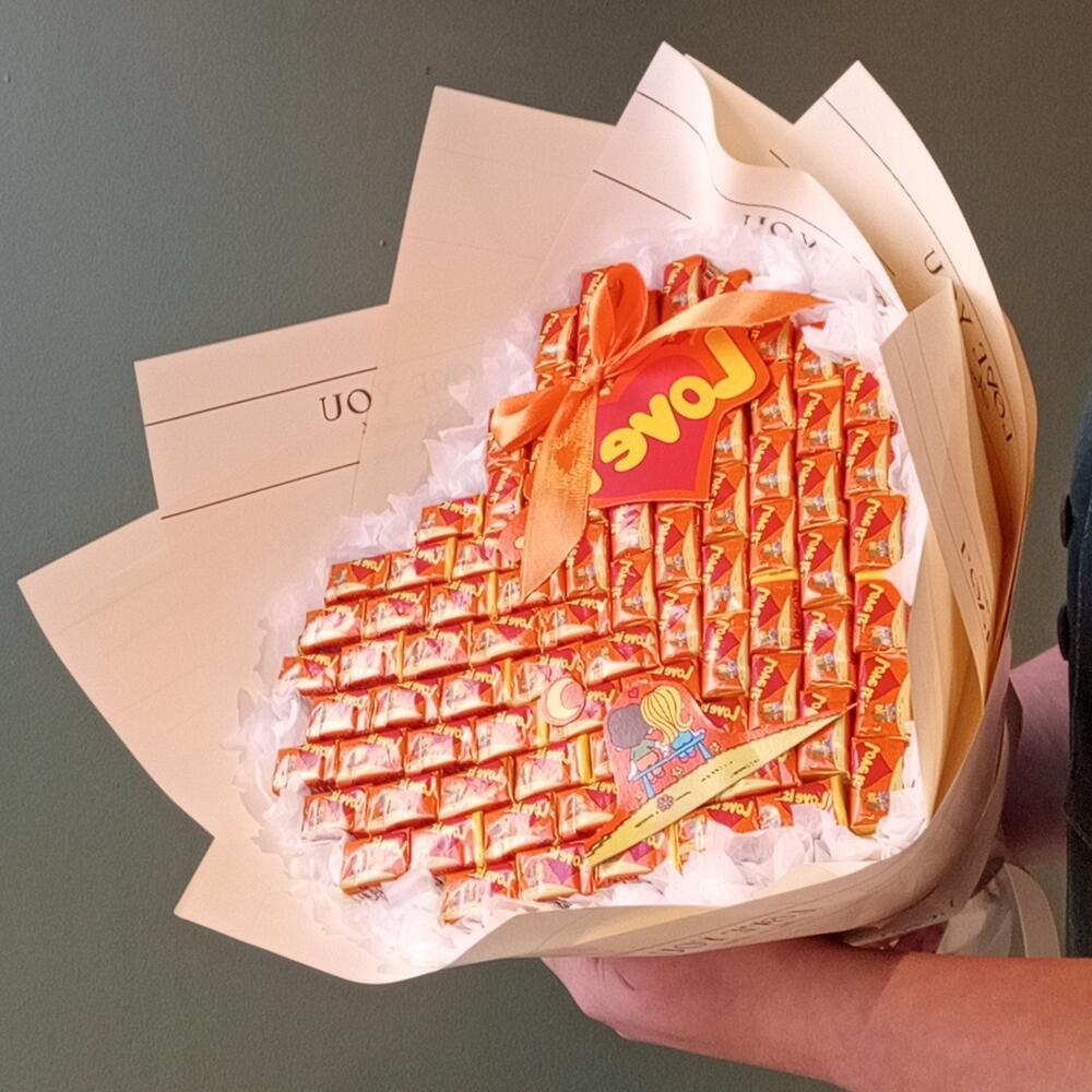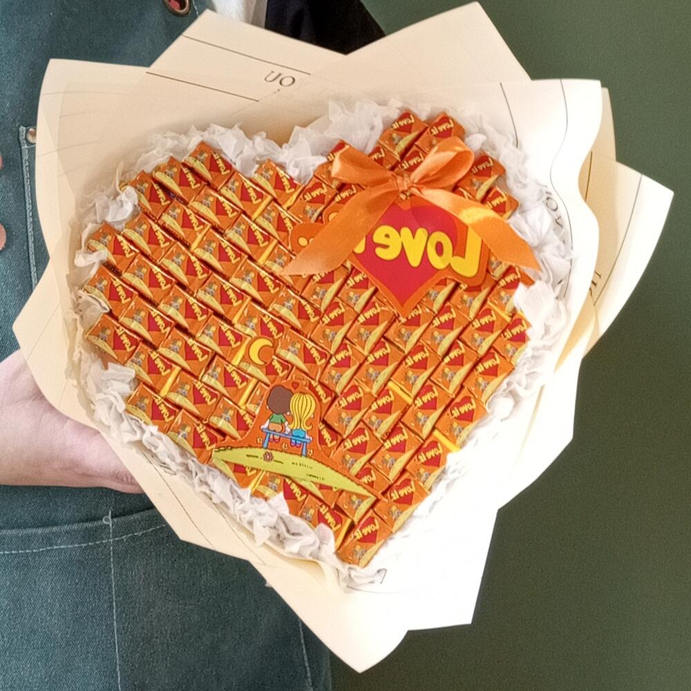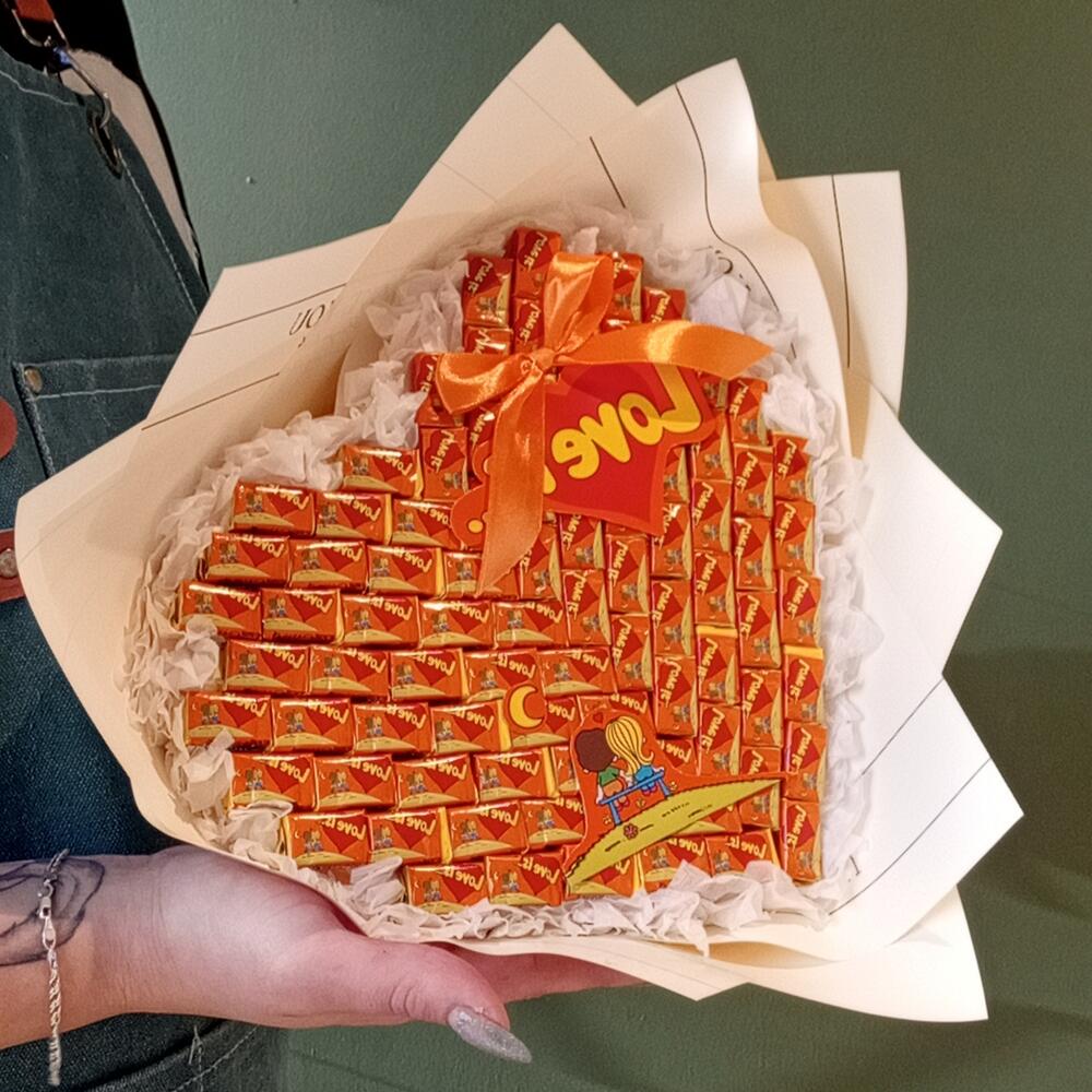 Лента атласная - 1 шт. Шпажки деревянные - 10 шт. бумага дизайнерская - 1 шт. жвачка love is - 75 шт. работа нежных рук флориста(бесплатно и с любовью) - 1 шт.