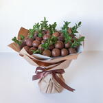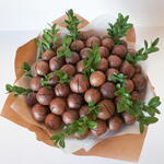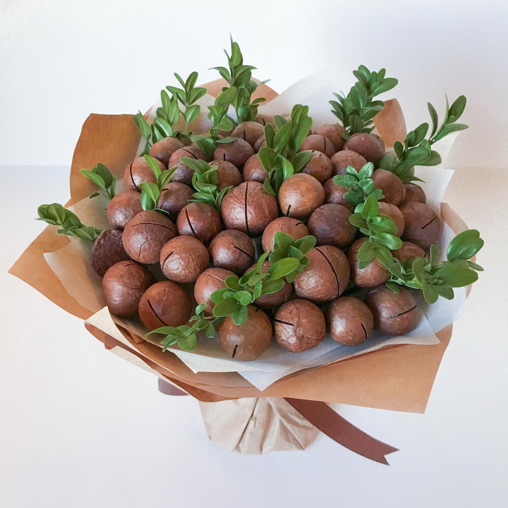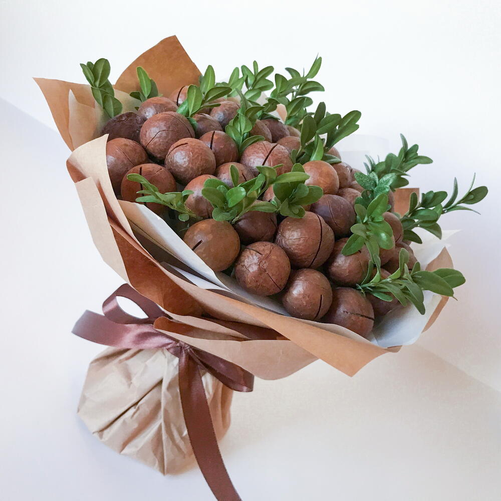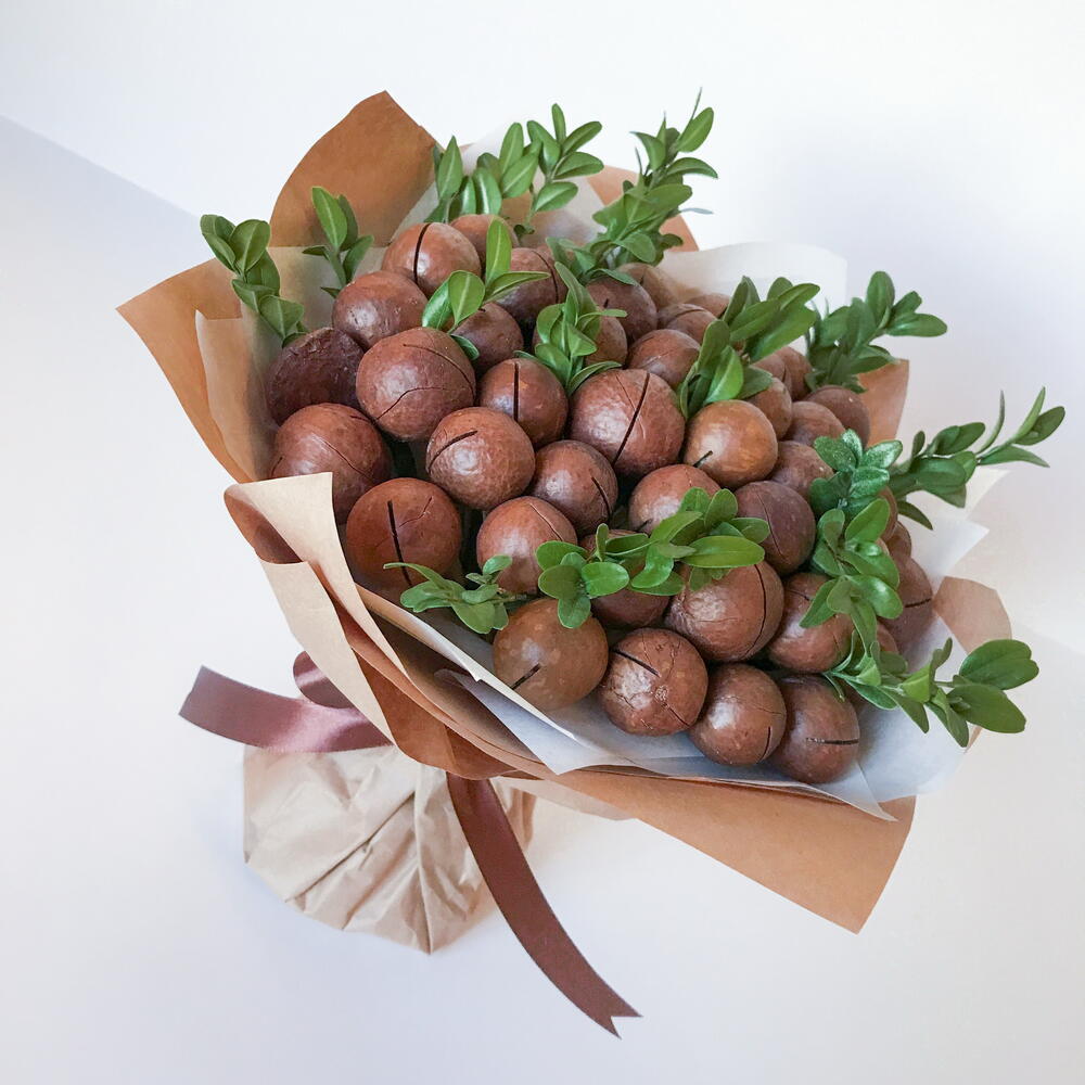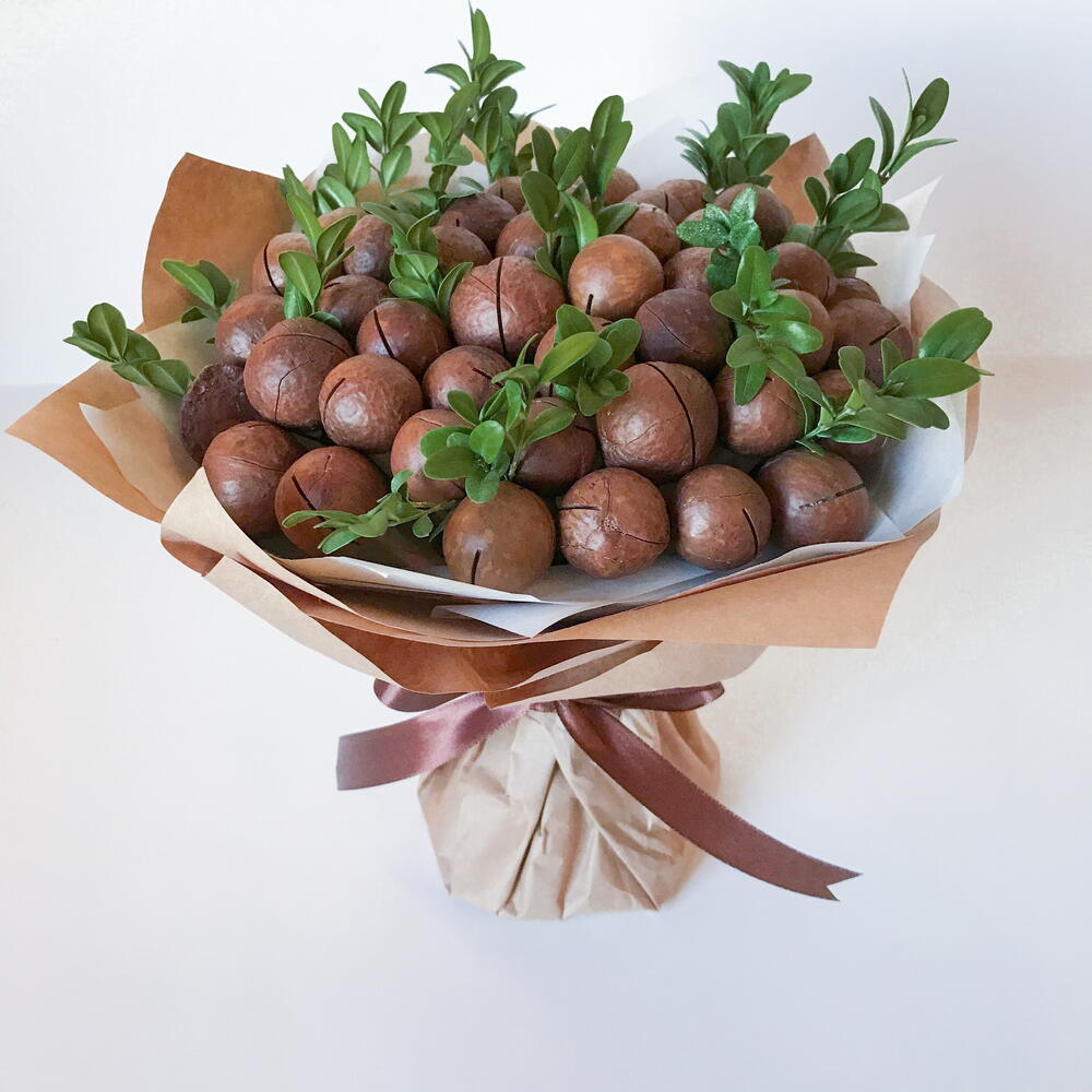Букет из макадамии. Калорийный и дорогой орешек с богатым витаминно-минеральным составом со сладковатым сливочным вкусом, ароматом ванили, сгущеного молока и шоколада. К каждому букету прилагается ключ для вскрытия. Рекомендуется употреблять не более 10-15 орехов в день.
