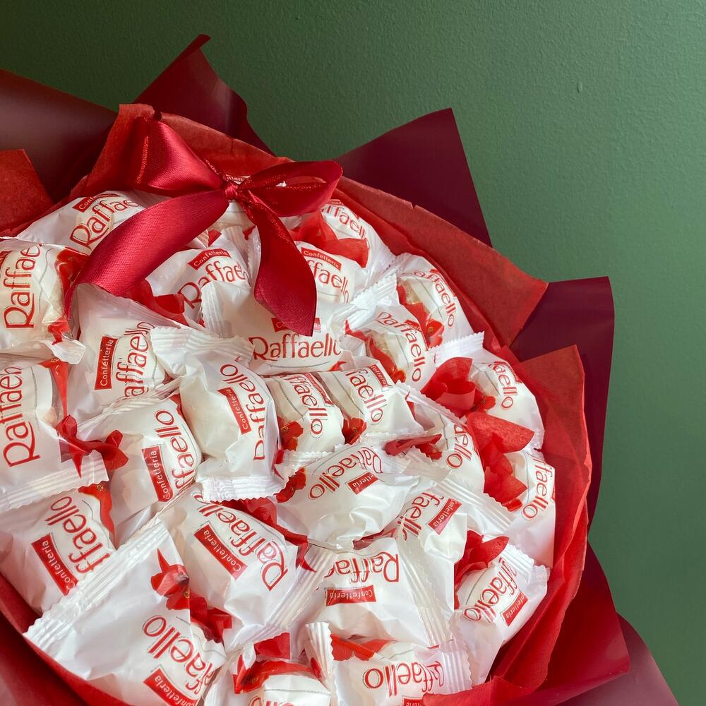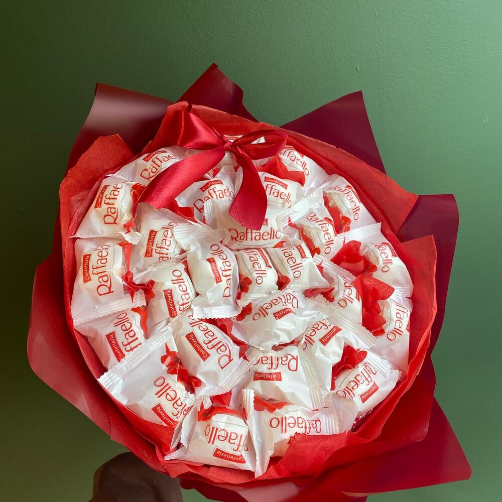 Лента атласная - 1 шт. Стильная упаковка - 5 шт. конфеты раффаэлло - 27 шт. работа флориста (бесплатно и с любовью) - 1 шт.