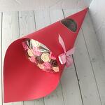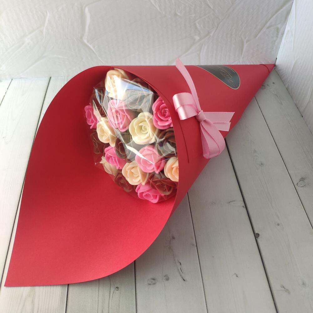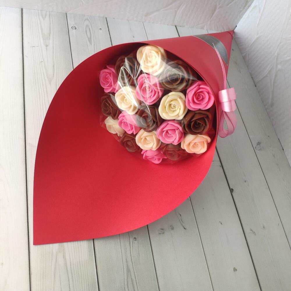 Букет из шоколадных роз ручной работы "Красный Микс 1" 19 шт. в итальянской дизайнерской упаковке красного цвета.