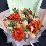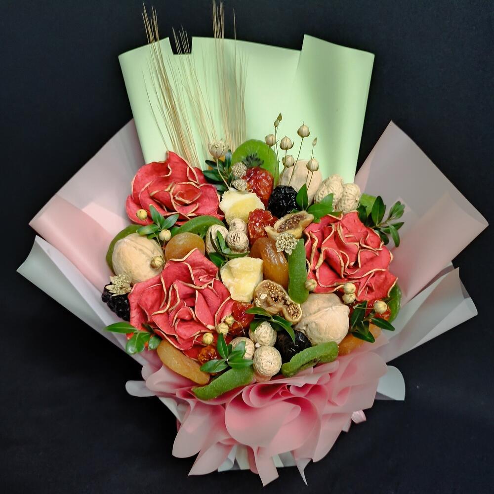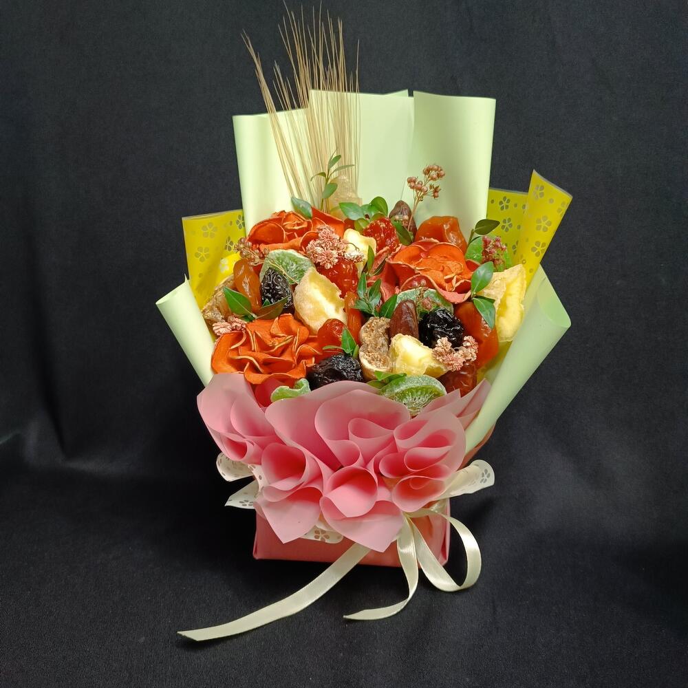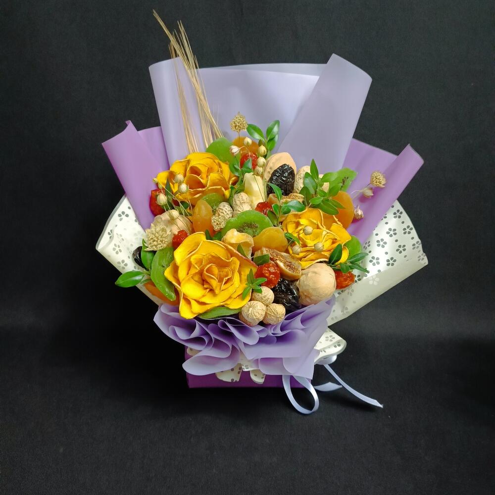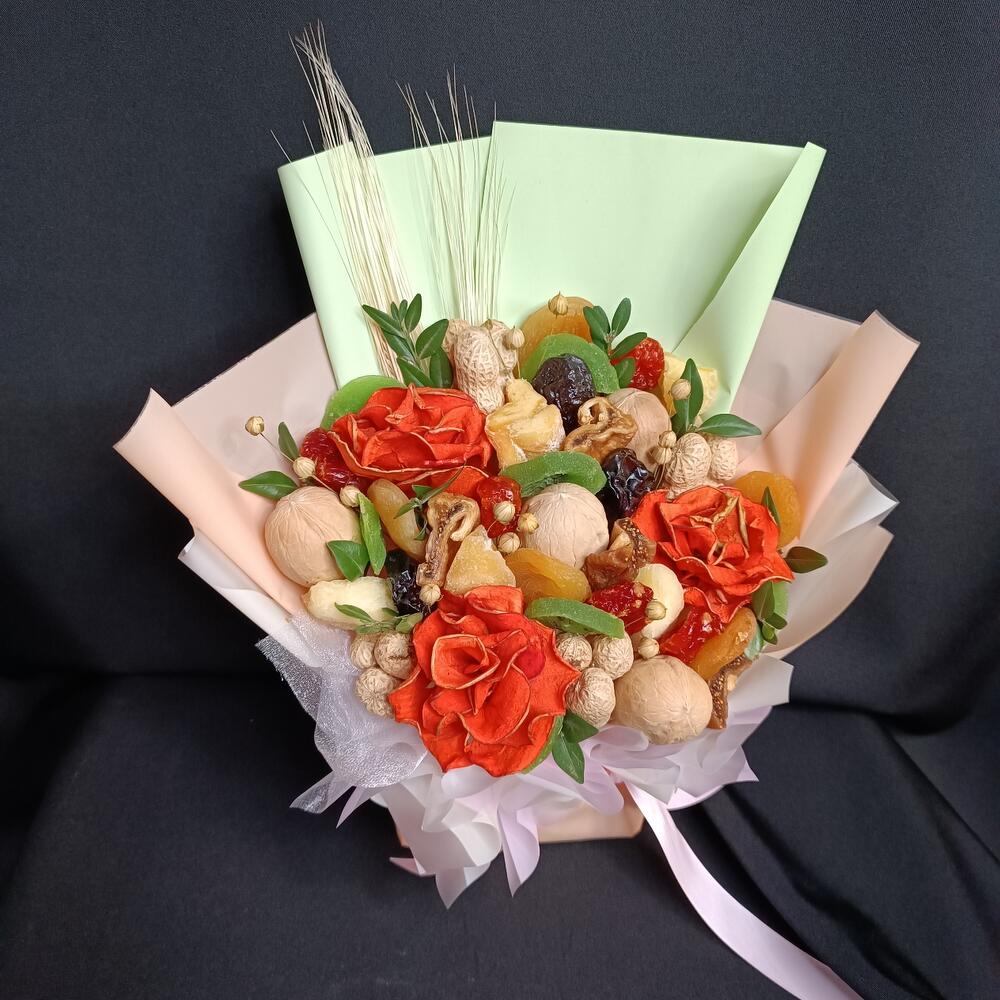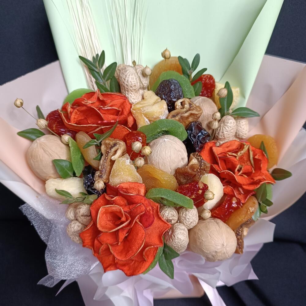 Яркий букет из сухофруктов, стоит самостоятельно не требуется ваза Может быть выполнен в разных цветах. Композиция из сухофруктов храниться до 14 дней