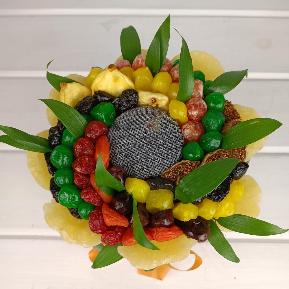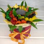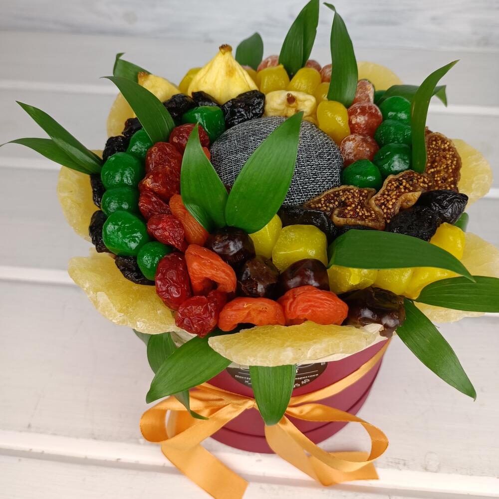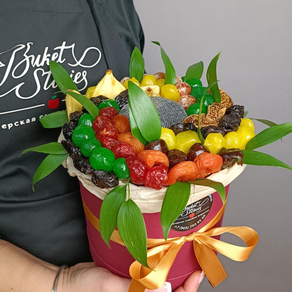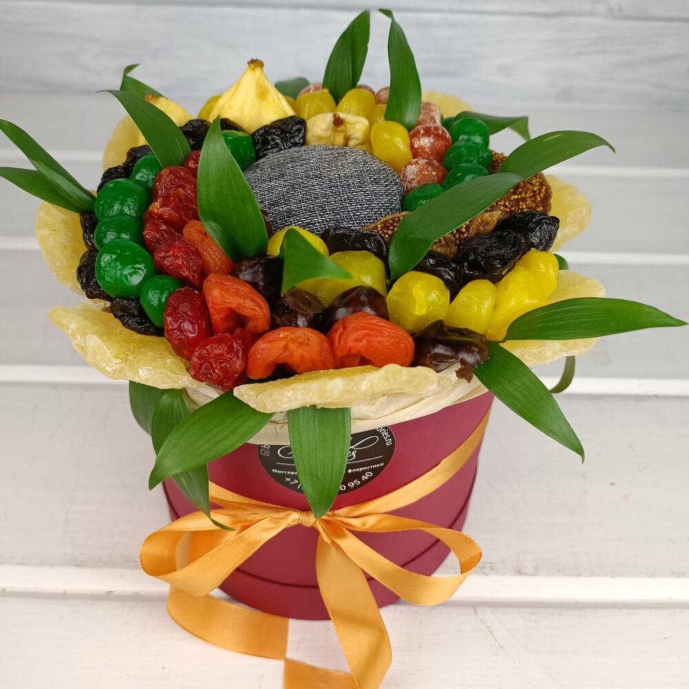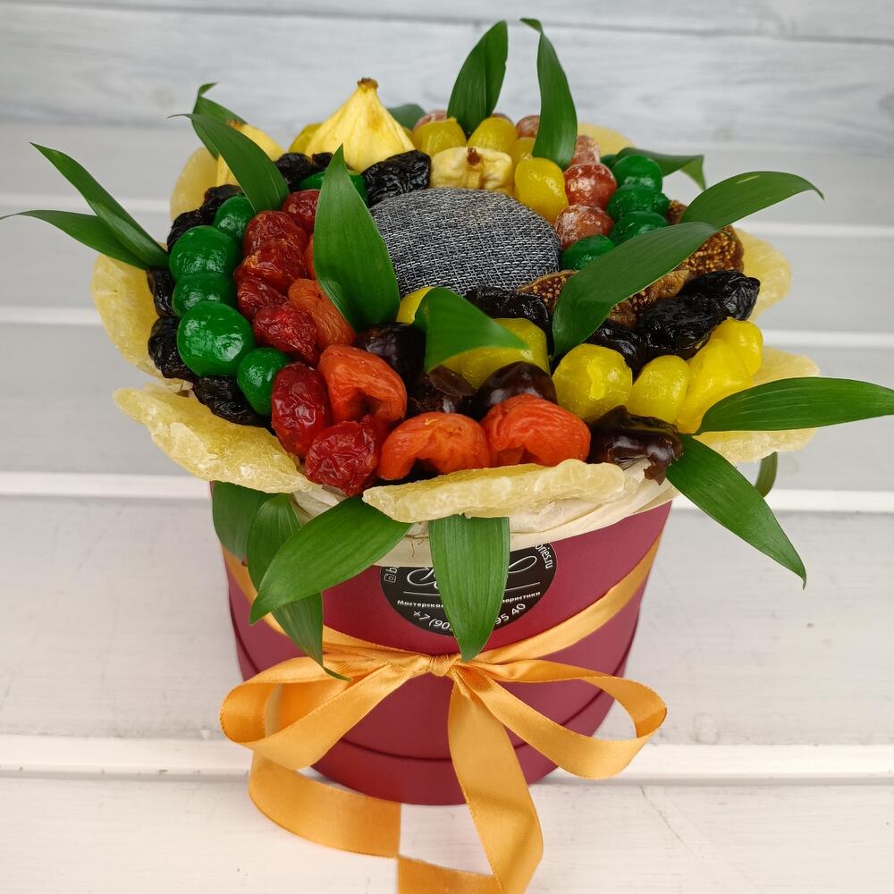 Яркий, стильный букет из свежих сладких сухофруктов в шляпной коробочке. Идеальный презент для прекрасного настроения!