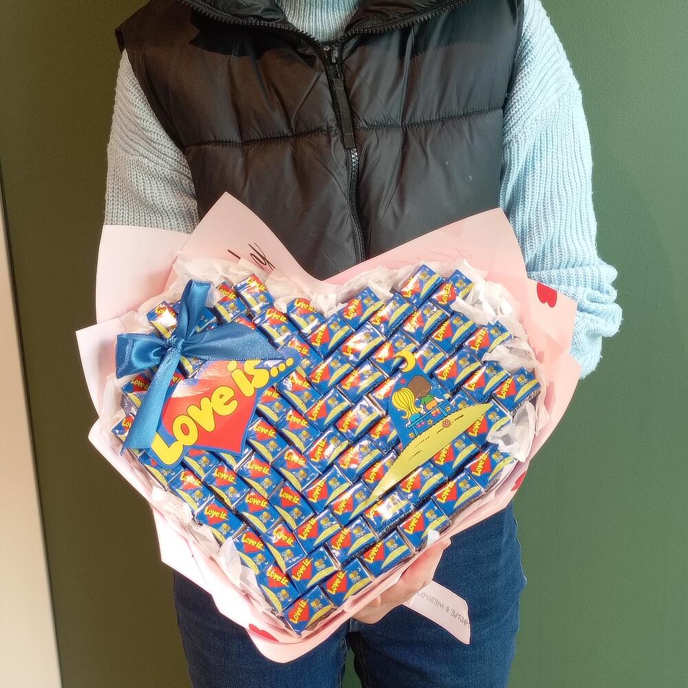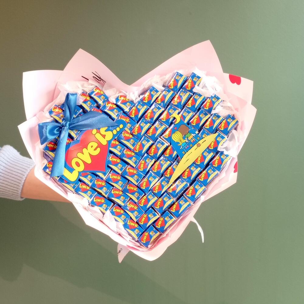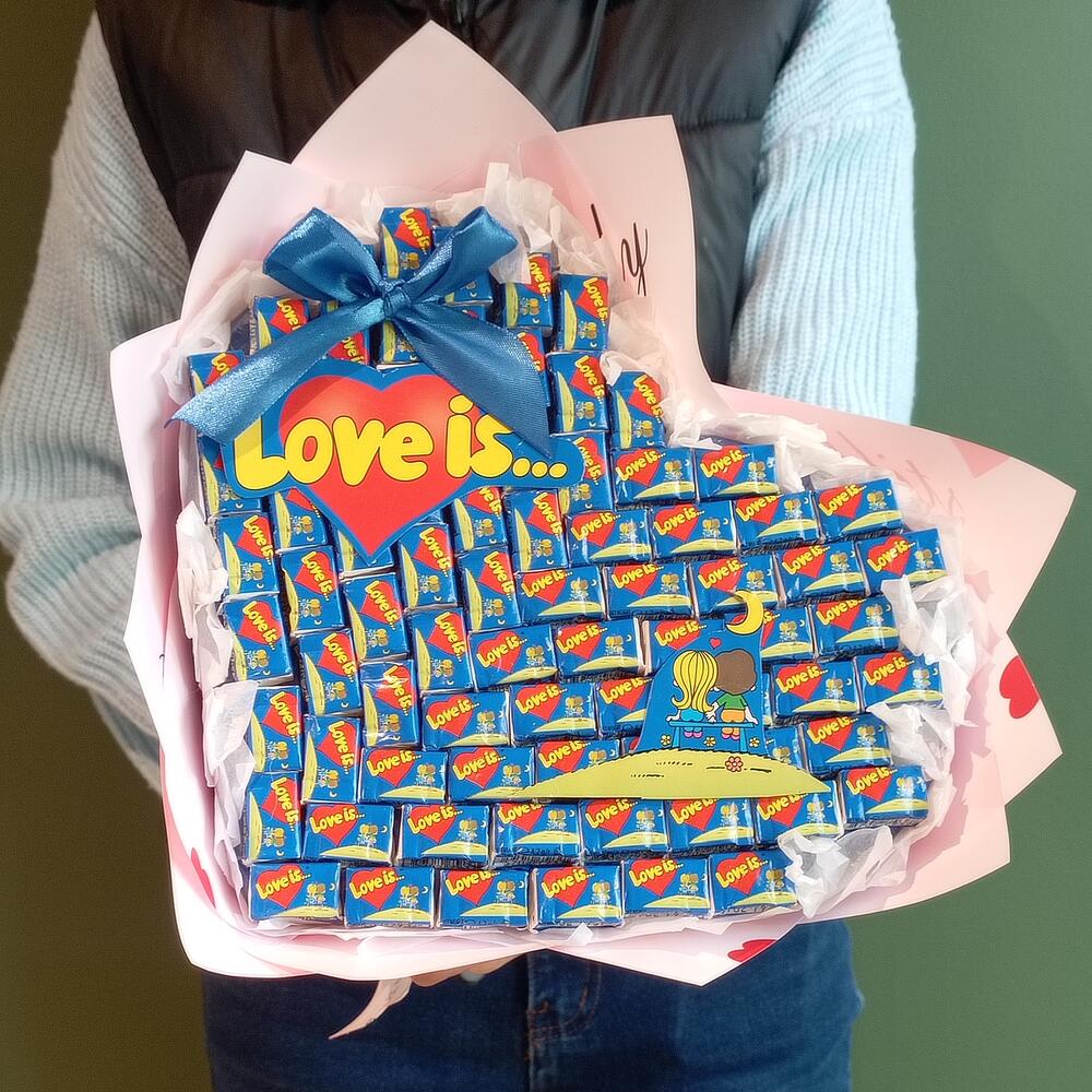 Букет Love is — это необычный подарок, который переносит нас в детство. Как и раньше, каждая жевательная резинка содержит вкладыш с посланием.
