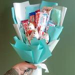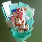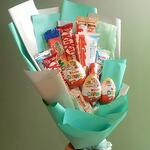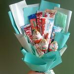 Киндер сюрприз - 3 шт. КитКат - 2 шт. Упаковка дизайнерская - 1 шт. Киндер шоколад - 8 шт. Киндер Буэно - 1 шт. Киндер пингви - 2 шт. Киндер молочный ломтик - 1 шт. мамба - 1 шт. работа нежных рук флориста(бесплатно и с любовью) - 1 шт.