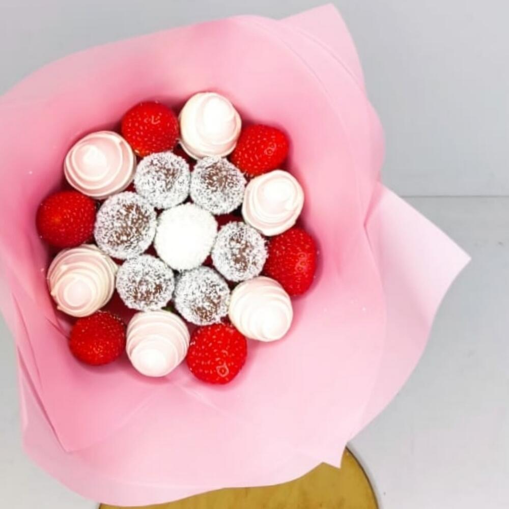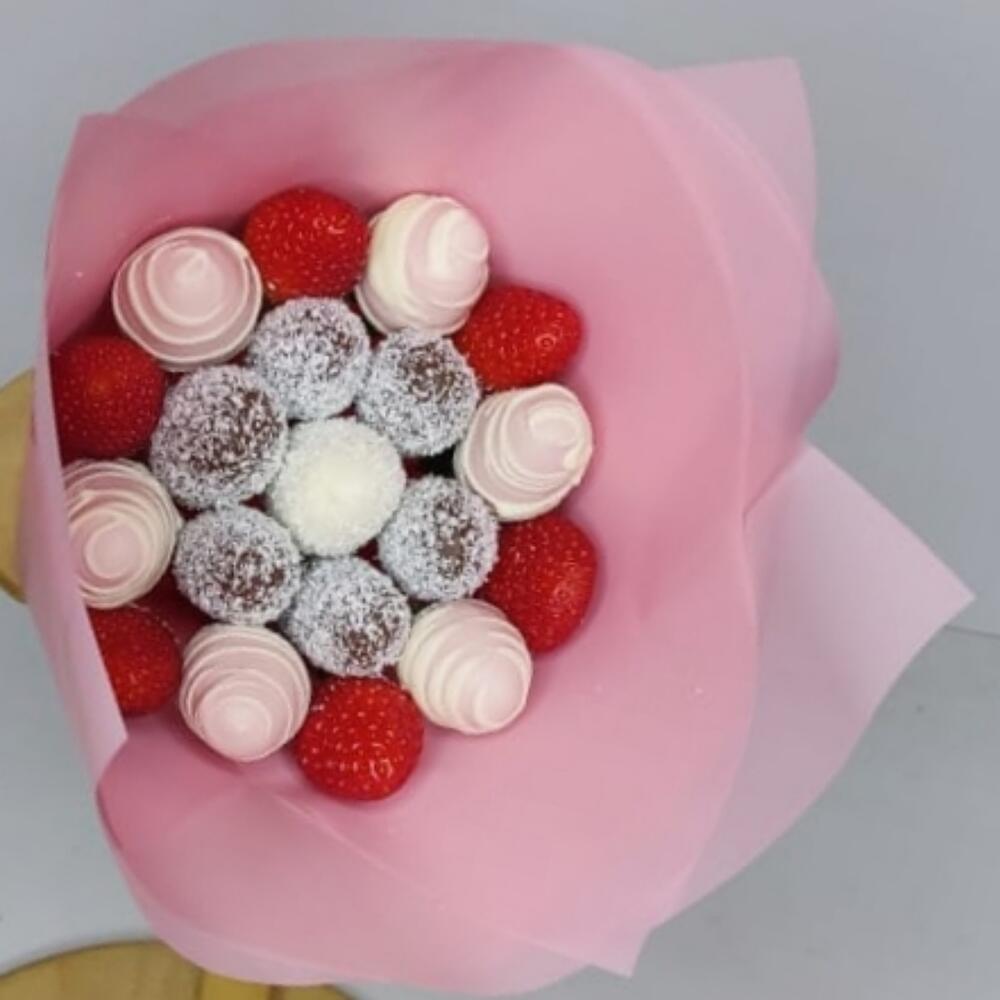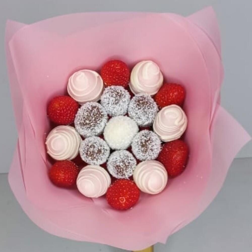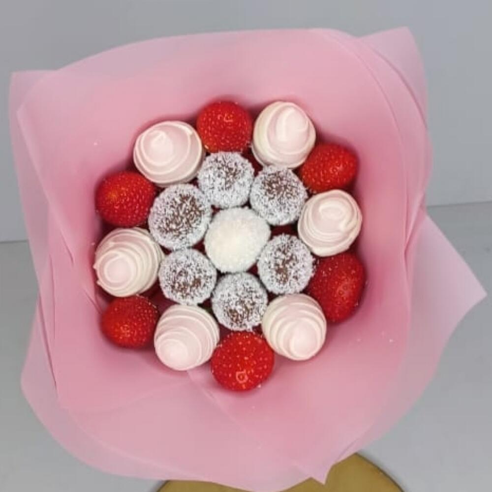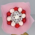 Упаковка - 1 шт. Лента атласная - 1 шт. Клубника в шоколаде - 13 шт. Шпажки деревянные - 19 шт. клубника свежая - 6 шт. декор: кокосовая стружка - 5 гр. упаковка защитная прозрачная - 1 шт.