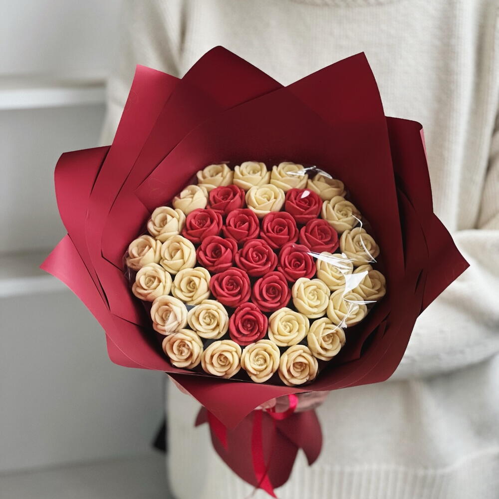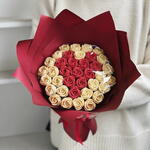 Изысканный букет «Сердце» из 37 роз в алой упаковке. Розы изготовлены из белого бельгийского шоколада. Вес одной розочки - 10-12гр, диаметр - 3 см. Идеальный вариант для того, чтобы признаться в своих чувствах.❤️ Срок хранения - 60 суток, хранить при комнатной температуре, вдали от солнечных лучей.