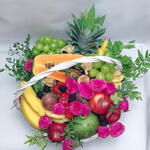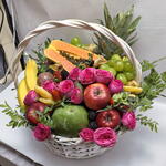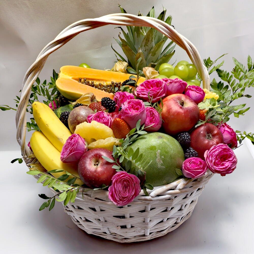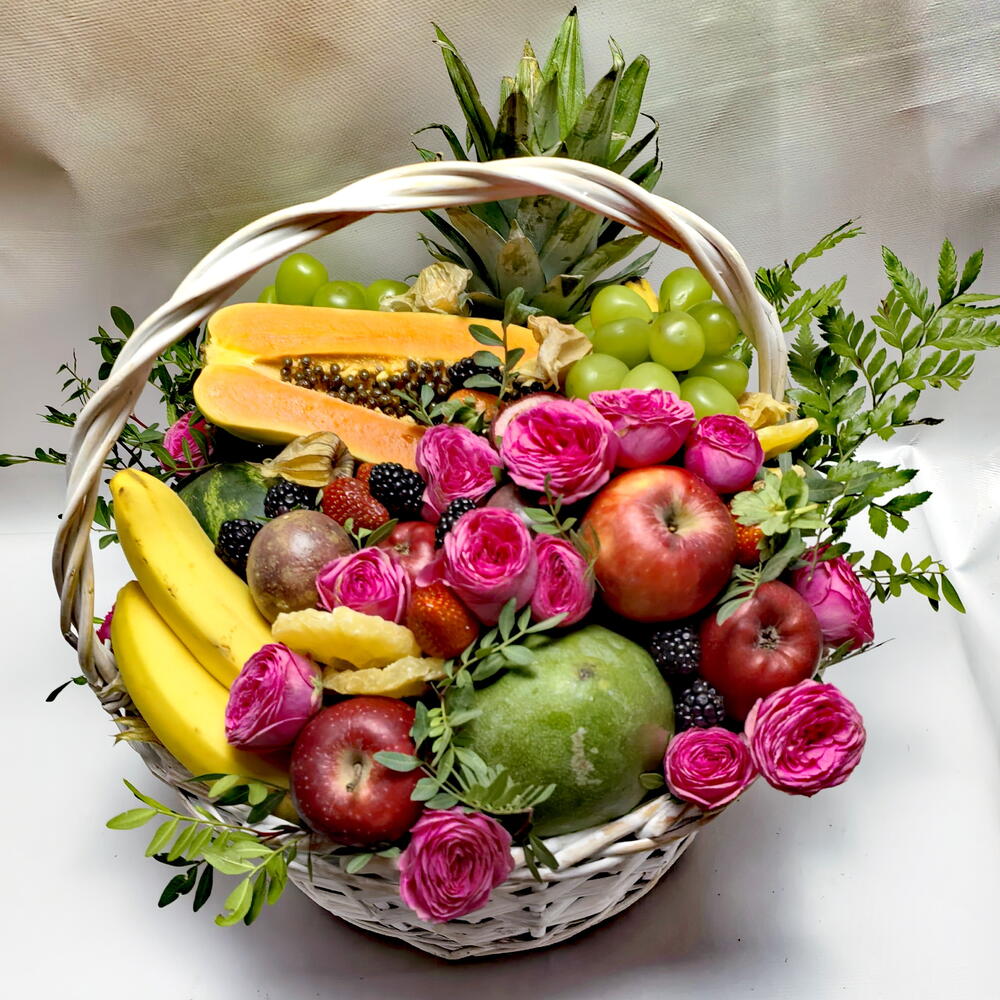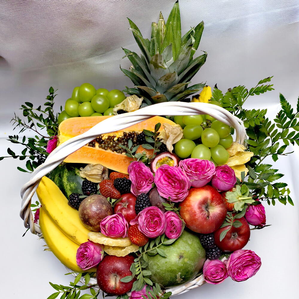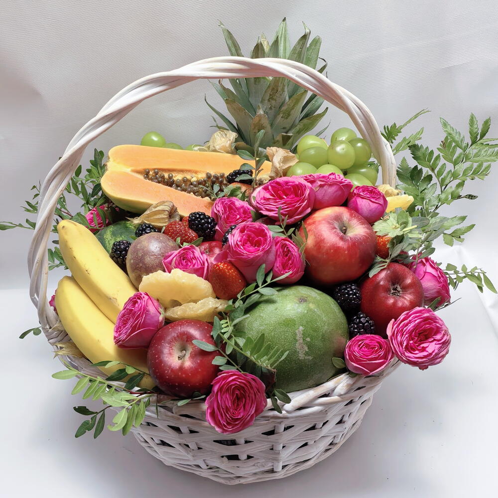 Корзина - 1 шт. Ананас - 1 шт. Ежевика - 125 гр. манго - 2 шт. Маракуйя - 2 шт. Папайя - 1 шт. Ананас сушеный - 4 шт. яблоко красное - 1000 гр. зелень писташ - 1 шт. бананы - 1500 гр. зелень папоротник - 1 шт. розы кустовые - 5 шт. виноград мускат - 1 шт.