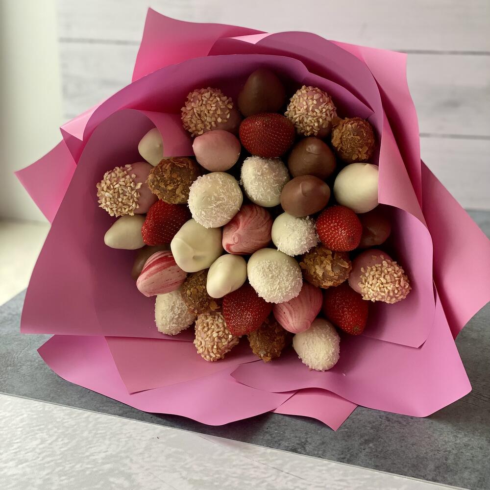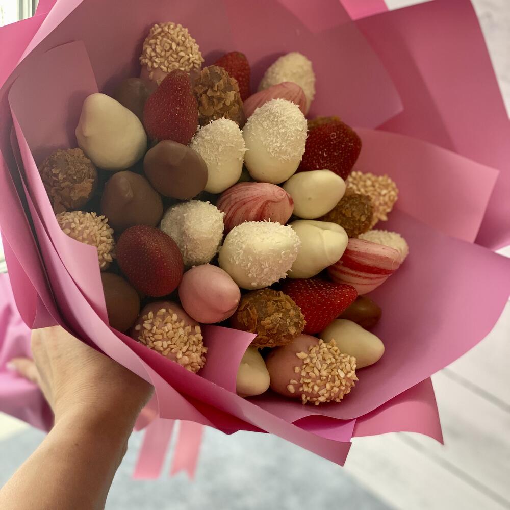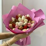 Букет из клубники в шоколаде — идеальный подарок для любимой Ищете оригинальный и вкусный подарок для девушки? Наш букет из клубники в шоколаде — это сочетание изысканности, нежности и сладкого удовольствия. Сочные ягоды, покрытые молочным, белым и розовым шоколадом, создают гармоничное сочетание вкусов и выглядят просто восхитительно! Этот десертный букет станет ярким украшением любого праздника и вызовет восторг у того, кому он предназначен. Подарите радость и сладкие эмоции с нашим букетом из клубники в шоколаде — беспроигрышный вариант для подарка любимой на день рождения, 8 марта, годовщину или просто без повода!