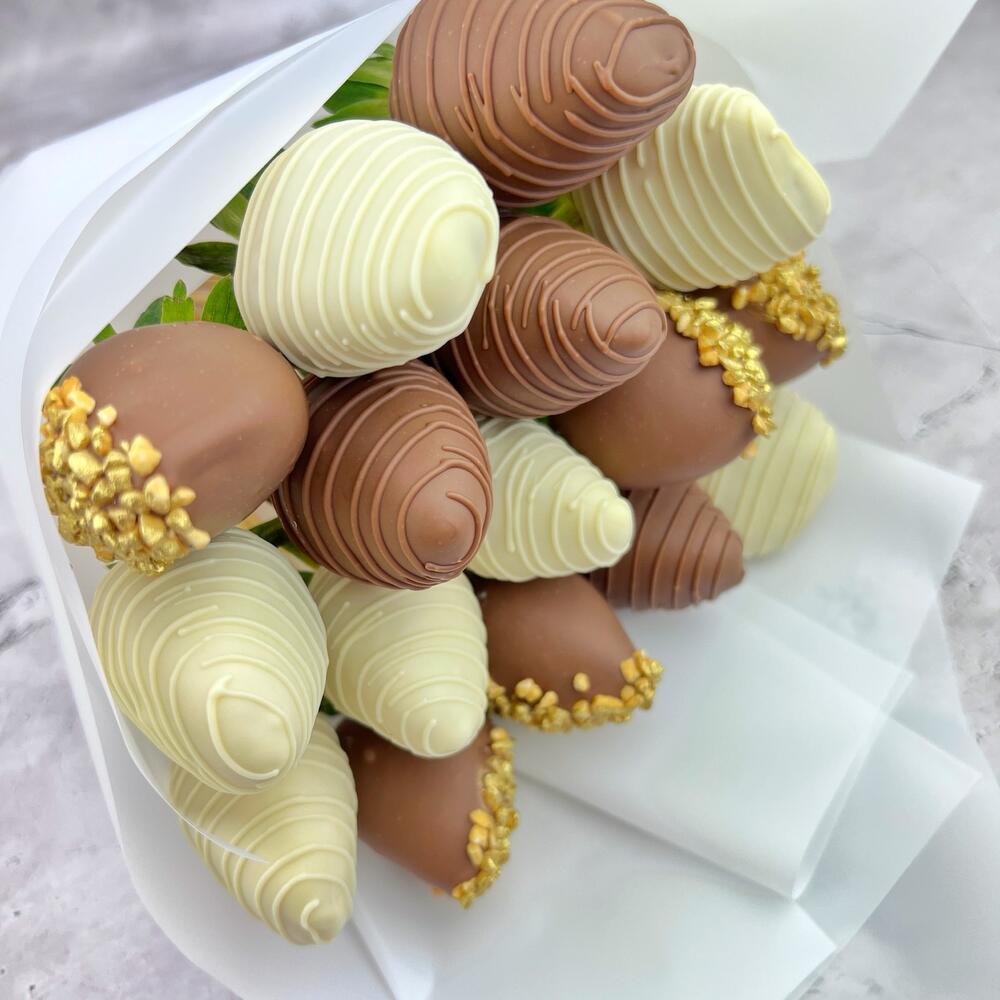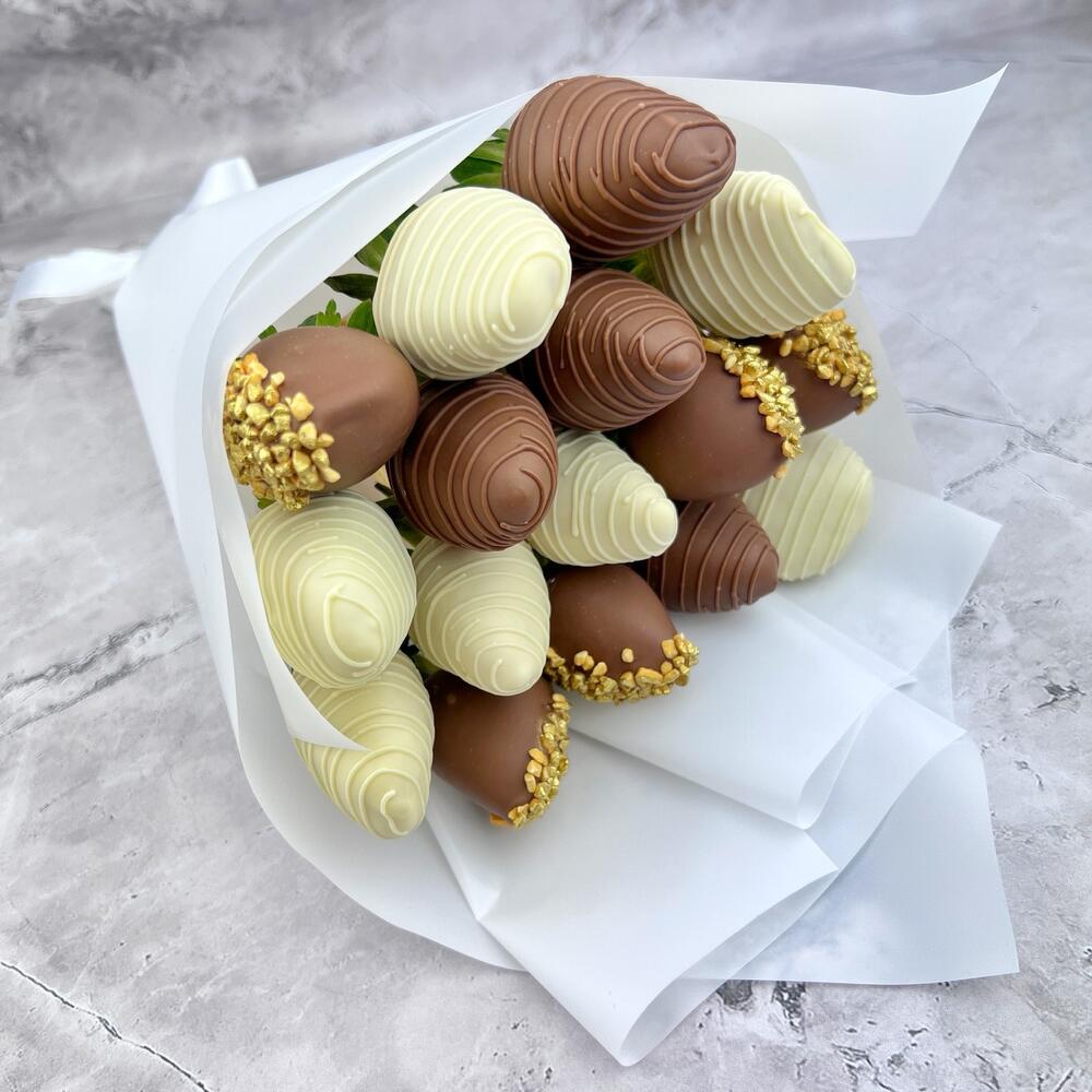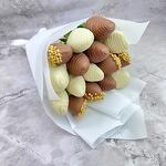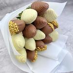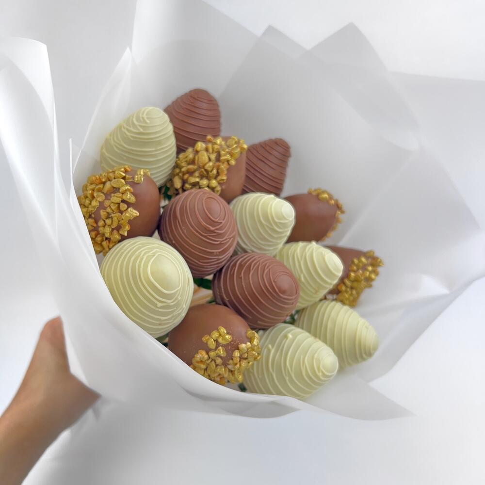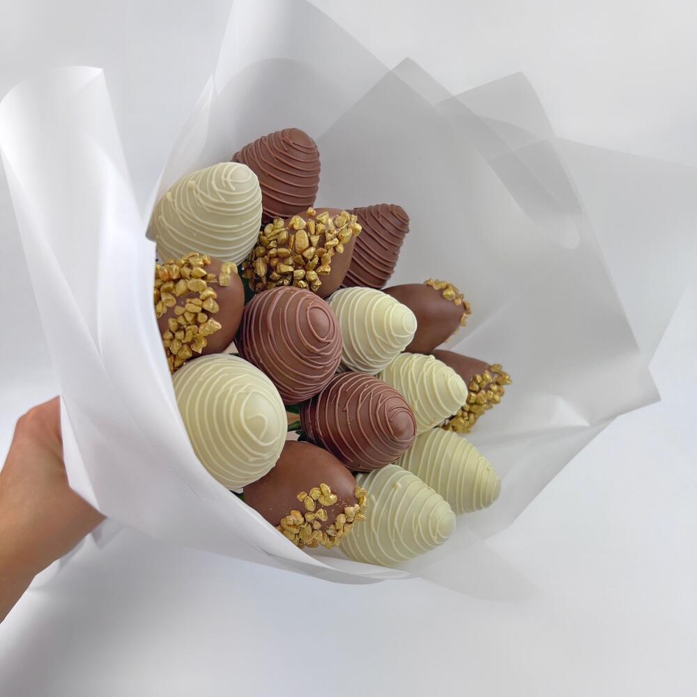 Состав позиции: Свежая клубника из 15 ягод Украшение: воздушный рис. Виды используемого шоколада: Callebaut(Бельгия) молочный и белый шоколад. Условия хранения: 24 часа, без попадания прямых солнечных лучей при относительной влажности воздуха не более 75% и температурного режима +2° — +15°. При комнатной температуре употребить в течении 12 часов. Упаковка: Сверху букет накрыт пищевой слюдой.