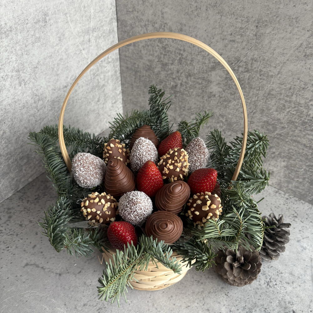 Чудесная праздничная композиция в корзине привнесет вместе с собой ощущение волшебства и таинственности