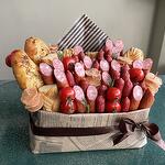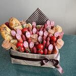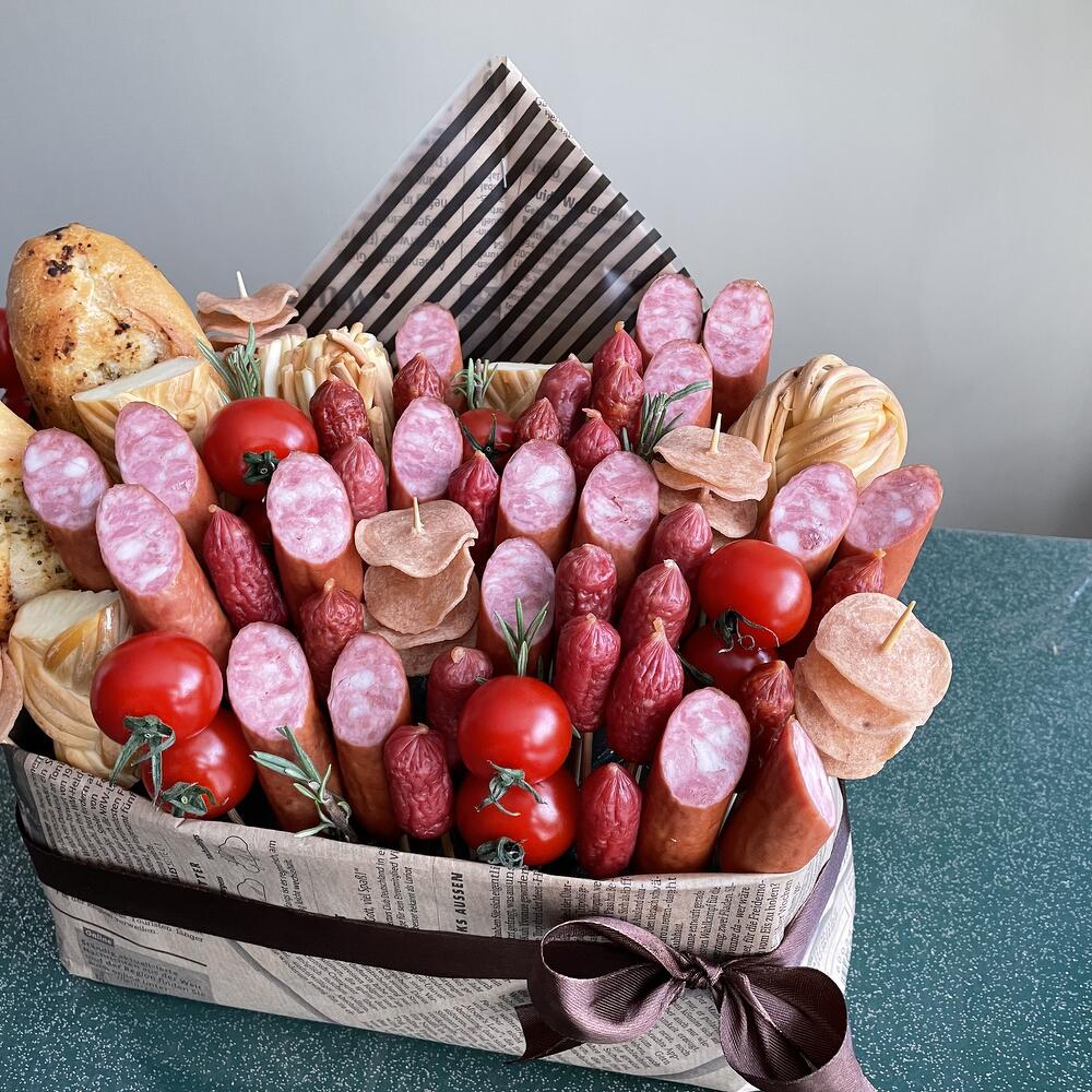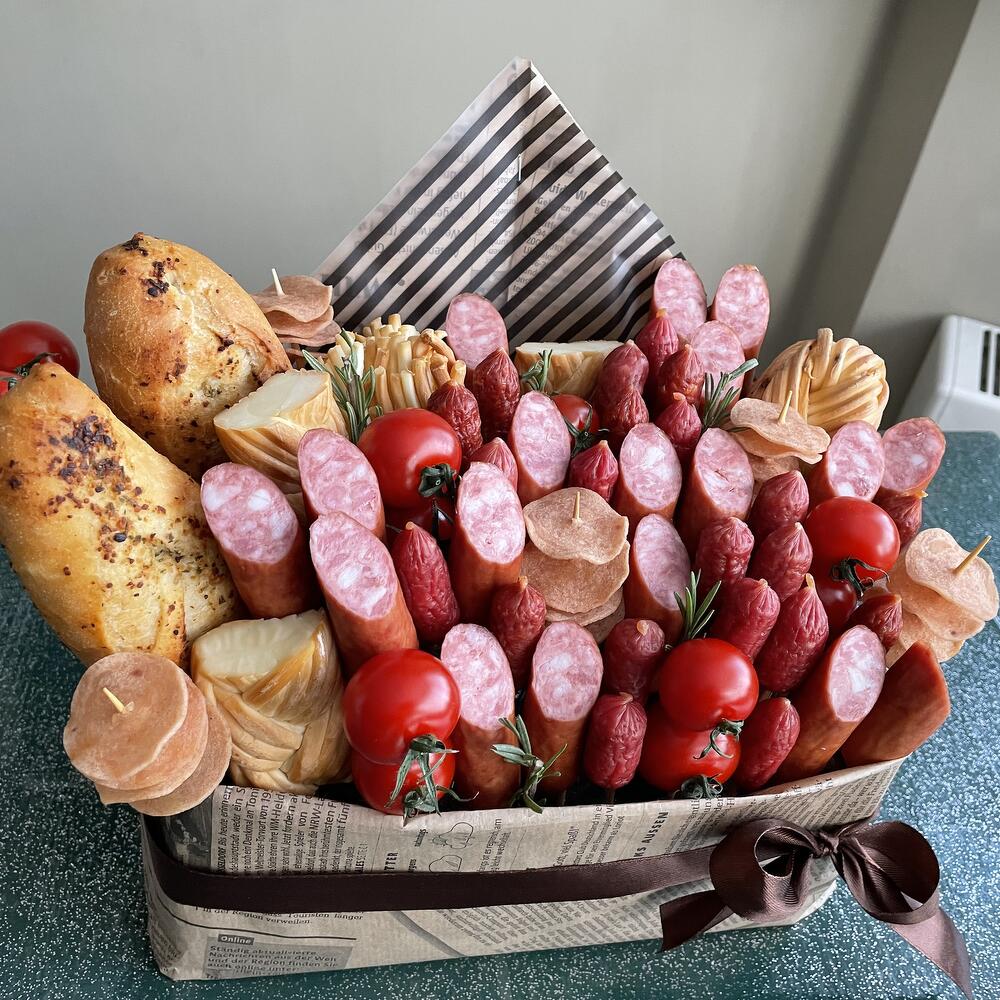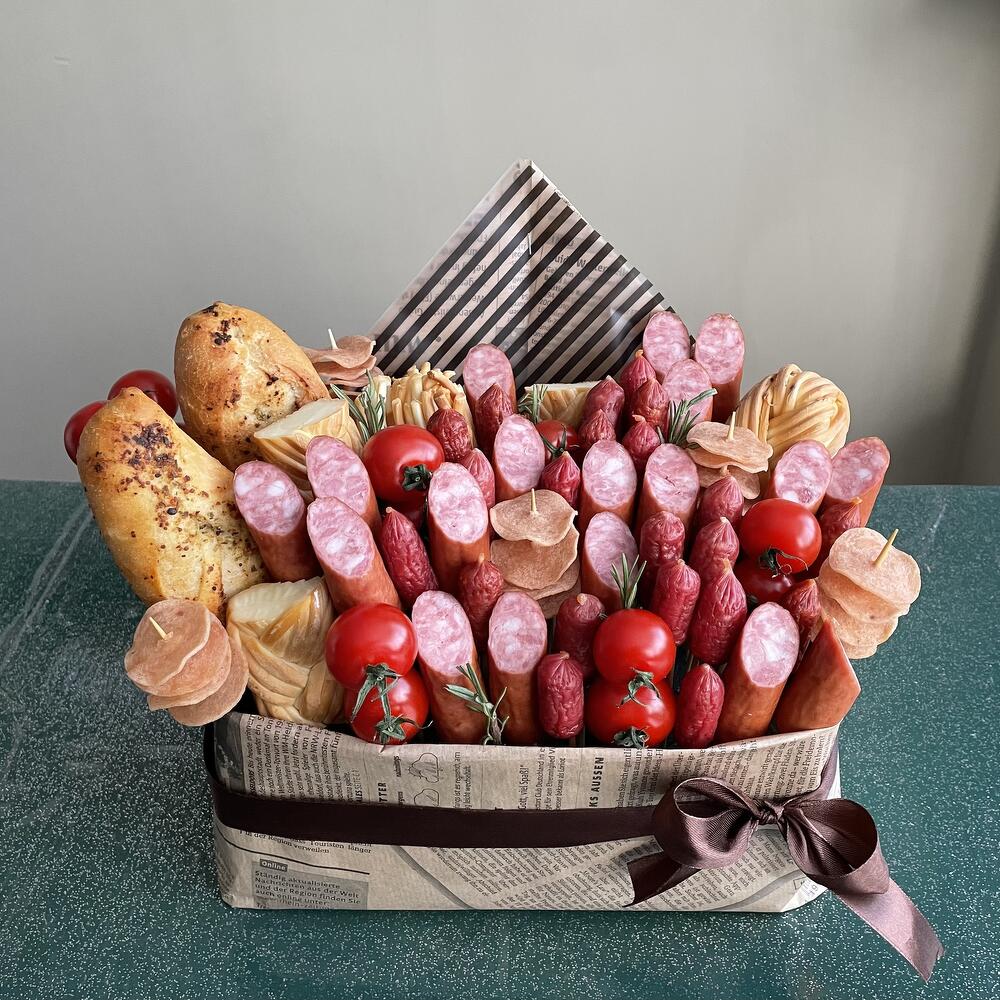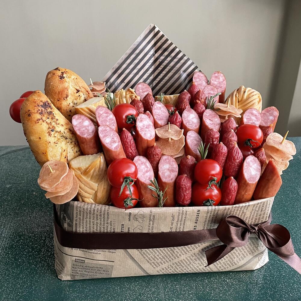 охотничьи колбаски упаковка - 1 шт. черри помидоры - 250 гр. багет чесночный - 1 шт. розмарин пучок - 1 шт. пиколини (упаковка) - 2 шт. косичка копченая - 2 шт. чипсы мясные упаковка - 1 шт.