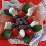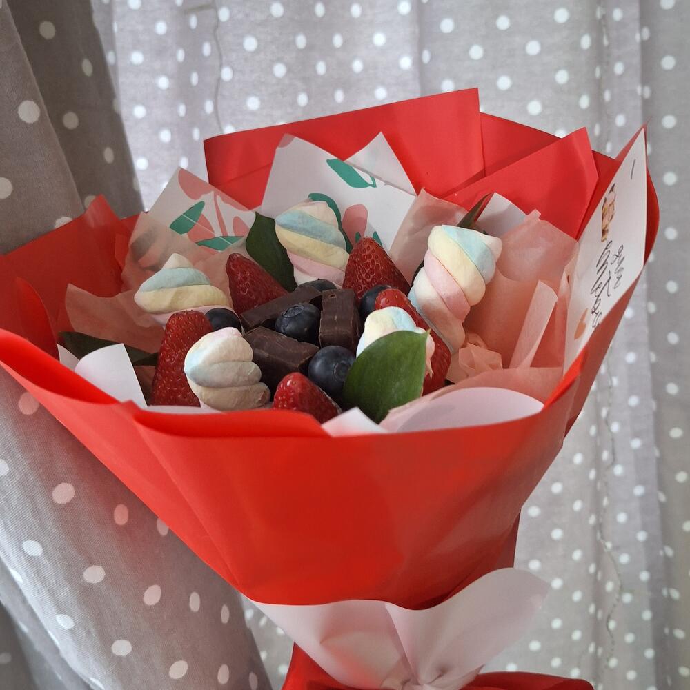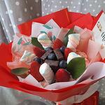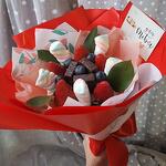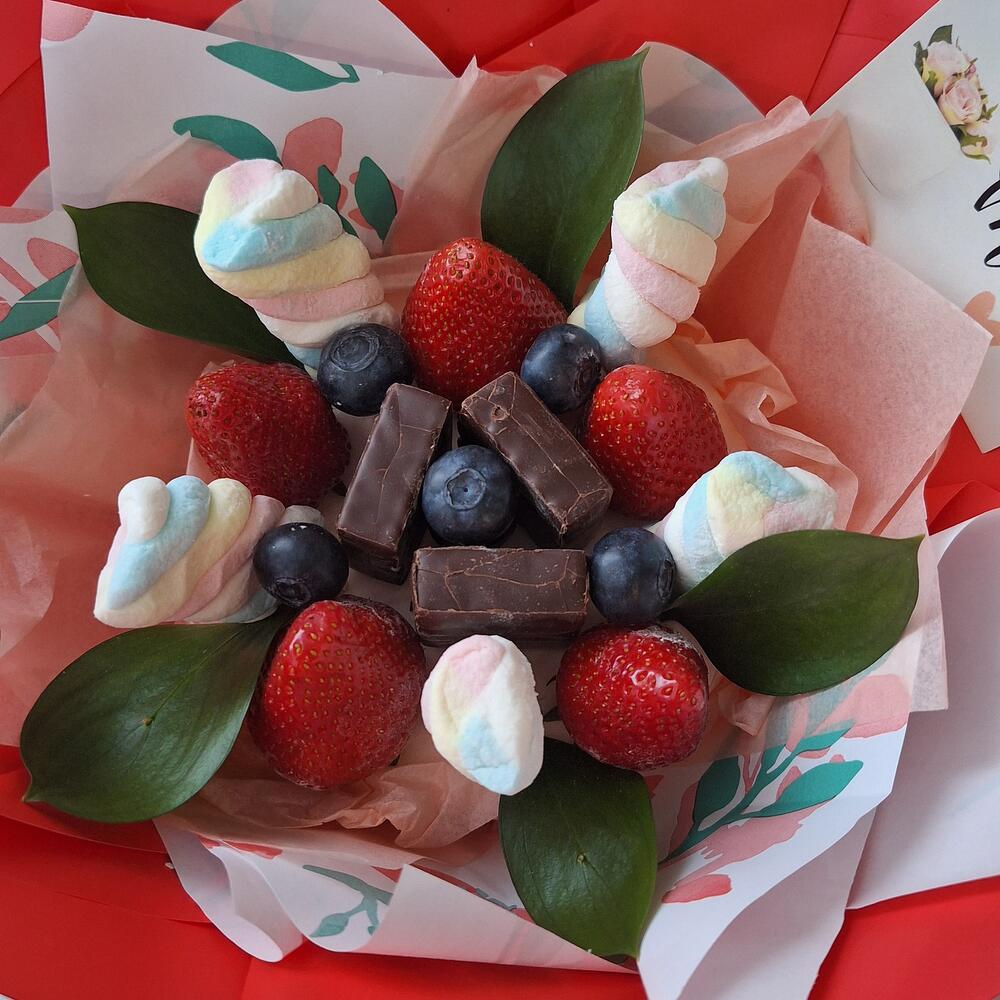 Небольшой ароматный букетик из свежих ягод и сладостей. Букет отправляется получателю под целлофановой упаковкой. Обратите внимание, что цвет упаковки может не совпадать с образцом