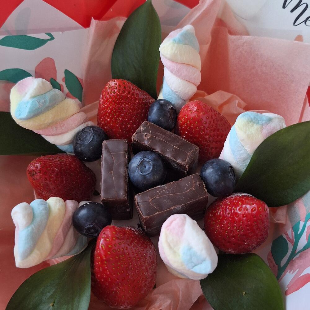 Голубика - 10 шт. Маршмеллоу - 5 шт. клубника свежая - 5 шт. птичье молоко в шоколаде - 3 шт. фисташка сухоцвет - 1 шт.