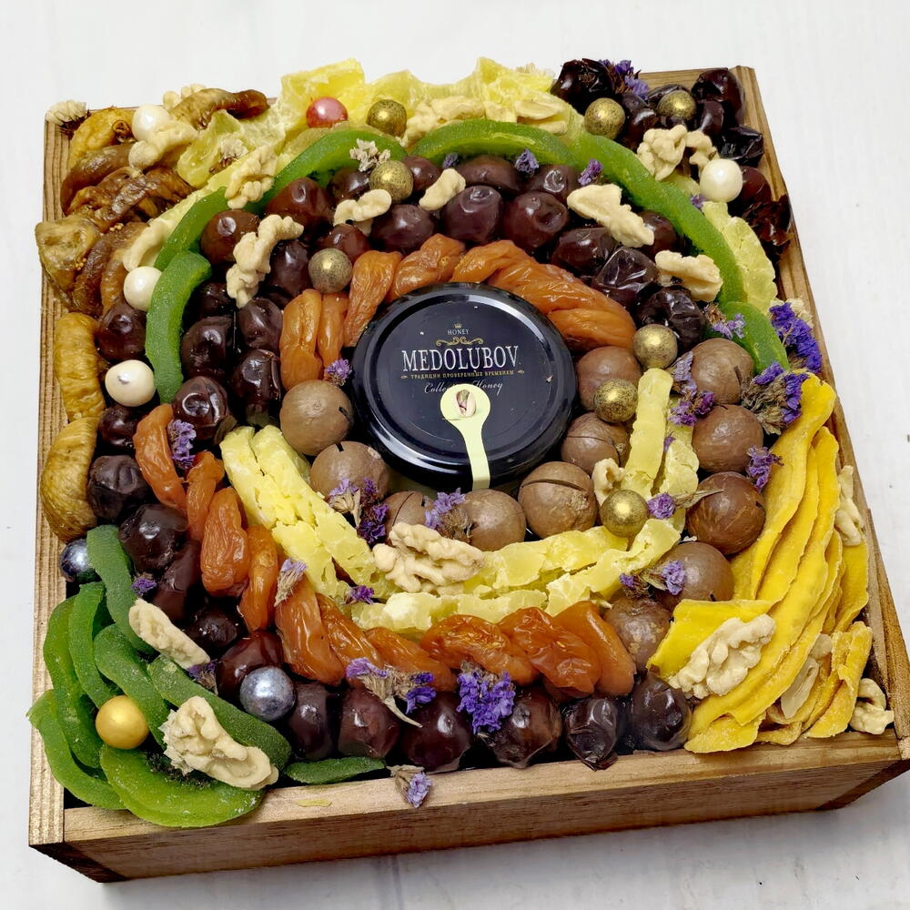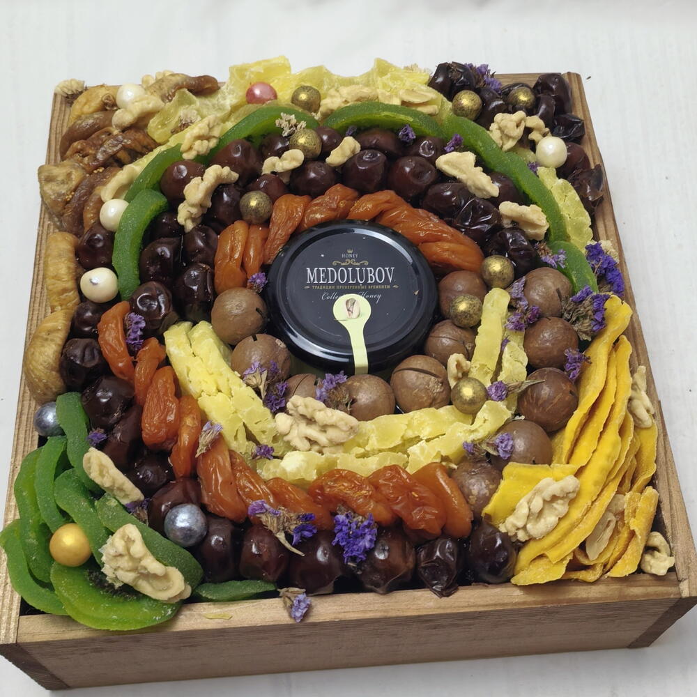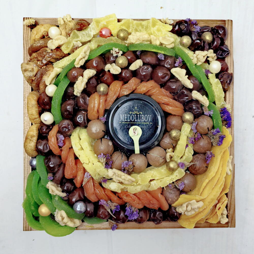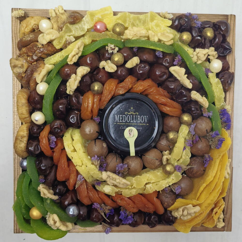 Статица - 1 шт. Ящик деревянный - 1 шт. Инжир - 150 гр. Мед суфле - 1 шт. Курага - 200 гр. Финики - 200 гр. Ананас сушеный - 100 гр. Манго сушеный - 100 гр. макадамия - 100 гр. киви сухофрукт - 200 гр. грецкий орех очищенный - 20 гр.